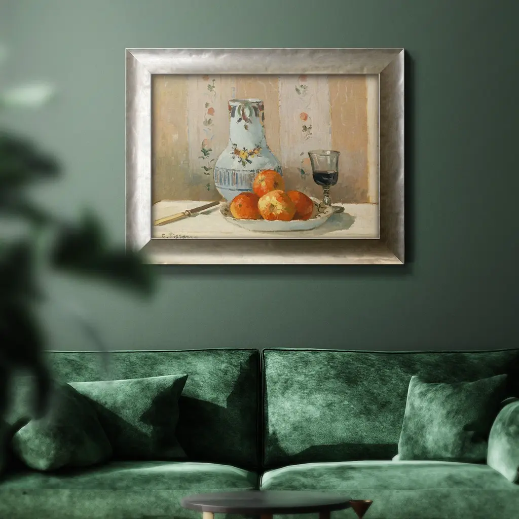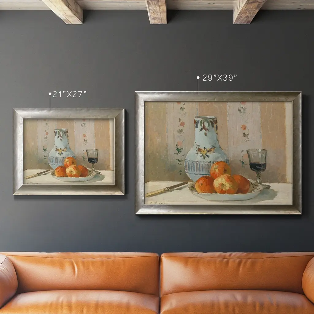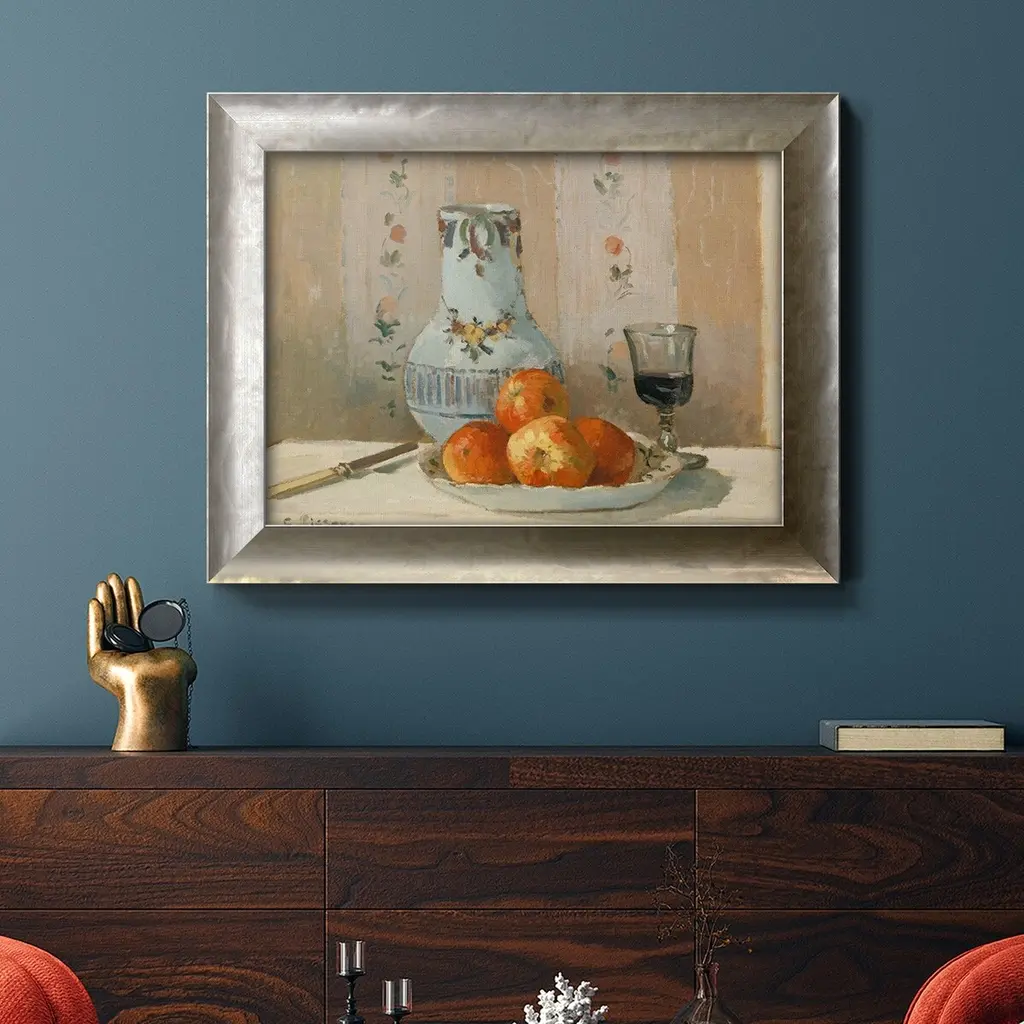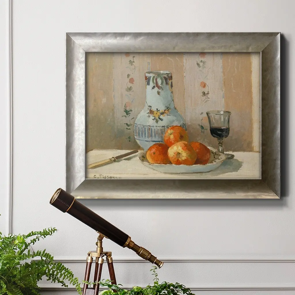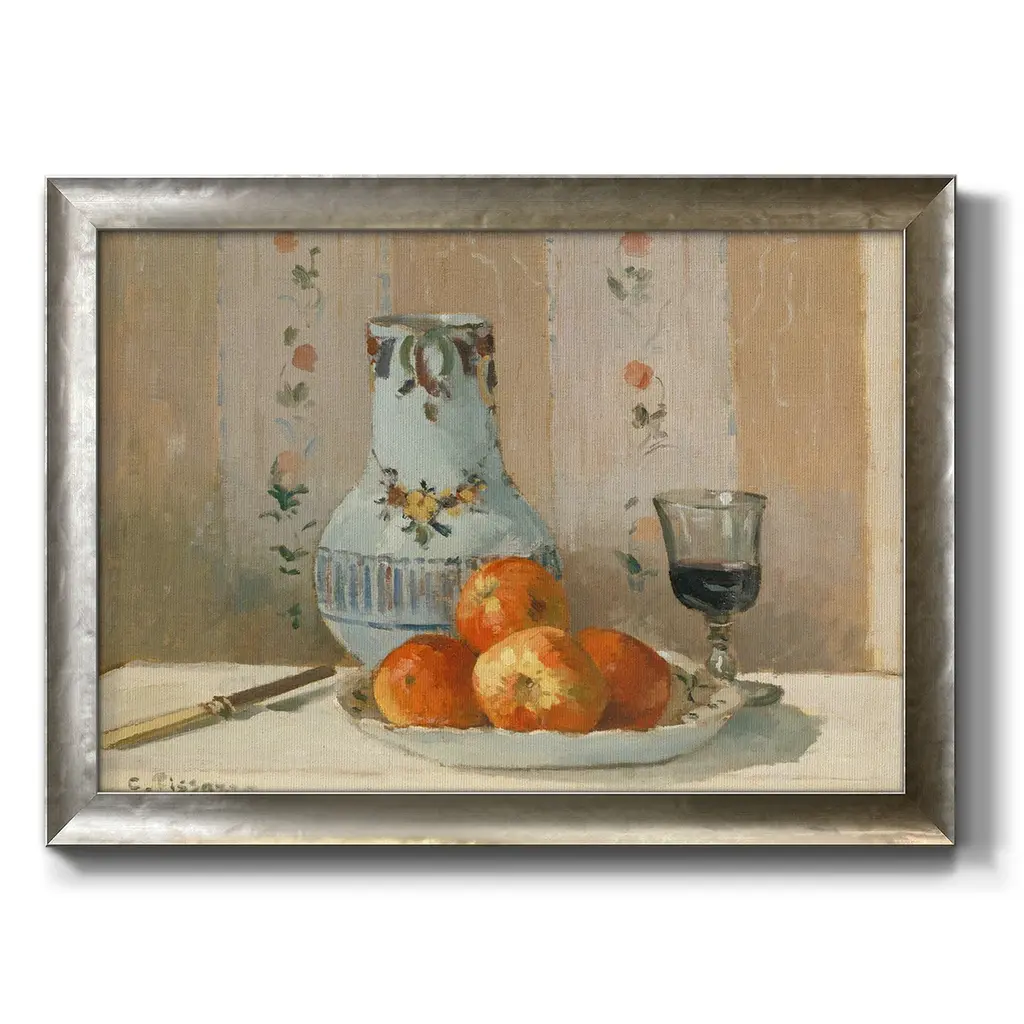 Still Life with Apples and Pitcher Premium Framed Canvas- Ready to Hang A Premium Framed Canvas created to last. Framed in distressed wood and available in an array of sizes and colors Featuring a beveled a solid wood stretcher bar, each piece comes ready to hand 3 SIZES AVAILABLE 16''X20'' - Overall Size 18'X27'' - Overall Size 24''x36'' - Overall Size Each piece is made to order. Each piece comes with hanging hardware. Made in the USA Ready to Hang Giclee Paper Print Acrylic Glass Beveled Matt Board
