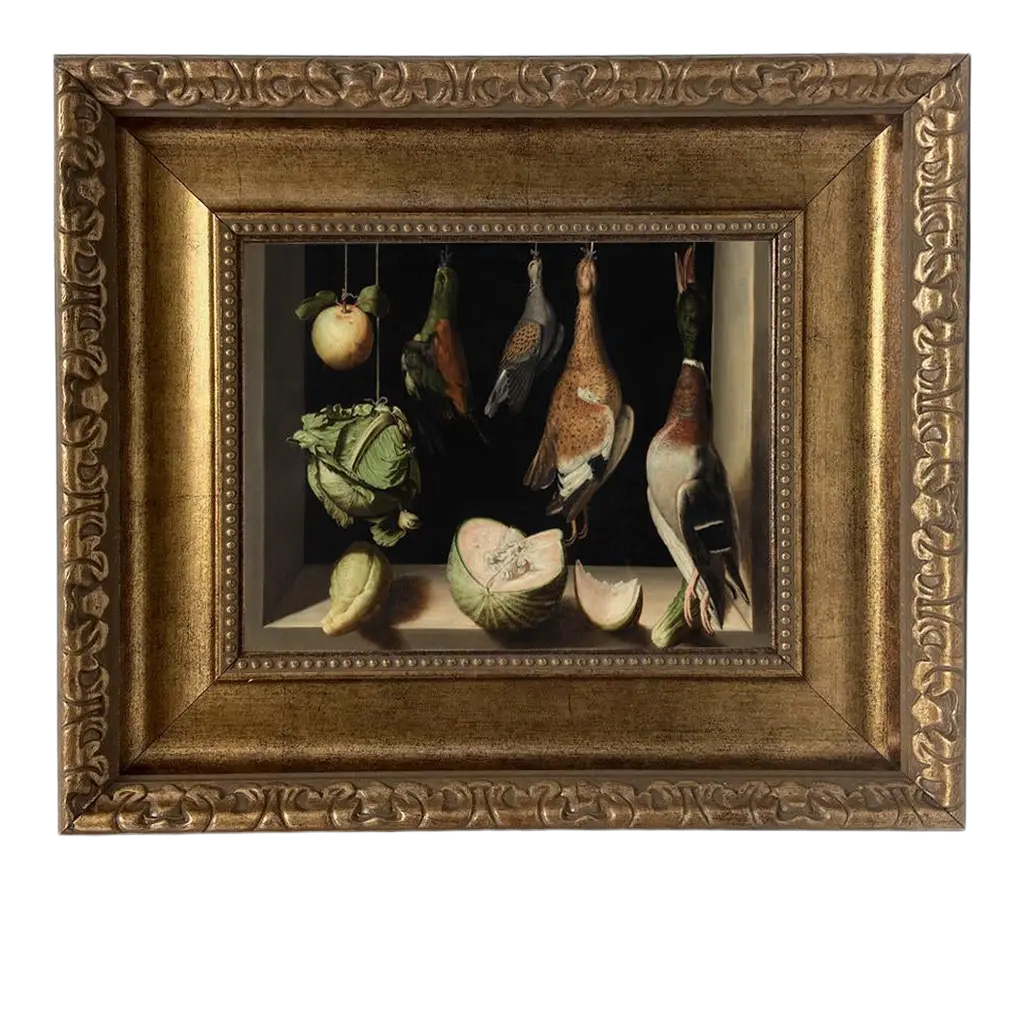 DESCRIPTION Accurately reproduced from the original work, this antiqued print reproduction of the Flemish still life, “Still Life with Artichokes, A Silver Gilt Wine Cistern, and Other Silver Objects” by Alexander Adriaenssen, is framed in the proper period, distressed-looking, Gold frame, constructed of solid composite wood with flush-mounted eye hooks and picture wire installed on back. DIMENSIONS Painting Dimensions (in): 20 x 16 Outside Frame Dimensions (in): 26 x 22" SHIPPING Will ship within 1-3 business days.