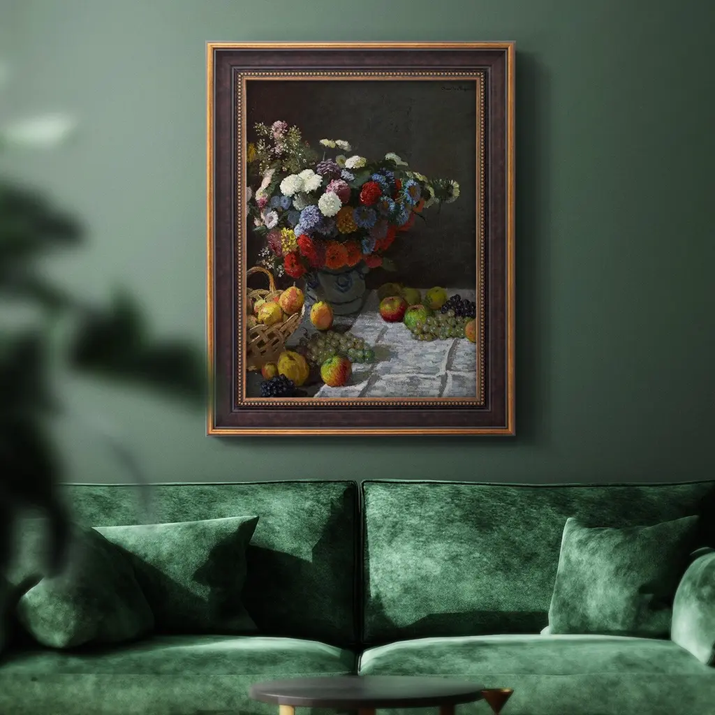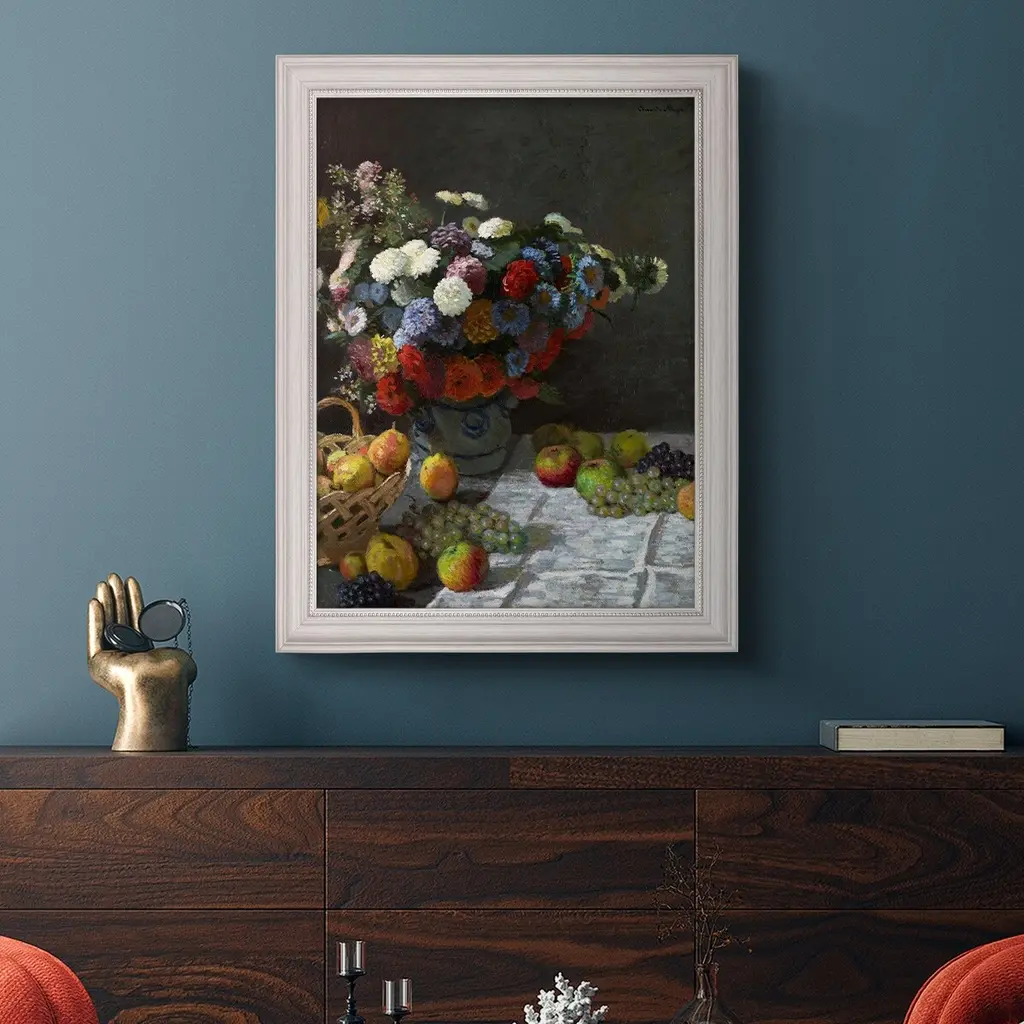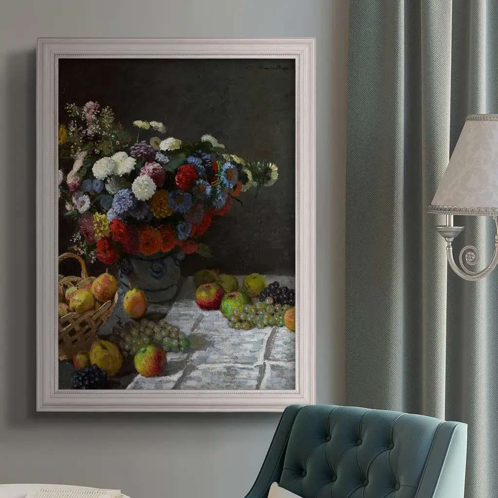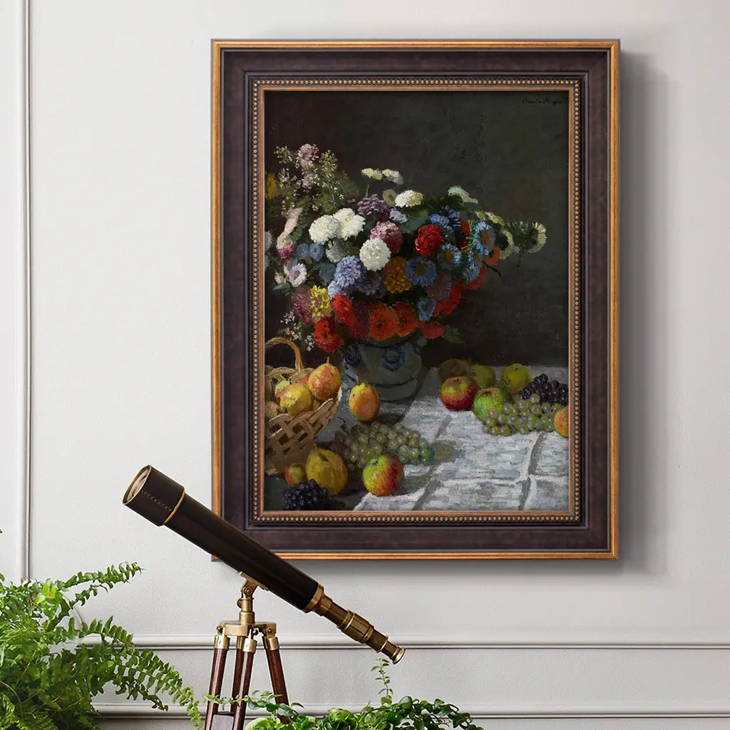 Still Life With Flowers & Fruit Art Prin Premium Framed Canvas- Ready to Hang A Premium Framed Canvas created to last. Framed in distressed wood and available in an array of sizes and colors Featuring a beveled a solid wood stretcher bar, each piece comes ready to hand 3 SIZES AVAILABLE 16''X20'' - Overall Size 18'X27'' - Overall Size 24''x36'' - Overall Size Each piece is made to order. Each piece comes with hanging hardware. Made in the USA Ready to Hang Giclee Paper Print Acrylic Glass Beveled Matt Board