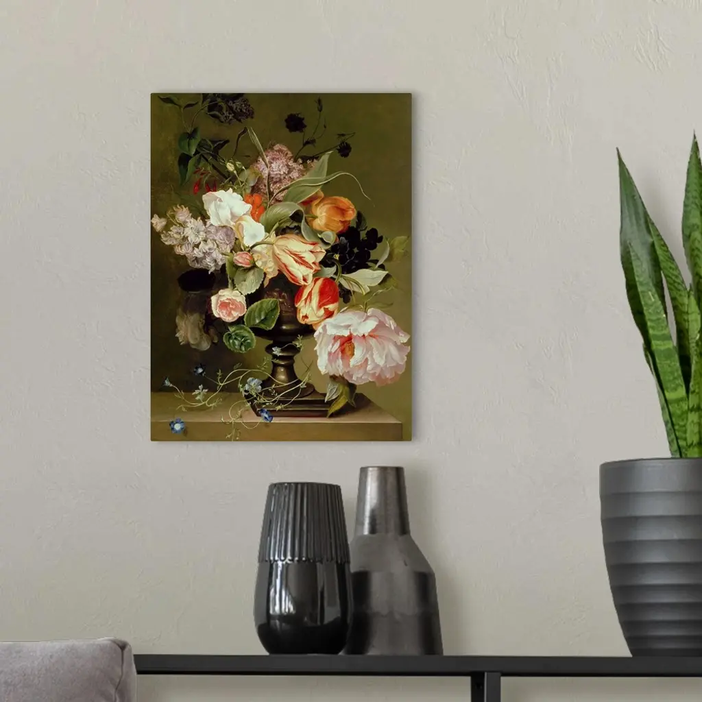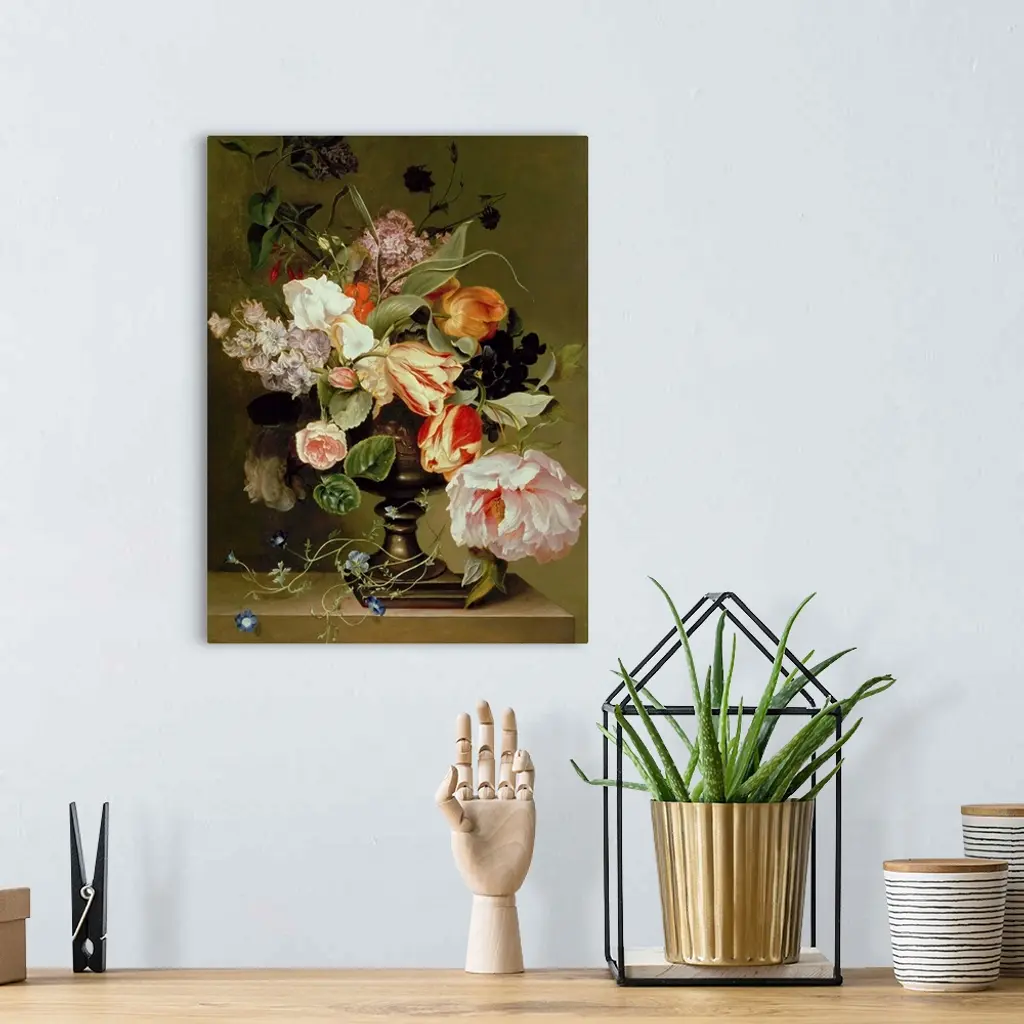 Portrait artwork on a large canvas of a floral still life. Numerous types of lowers and leaves hang over a large vase sitting on a ledge, against a dark background.
