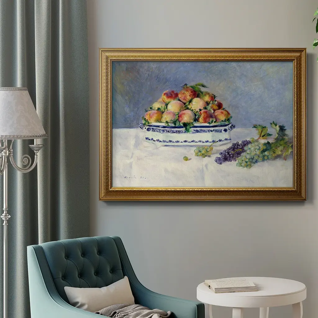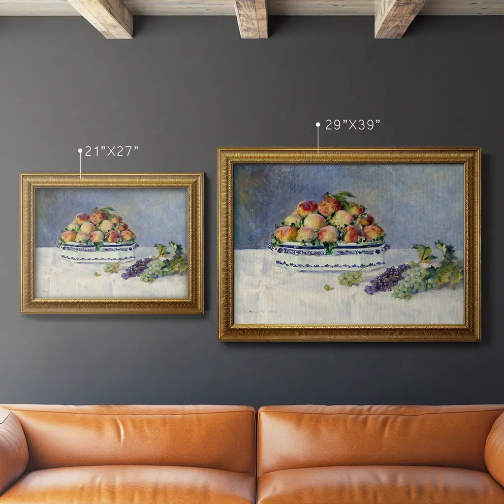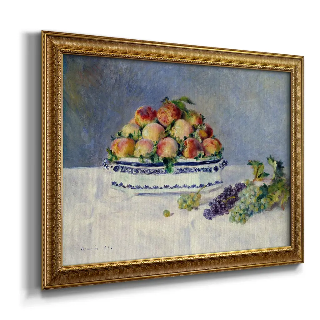 Still Life with Peaches and Grapes Premium Framed Canvas- Ready to Hang A Premium Framed Canvas created to last. Framed in distressed wood and available in an array of sizes and colors Featuring a beveled a solid wood stretcher bar, each piece comes ready to hand 3 SIZES AVAILABLE 16''X20'' - Overall Size 18'X27'' - Overall Size 24''x36'' - Overall Size Each piece is made to order. Each piece comes with hanging hardware. Made in the USA Ready to Hang Giclee Paper Print Acrylic Glass Beveled Matt Board