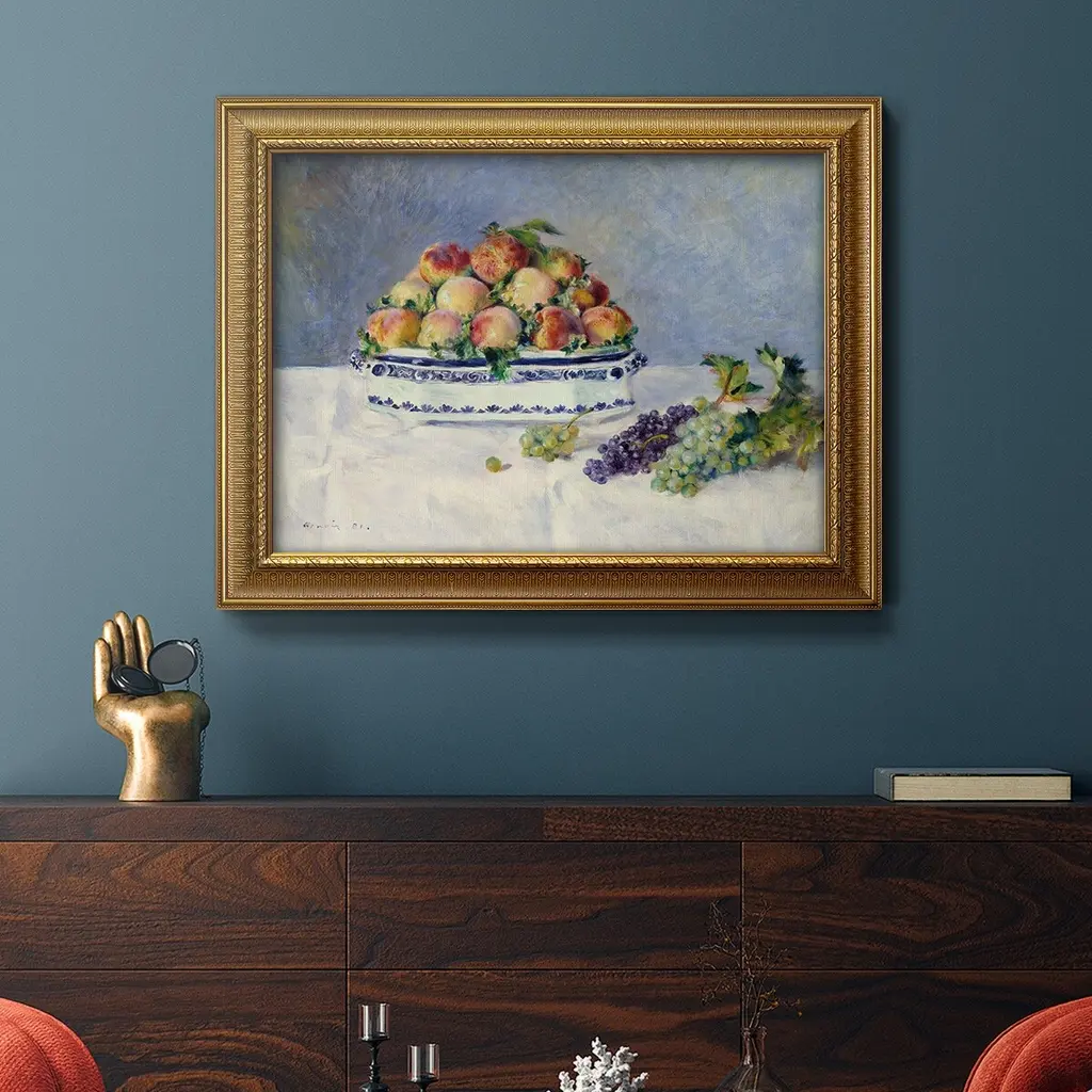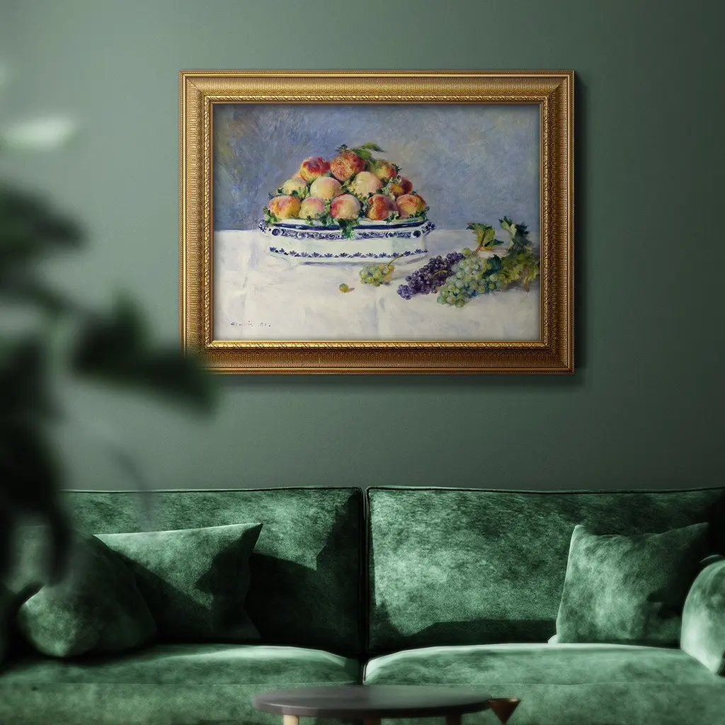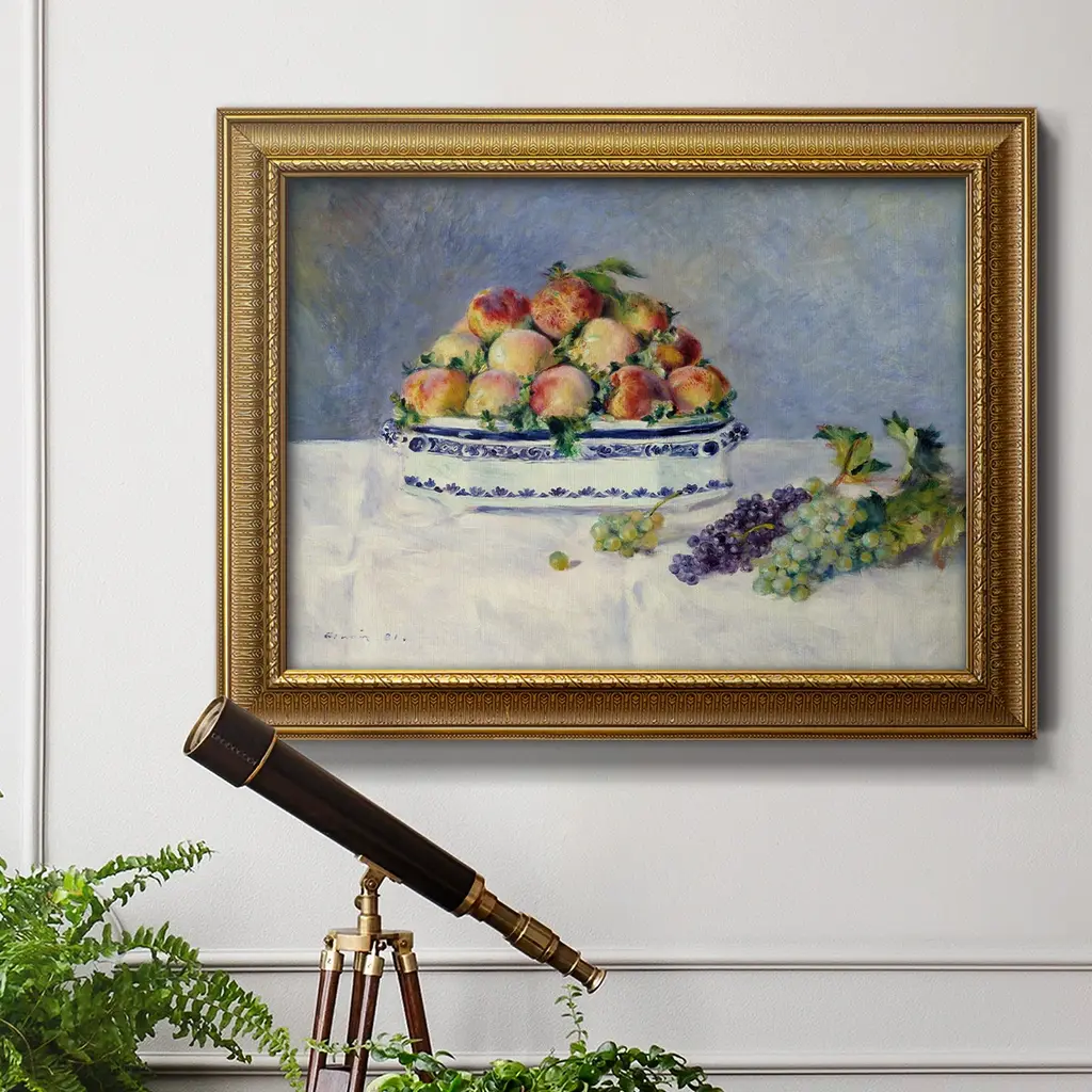 Still Life with Peaches and Grapes Premium Framed Canvas- Ready to Hang A Premium Framed Canvas created to last. Framed in distressed wood and available in an array of sizes and colors Featuring a beveled a solid wood stretcher bar, each piece comes ready to hand 3 SIZES AVAILABLE 16''X20'' - Overall Size 18'X27'' - Overall Size 24''x36'' - Overall Size Each piece is made to order. Each piece comes with hanging hardware. Made in the USA Ready to Hang Giclee Paper Print Acrylic Glass Beveled Matt Board