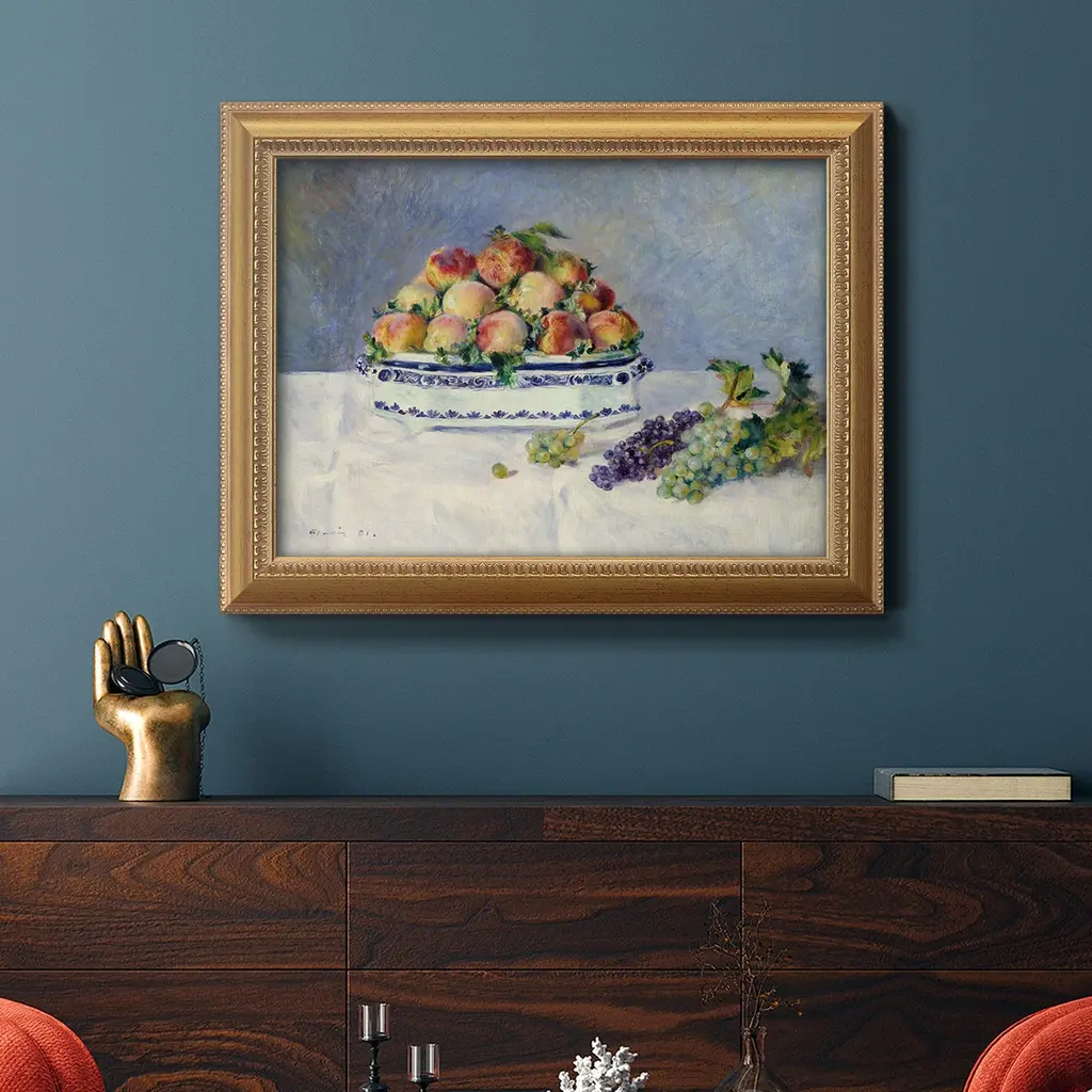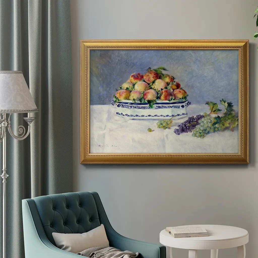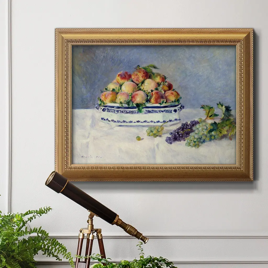 Still Life with Peaches and Grapes Premium Framed Canvas- Ready to Hang A Premium Framed Canvas created to last. Framed in distressed wood and available in an array of sizes and colors Featuring a beveled a solid wood stretcher bar, each piece comes ready to hand 3 SIZES AVAILABLE 16''X20'' - Overall Size 18'X27'' - Overall Size 24''x36'' - Overall Size Each piece is made to order. Each piece comes with hanging hardware. Made in the USA Ready to Hang Giclee Paper Print Acrylic Glass Beveled Matt Board