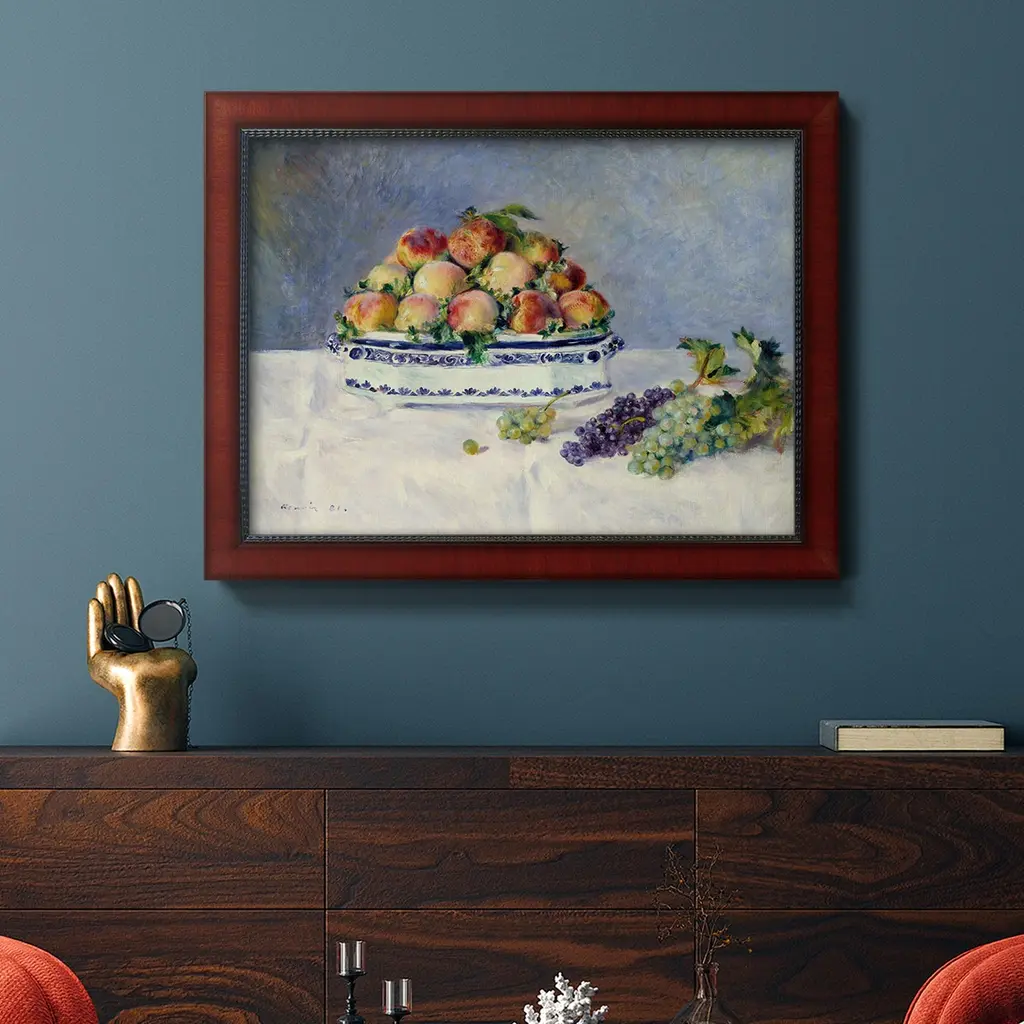 Still Life with Peaches and Grapes Premium Framed Canvas- Ready to Hang A Premium Framed Canvas created to last. Framed in distressed wood and available in an array of sizes and colors Featuring a beveled a solid wood stretcher bar, each piece comes ready to hand 3 SIZES AVAILABLE 16''X20'' - Overall Size 18'X27'' - Overall Size 24''x36'' - Overall Size Each piece is made to order. Each piece comes with hanging hardware. Made in the USA Ready to Hang Giclee Paper Print Acrylic Glass Beveled Matt Board