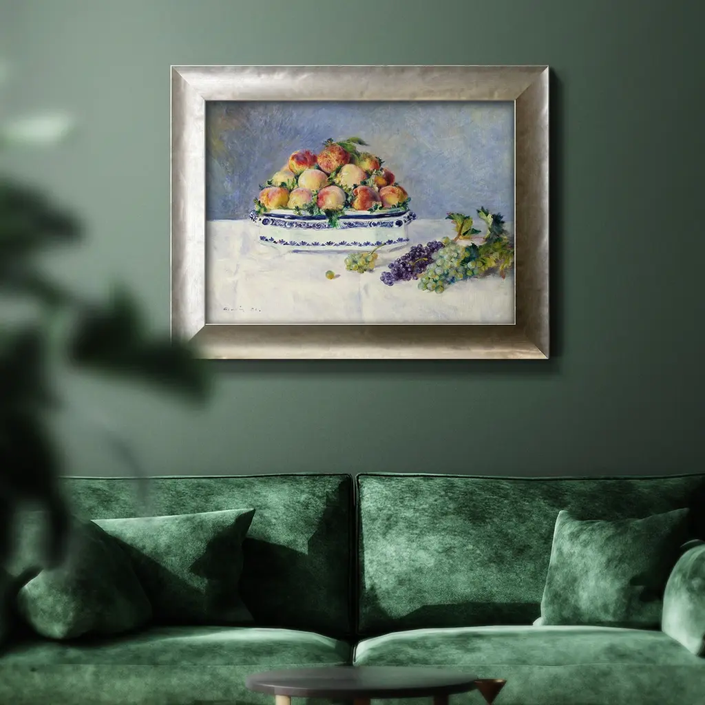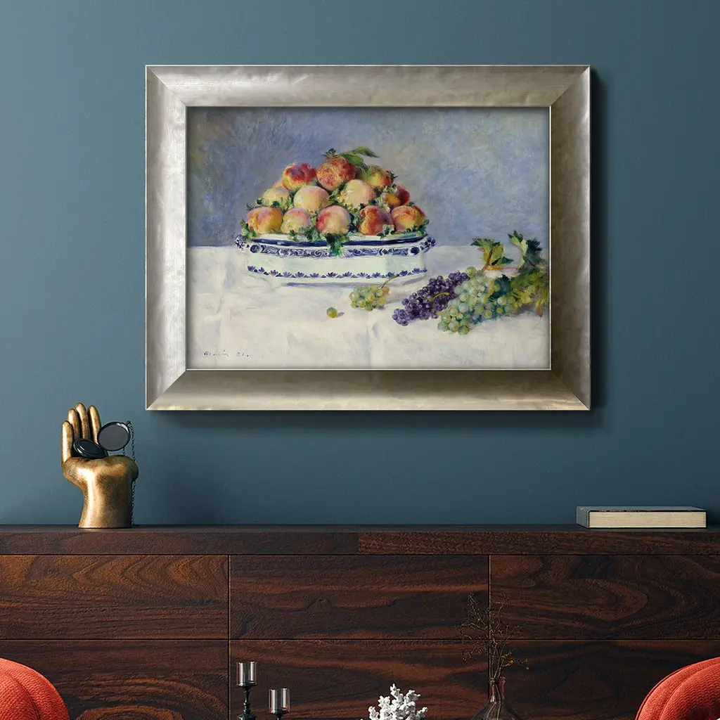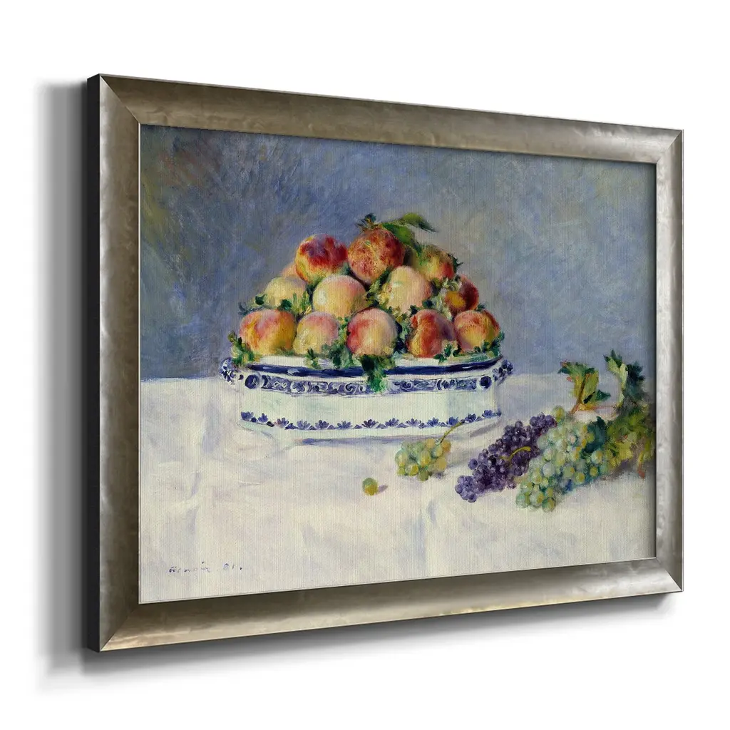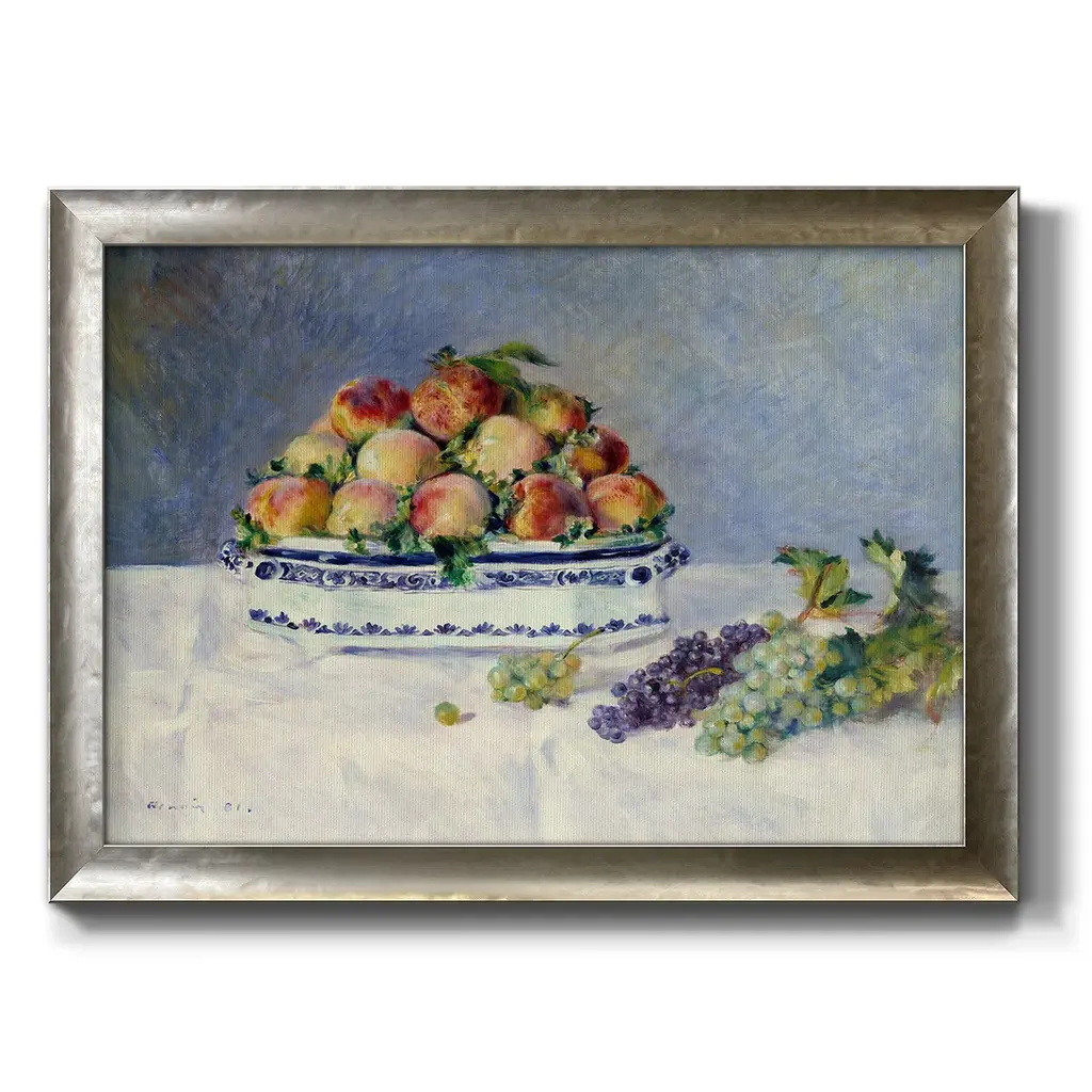 Still Life with Peaches and Grapes Premium Framed Canvas- Ready to Hang A Premium Framed Canvas created to last. Framed in distressed wood and available in an array of sizes and colors Featuring a beveled a solid wood stretcher bar, each piece comes ready to hand 3 SIZES AVAILABLE 16''X20'' - Overall Size 18'X27'' - Overall Size 24''x36'' - Overall Size Each piece is made to order. Each piece comes with hanging hardware. Made in the USA Ready to Hang Giclee Paper Print Acrylic Glass Beveled Matt Board