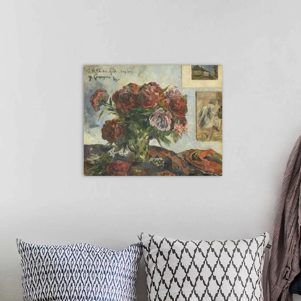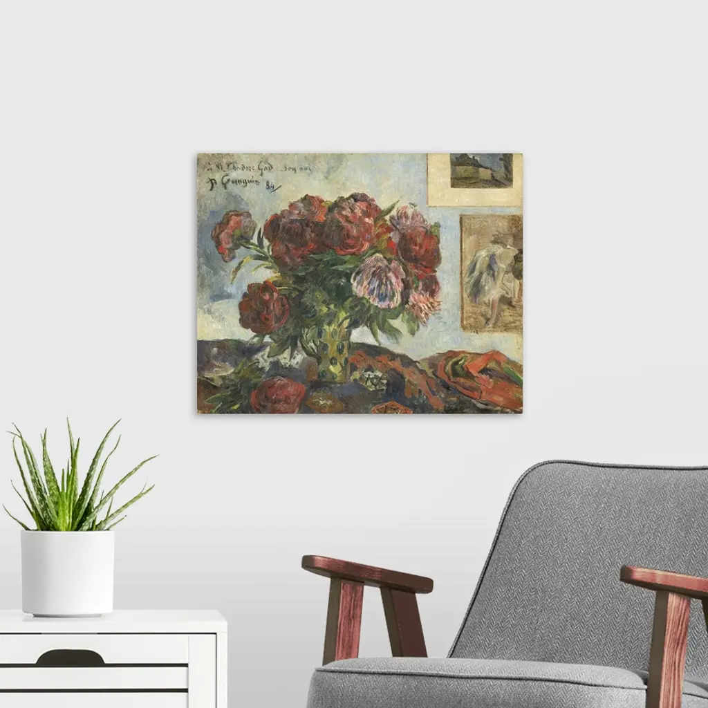 Still Life with Peonies, by Paul Gauguin, 1884, French Post-Impressionist painting, oil on canvas. This work was painted two years after Gauguin became a full time artist. He developed an impressionist style while working as a stockbroker. Pissarro and Ed