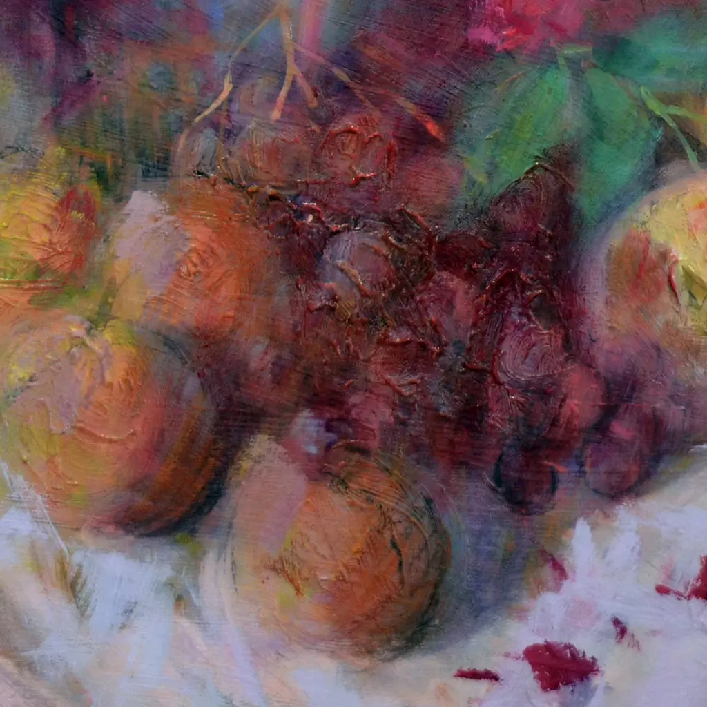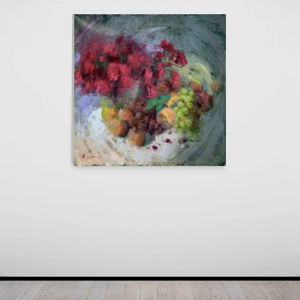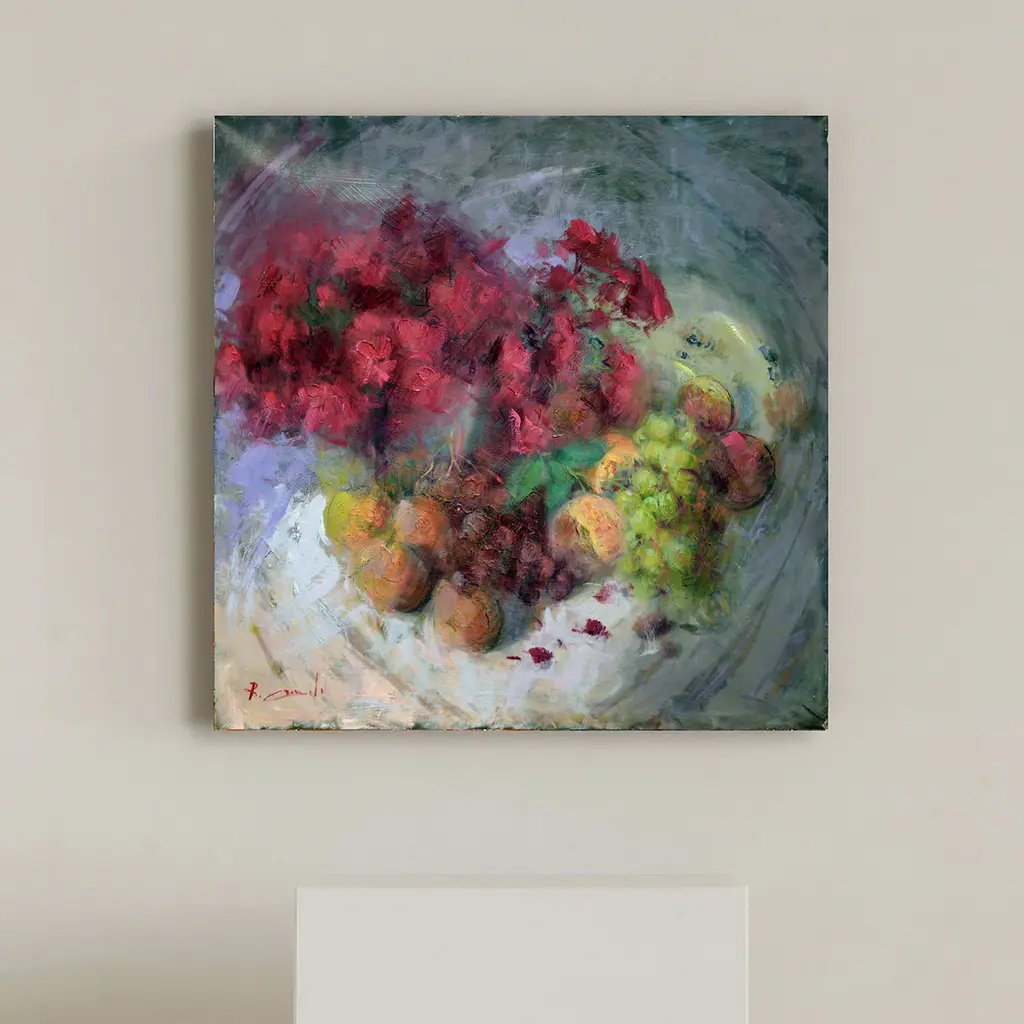 "Still Life with Red Flowers" by Renato Criscuolo is an exquisite oil on canvas capturing vibrant colors and dynamic composition typical of the artist's style. It features a lush arrangement of red flowers and ripe fruits, rendered with Criscuolo's signature brushstrokes and rich palette, exuding life and vitality. Renato Criscuolo is known for his ability to transform everyday scenes into profound visual narratives. This painting is sold unframed, but a frame can be ordered upon request. The artwork is delivered with a certificate of authenticity.