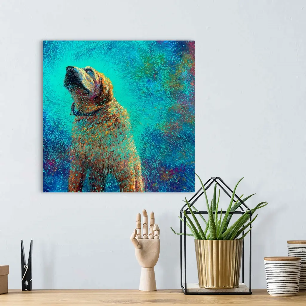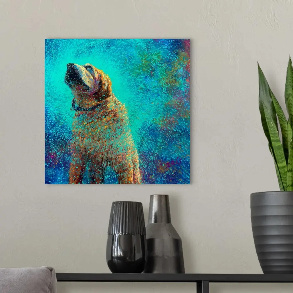 Brightly colored contemporary artwork of a tan dog shaking off water.
