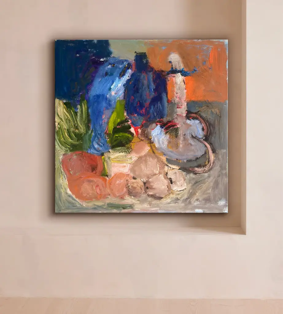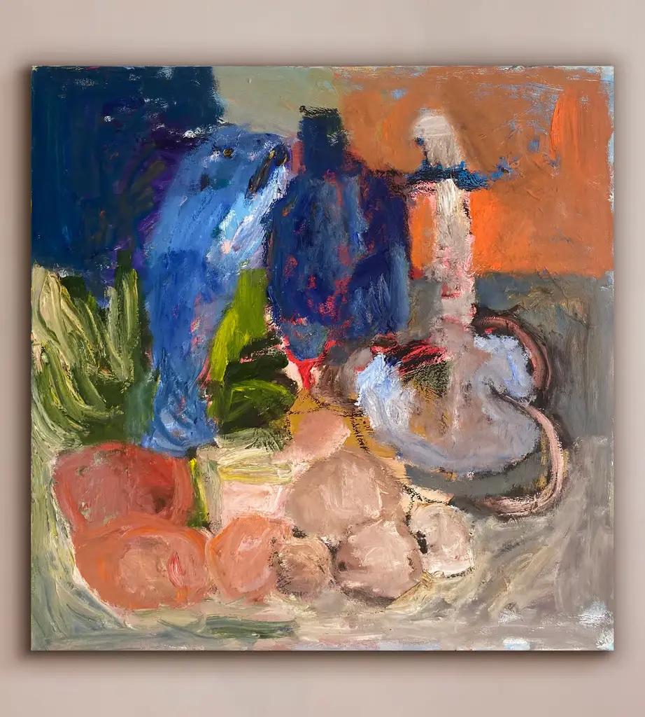An original still life oil painting based on objects placed into an order by the artist, who calls the order 'another combination of mess'. Austrian artist Barbara Kuebel has shown her work extensively throughout Europe and the US. Inspired by 'awkward social interactions', she creates abstract expressionist figurative portraits rendered as life-sized woodworks that she carves by hand.