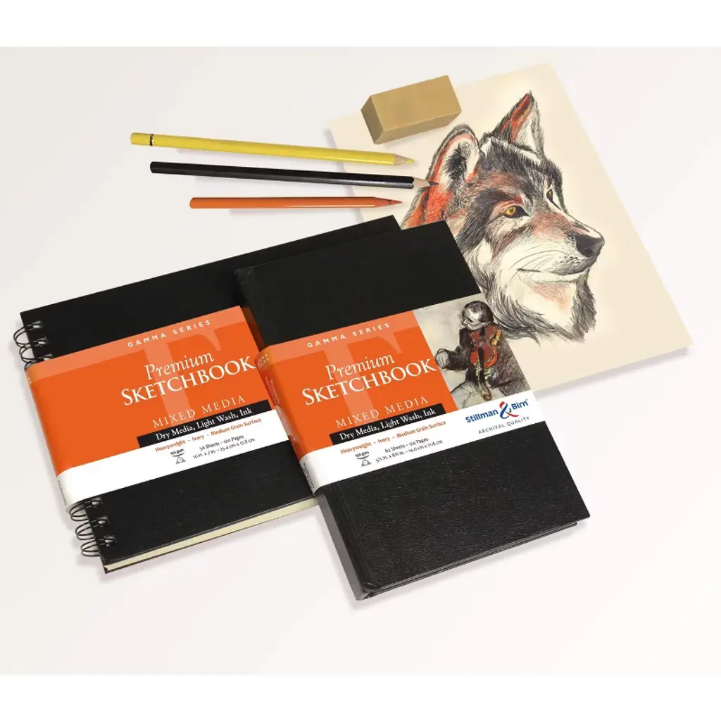 GAMMA SERIES HARDBOUND SKETCHBOOKS Stillman & Birn Gamma Series Hardbound Sketchbooks, 150 gsm (Heavyweight), ivory paper, medium grain surface. Suitable for dry media, light wash and ink. Example of recommended usage: working in pencil or ink mixed with watercolor. Acid-free, chloride-free, lignin-free.