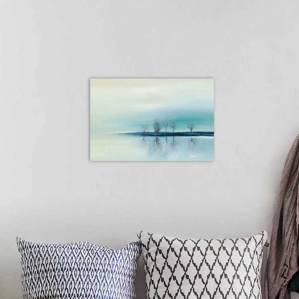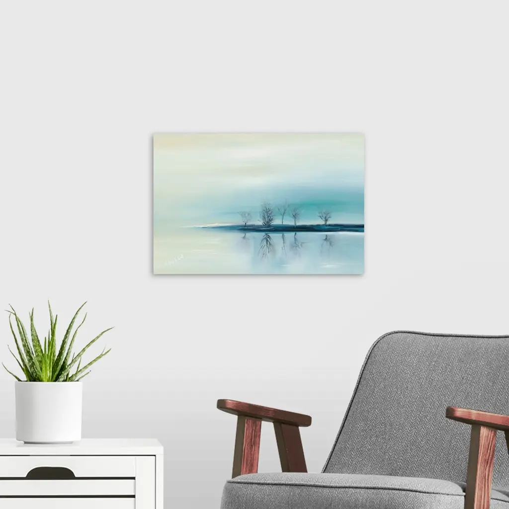Contemporary painting with Winter trees reflecting on to an icy landscape.