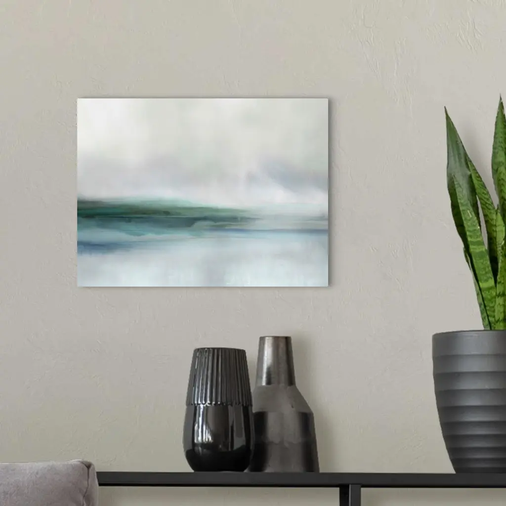 Abstract artwork of muted blue-green sections of color permeating over a distressed gray background.