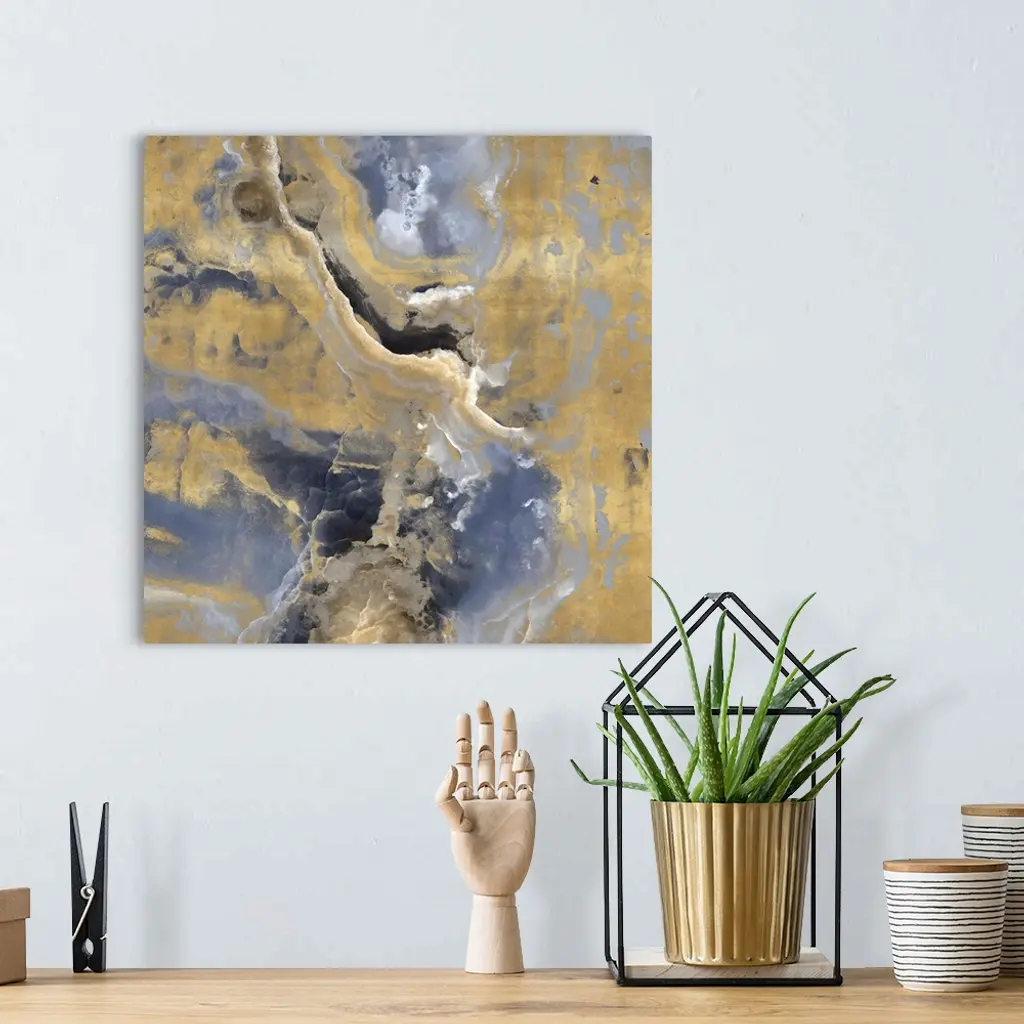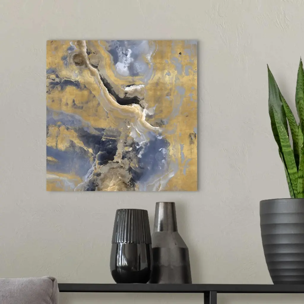 Contemporary artwork featuring a deluge of bluish grays and soft gold colors that have been edited to a marble effect.