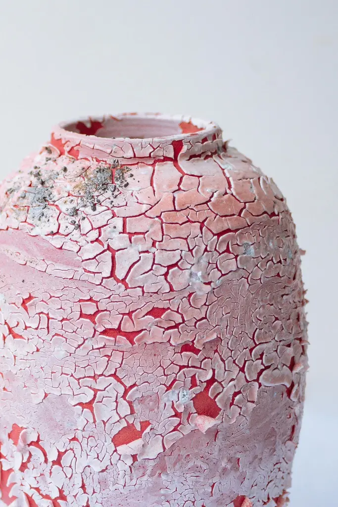 Stoneware red pithos by Arina Antonova2020Dimensions: H 50 x D 30 cmMaterials: stoneware, wild clay, glazeBorn in Sewastopol (Crimea), I was surrounded by the natural variety of the coastal Black Sea views with rocky beaches and picturesque mountain ranges. And it was here that I developed my fascination with the geological diversity of natural materials. Having walked the artist path through the study of drawing and painting, I discovered clay as a material, which became the starting point for my work these last six years.My studio practice focuses on the profound research of natural materials. I consider clay not just to be a functional material for creating objects, but as a holistic subject with its own physicality and vocabulary. During on-going natural sourcing I found a way to physically incorporate the landscape into my work. Experimenting with clay and natural materials is a constant dialog with my surroundings and my desire to merge them with the environment.I have found inspiration in women's pottery tradition, and because of this, most of my works have simple silhouettes with textured surfaces that emphasize qualities of the materials I use, reflecting the process of creation.