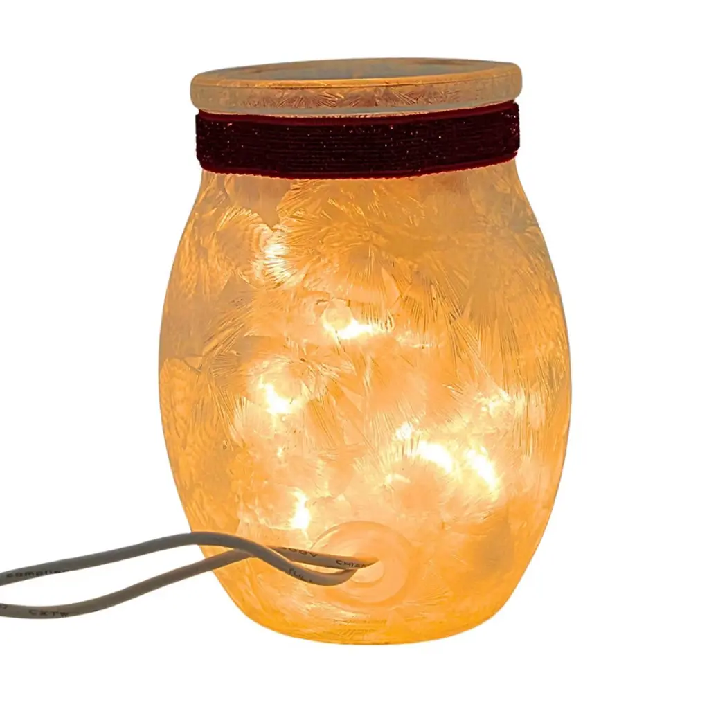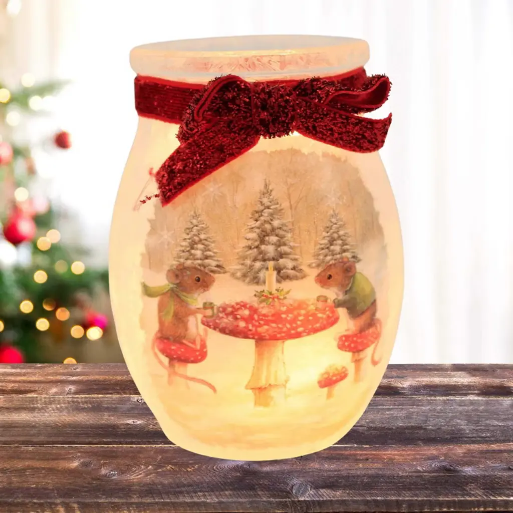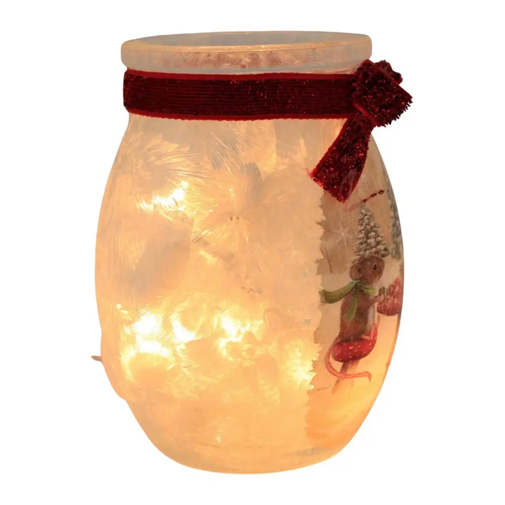 Brighten up your holiday season with the Stony Creek Merry Mice Small Pre-Lit Jar. This 4-inch frosted glass jar features a delightful winter scene of playful mice enjoying the snowy outdoors, topped with a glittered ribbon bow for extra festive flair. Inside, 11 warm white lights softly illuminate the artwork, creating a cozy glow that's perfect for shelves, desks, or nightstands. With included replacement bulbs and fuses, low energy use, and a simple plug-in design, it’s a charming and easy way to add seasonal joy to any small space. Measures Approximately 4 In H X 3 In W X 3 In D (HxWxD). Includes 1 Small Pre-Lit Jar.