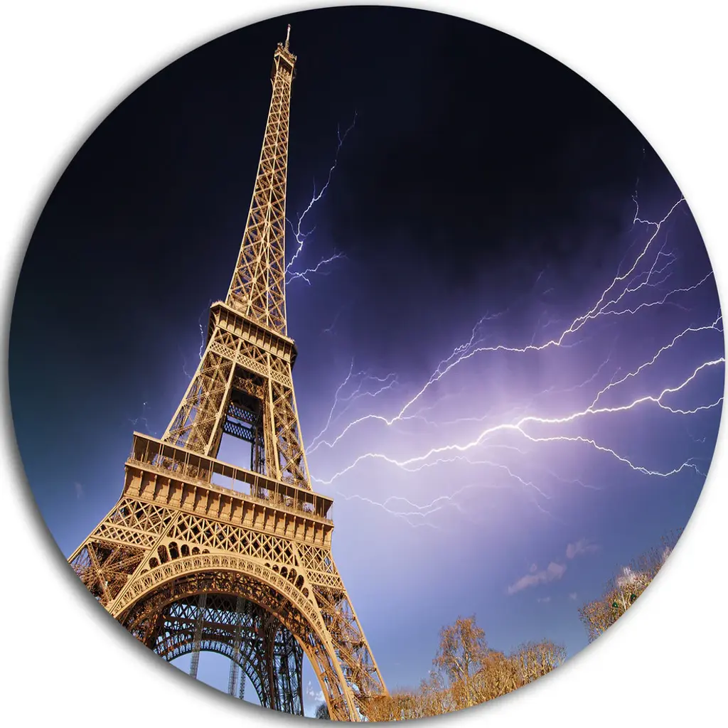 Bring Contemporary Abstraction to your home with this large Circle Metal wall art. This Storm above Paris Eiffel Tower in Paris Metal Artwork makes it the focal point of any room or office. - White Gloss Coating ensures colors are extra vibrant with light reflection.- Aluminum grade Sheet Metal with 1 inch mounting frame on the back giving the illusion that the artwork is floating on the wall..- Mounting Brackets are included along with instructions.- High Quality Digital images are created directly into a glossy aluminum panel producing a stunning and captivating print into the glossy finish of the metal.- Water, Fire and Scratch resistant HD Aluminum panels.- Looks better than any photo paper and guaranteed to last at least 20 years- Easy to clean with a microfiber cloth. Colors are far superior to regular Canvas Art. - Easy to Hang