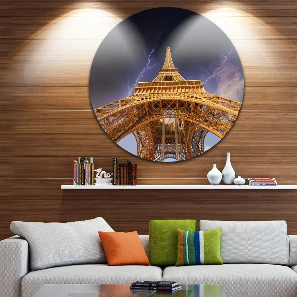 Bring Contemporary Abstraction to your home with this large Circle Metal wall art. This Storm above Paris Eiffel Tower in Paris Metal Artwork makes it the focal point of any room or office. - White Gloss Coating ensures colors are extra vibrant with light reflection.- Aluminum grade Sheet Metal with 1 inch mounting frame on the back giving the illusion that the artwork is floating on the wall..- Mounting Brackets are included along with instructions.- High Quality Digital images are created directly into a glossy aluminum panel producing a stunning and captivating print into the glossy finish of the metal.- Water, Fire and Scratch resistant HD Aluminum panels.- Looks better than any photo paper and guaranteed to last at least 20 years- Easy to clean with a microfiber cloth. Colors are far superior to regular Canvas Art. - Easy to Hang
