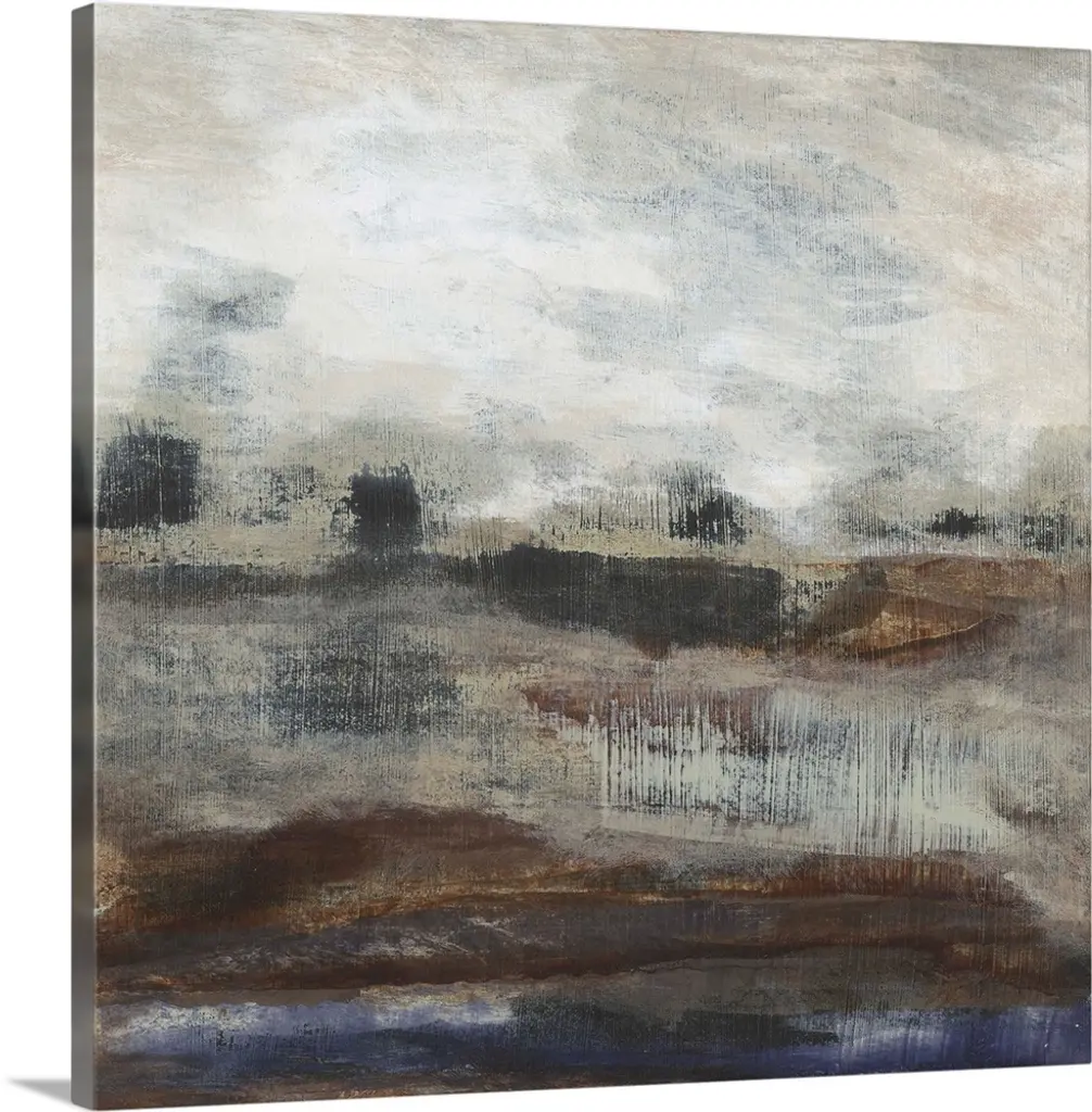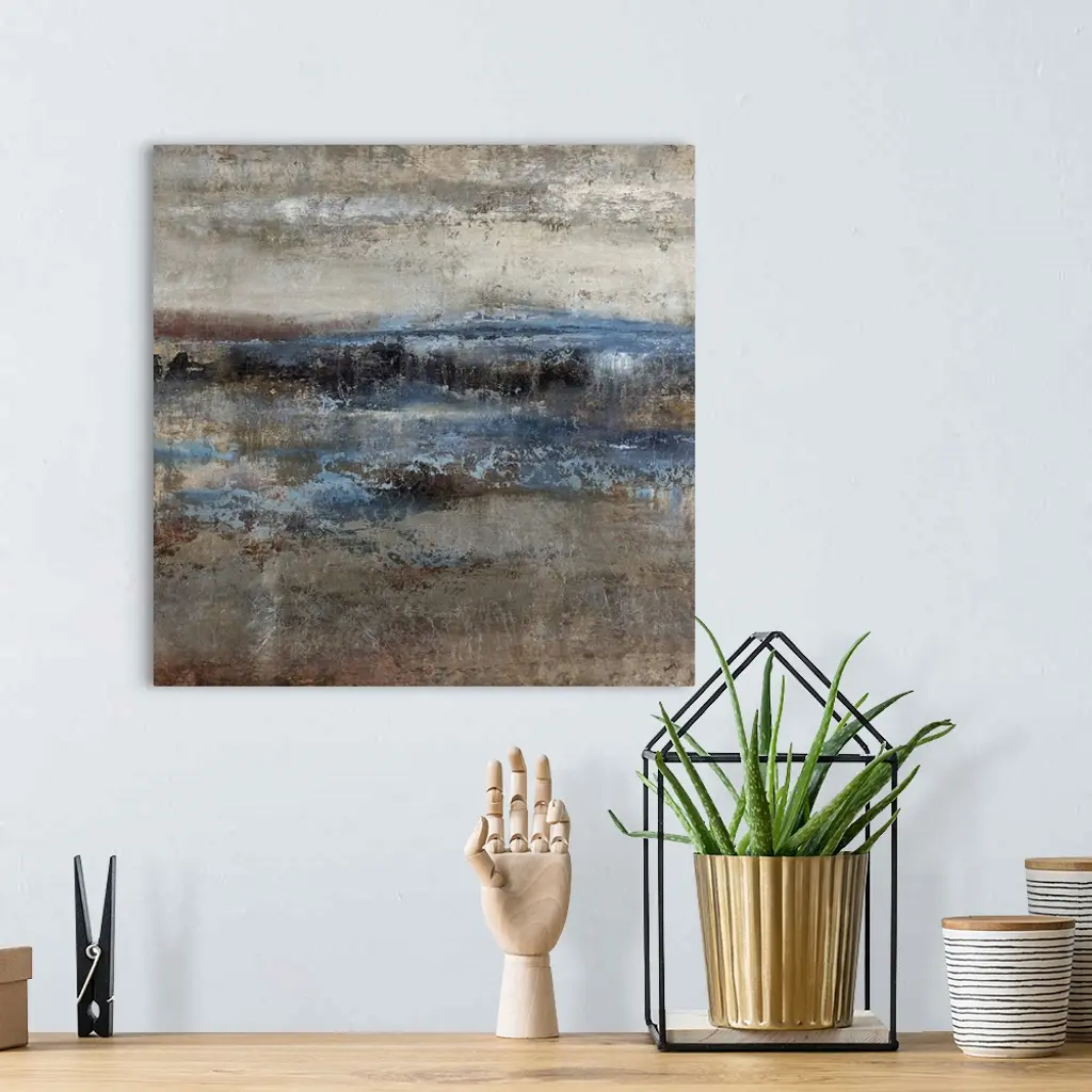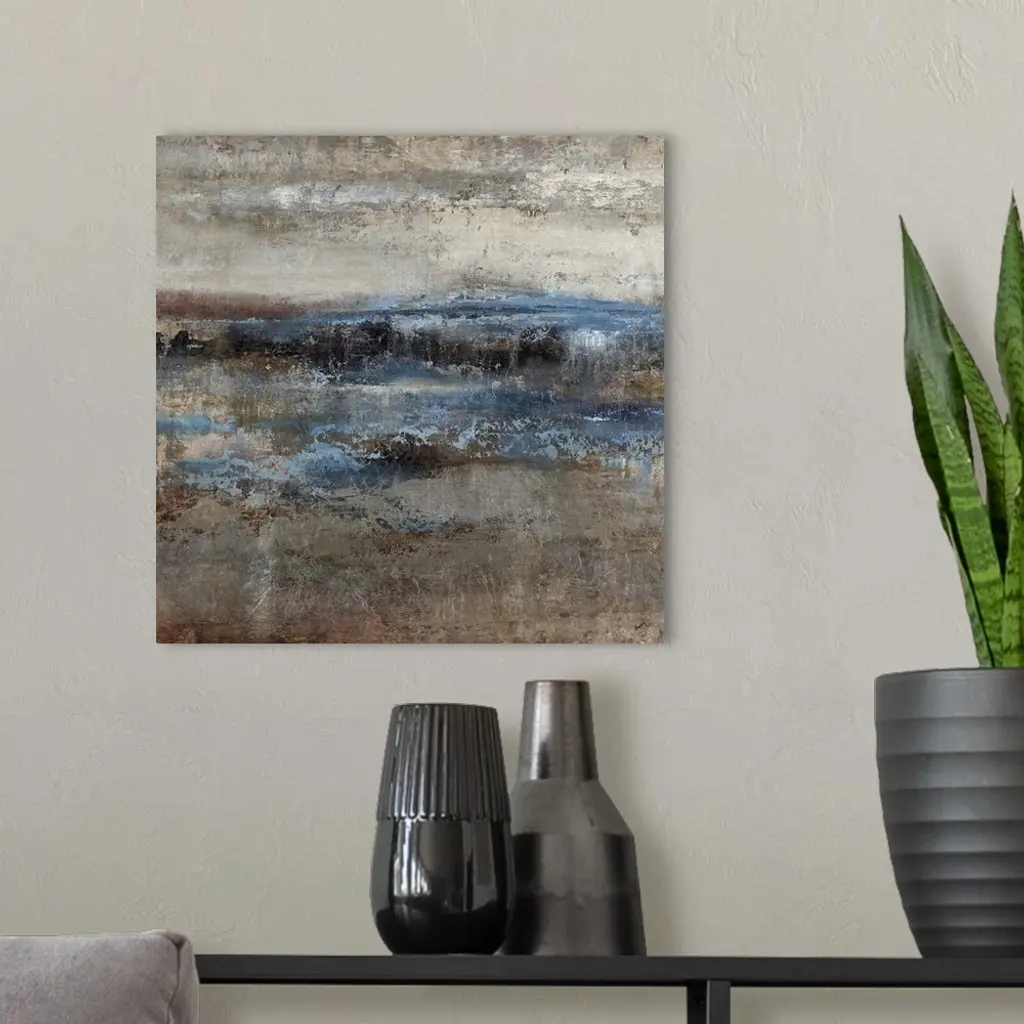 Abstract painting of large waves hitting a shoreline as the clouds of a storm begin to dissipate in the sky above.
