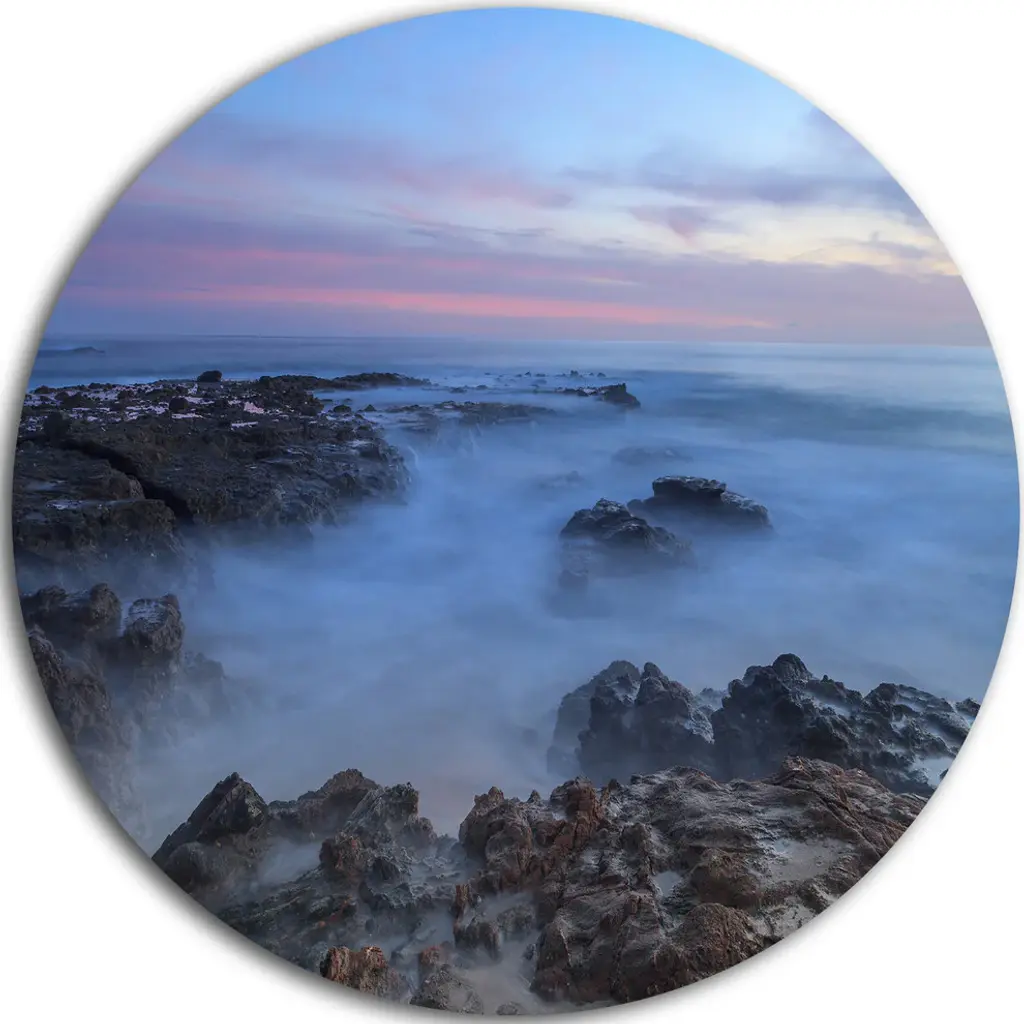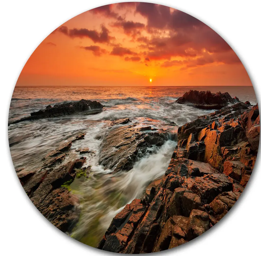 Bring Contemporary Abstraction to your home with this large Circle Metal wall art. This Stormy Seashore with Colorful Sky Metal Artwork makes it the focal point of any room or office. - White Gloss Coating ensures colors are extra vibrant with light reflection.- Aluminum grade Sheet Metal with 1 inch mounting frame on the back giving the illusion that the artwork is floating on the wall..- Mounting Brackets are included along with instructions.- High Quality Digital images are created directly into a glossy aluminum panel producing a stunning and captivating print into the glossy finish of the metal.- Water, Fire and Scratch resistant HD Aluminum panels.- Looks better than any photo paper and guaranteed to last at least 20 years- Easy to clean with a microfiber cloth. Colors are far superior to regular Canvas Art. - Easy to Hang
