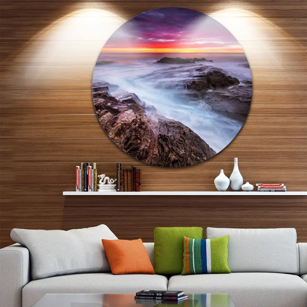 Bring Contemporary Abstraction to your home with this large Circle Metal wall art. This Stormy Seashore with Colorful Sky Metal Artwork makes it the focal point of any room or office. - White Gloss Coating ensures colors are extra vibrant with light reflection.- Aluminum grade Sheet Metal with 1 inch mounting frame on the back giving the illusion that the artwork is floating on the wall..- Mounting Brackets are included along with instructions.- High Quality Digital images are created directly into a glossy aluminum panel producing a stunning and captivating print into the glossy finish of the metal.- Water, Fire and Scratch resistant HD Aluminum panels.- Looks better than any photo paper and guaranteed to last at least 20 years- Easy to clean with a microfiber cloth. Colors are far superior to regular Canvas Art. - Easy to Hang