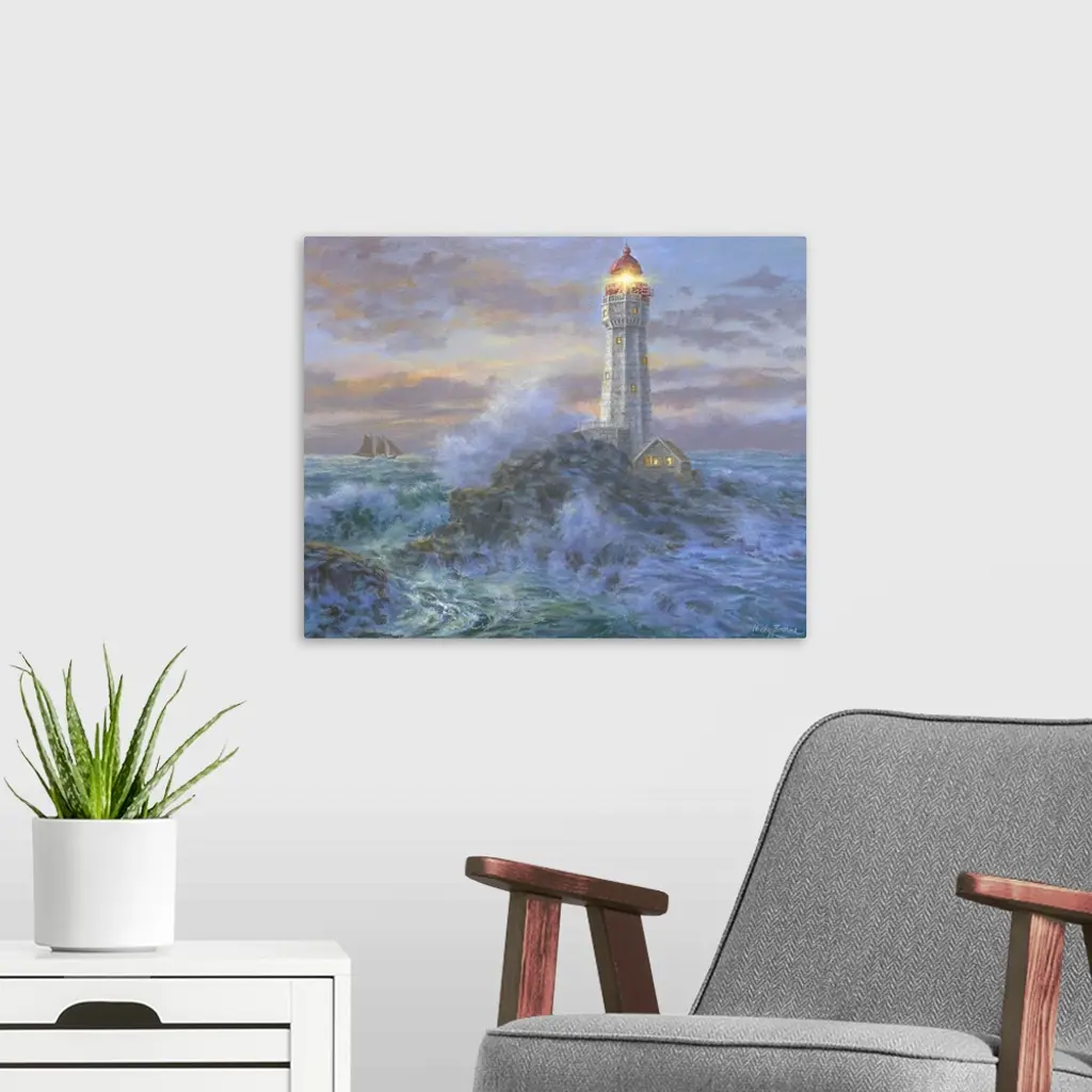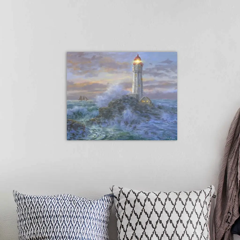 Painting of lighthouse scene featuring glowing windows. Product is a painting reproduction only, and does not contain actual lights.