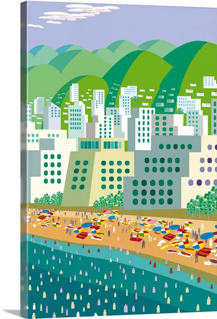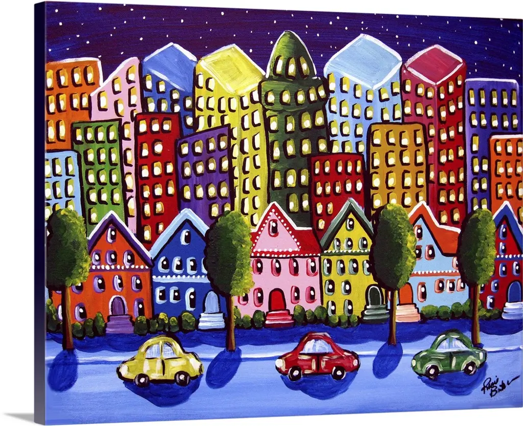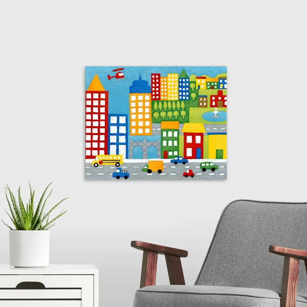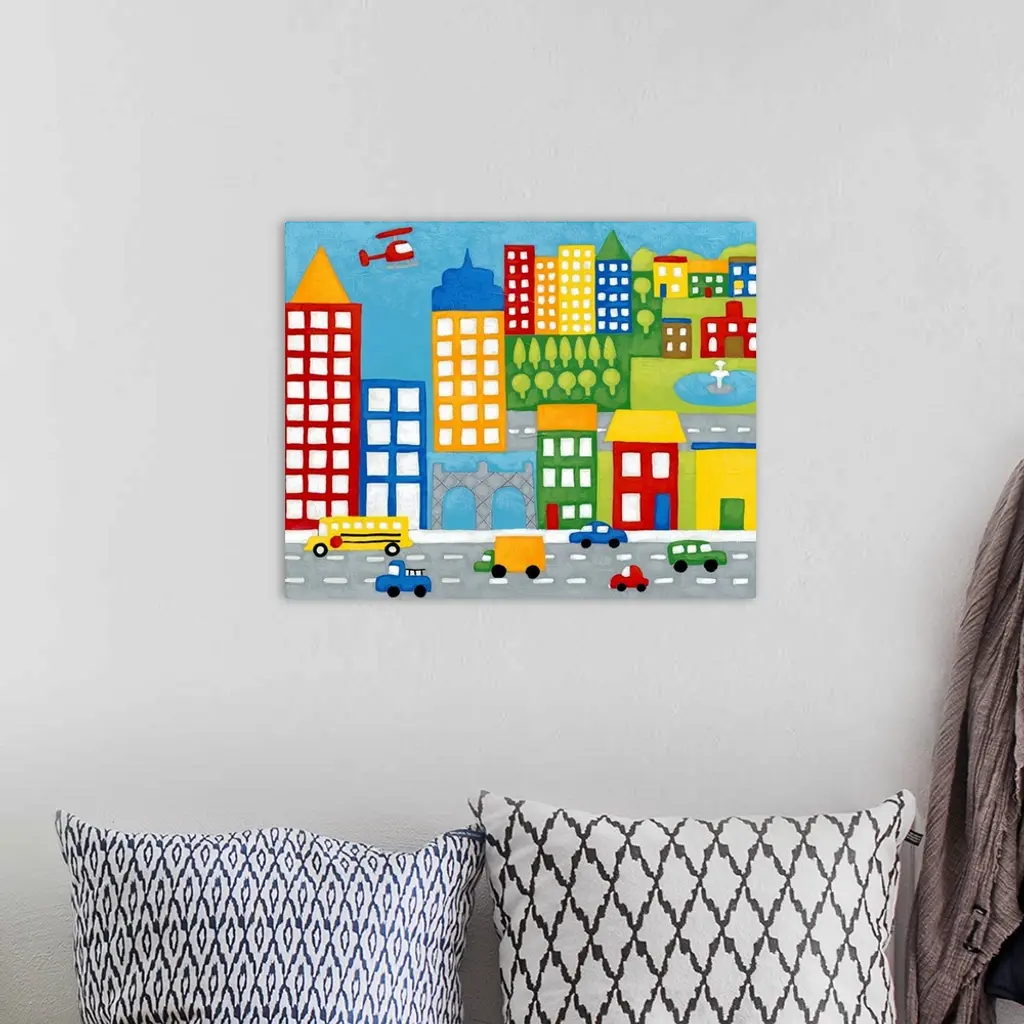 Artwork perfect for a child's room of colorful buildings that has a street in front with cars and trucks.