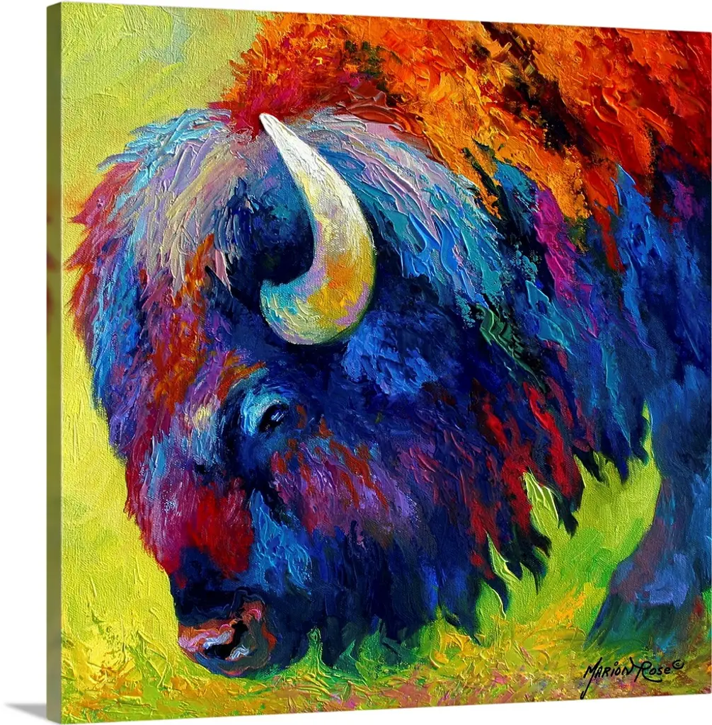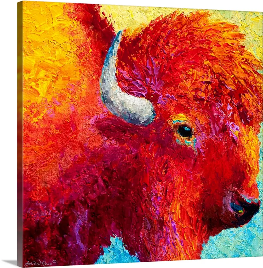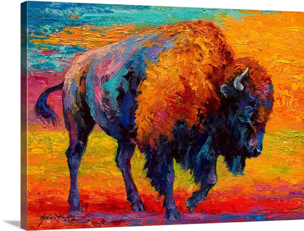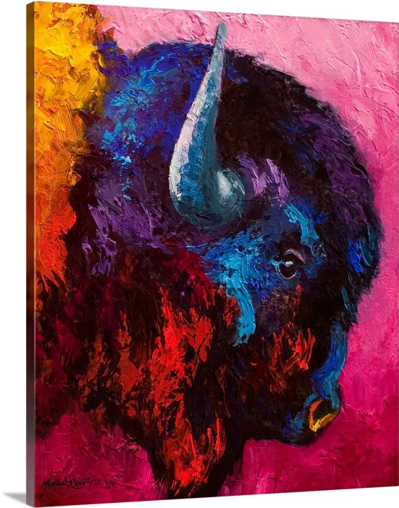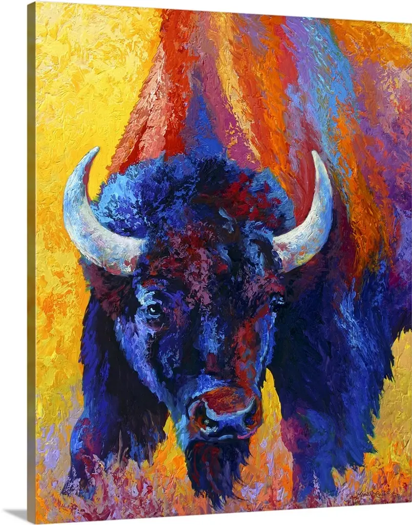 Contemporary painting of charging buffalo with horns with colorful abstract background.