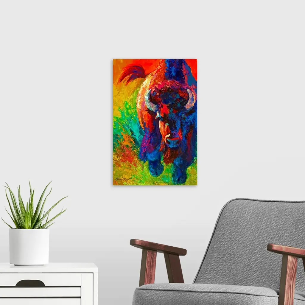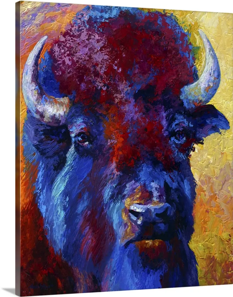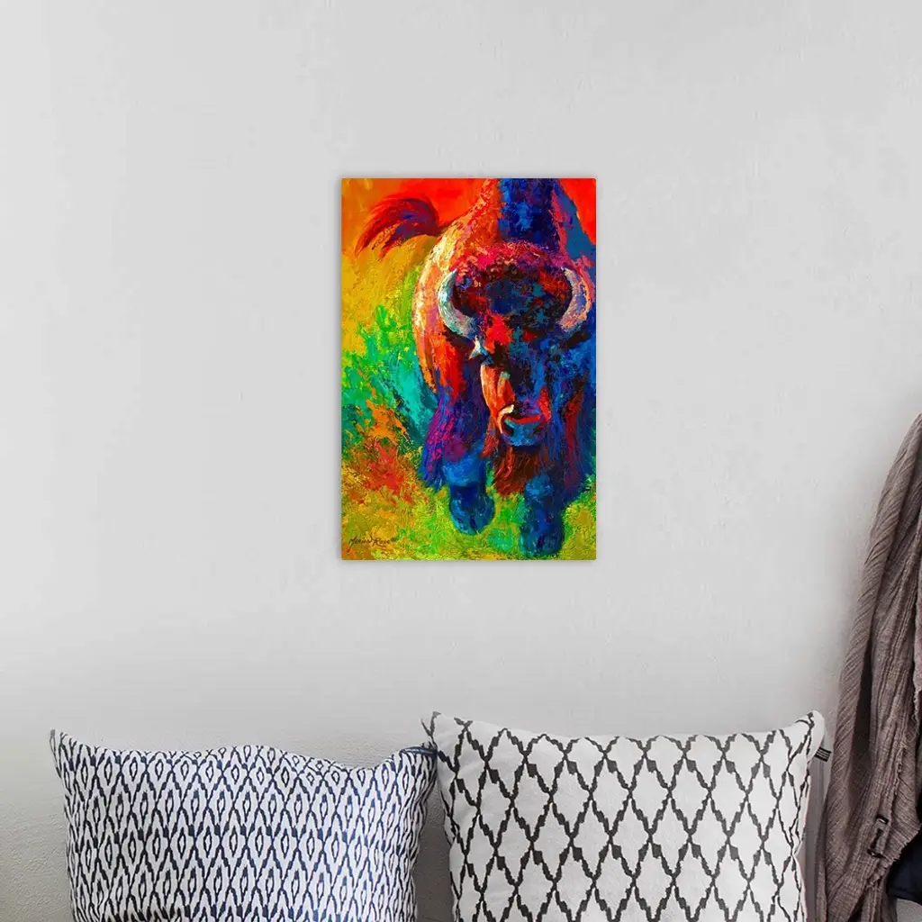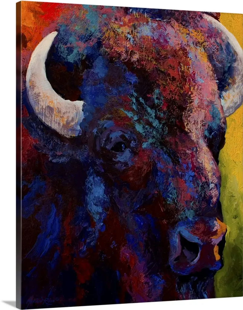 Contemporary painting of charging buffalo with horns with colorful abstract background.