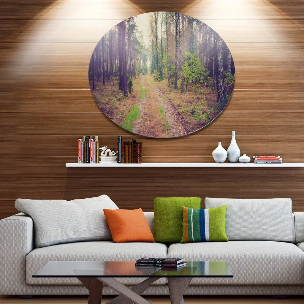 Bring Contemporary Abstraction to your home with this large Circle Metal wall art. This Straight Pathway in Thick Forest Metal Artwork makes it the focal point of any room or office. - White Gloss Coating ensures colors are extra vibrant with light reflection.- Aluminum grade Sheet Metal with 1 inch mounting frame on the back giving the illusion that the artwork is floating on the wall..- Mounting Brackets are included along with instructions.- High Quality Digital images are created directly into a glossy aluminum panel producing a stunning and captivating print into the glossy finish of the metal.- Water, Fire and Scratch resistant HD Aluminum panels.- Looks better than any photo paper and guaranteed to last at least 20 years- Easy to clean with a microfiber cloth. Colors are far superior to regular Canvas Art. - Easy to Hang