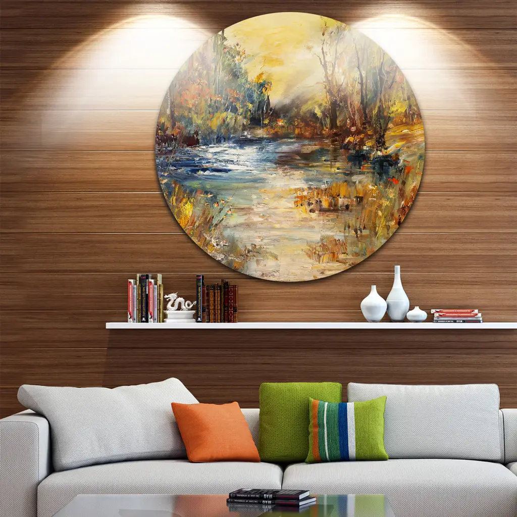 Bring Contemporary Abstraction to your home with this large Circle Metal wall art. This Stream in Forest Oil Painting Metal Artwork makes it the focal point of any room or office. - White Gloss Coating ensures colors are extra vibrant with light reflection.- Aluminum grade Sheet Metal with 1 inch mounting frame on the back giving the illusion that the artwork is floating on the wall..- Mounting Brackets are included along with instructions.- High Quality Digital images are created directly into a glossy aluminum panel producing a stunning and captivating print into the glossy finish of the metal.- Water, Fire and Scratch resistant HD Aluminum panels.- Looks better than any photo paper and guaranteed to last at least 20 years- Easy to clean with a microfiber cloth. Colors are far superior to regular Canvas Art. - Easy to Hang