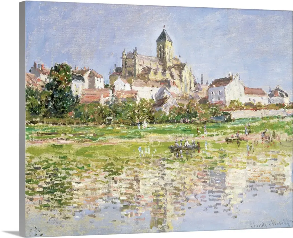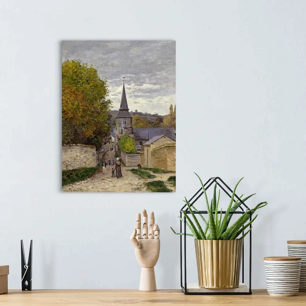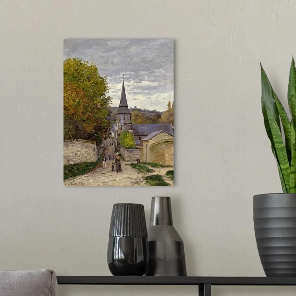 Portrait, large classic artwork of a narrow street leading into a town, surrounded by small buildings and a stone wall on one side, with large trees behind it. Small groups of people are walking down the street on a overcast day.