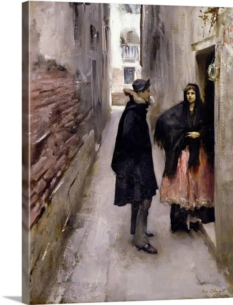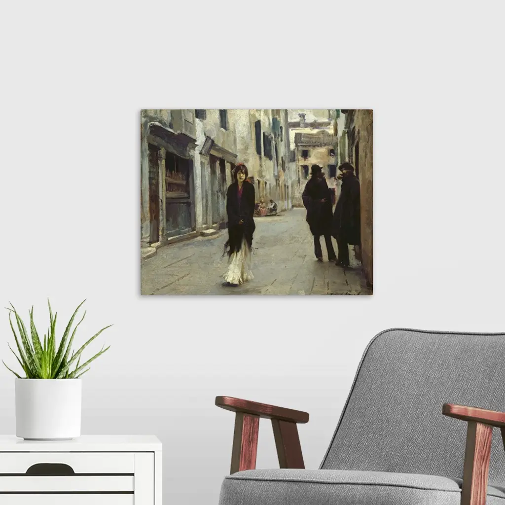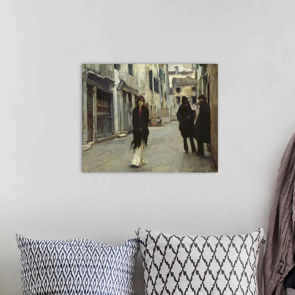 Street in Venice, by John Singer Sargent, 1911, American painting, oil on wood panel. A young women walks alone in Venice, wearing a fringed black shawl which echoes the silhouette of two men on the right, all against the light tones of the street