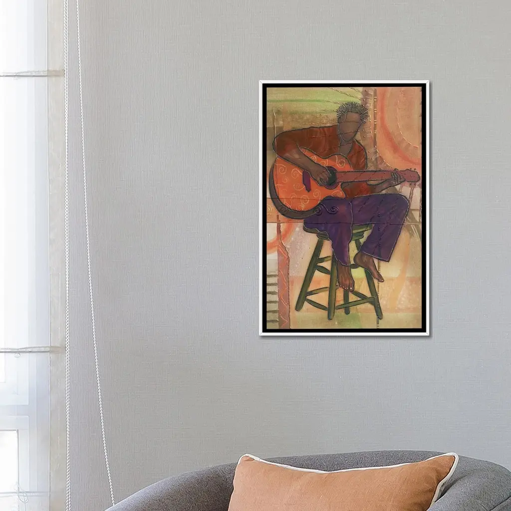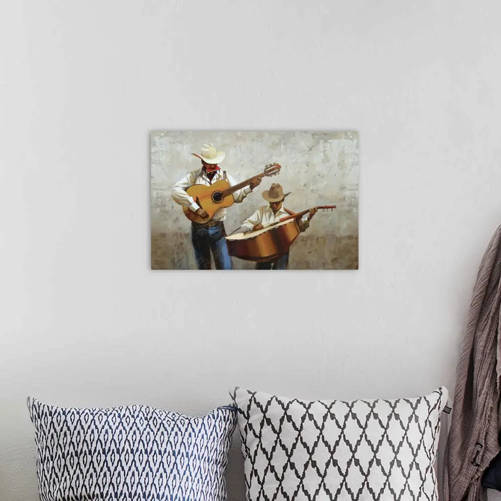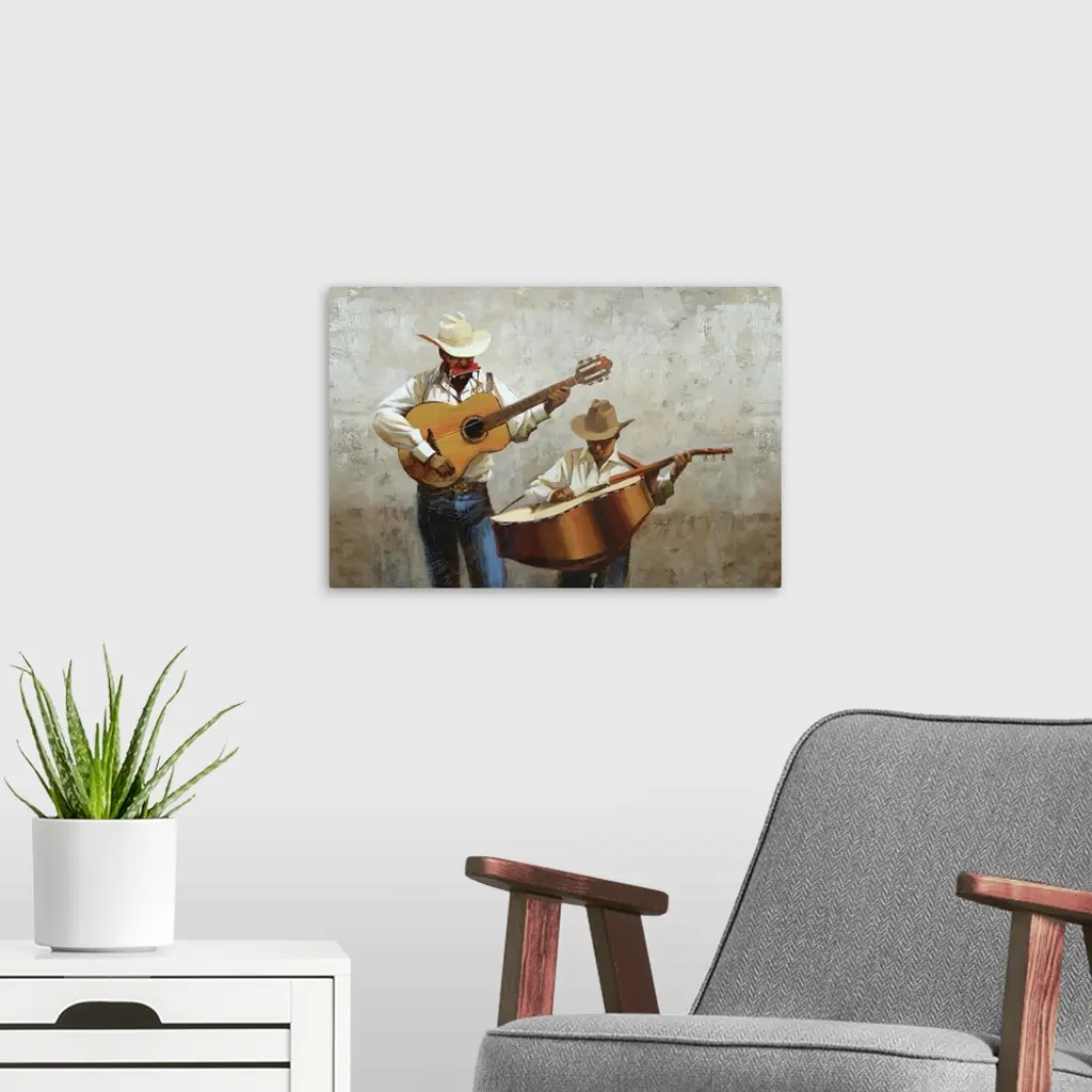 Painting of two musicians playing instruments and wearing cowboy hats against a gray background.