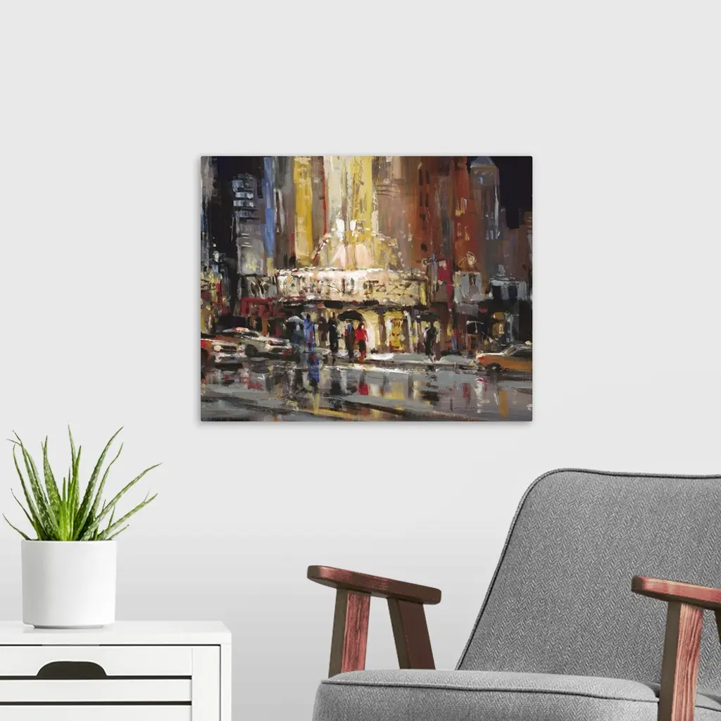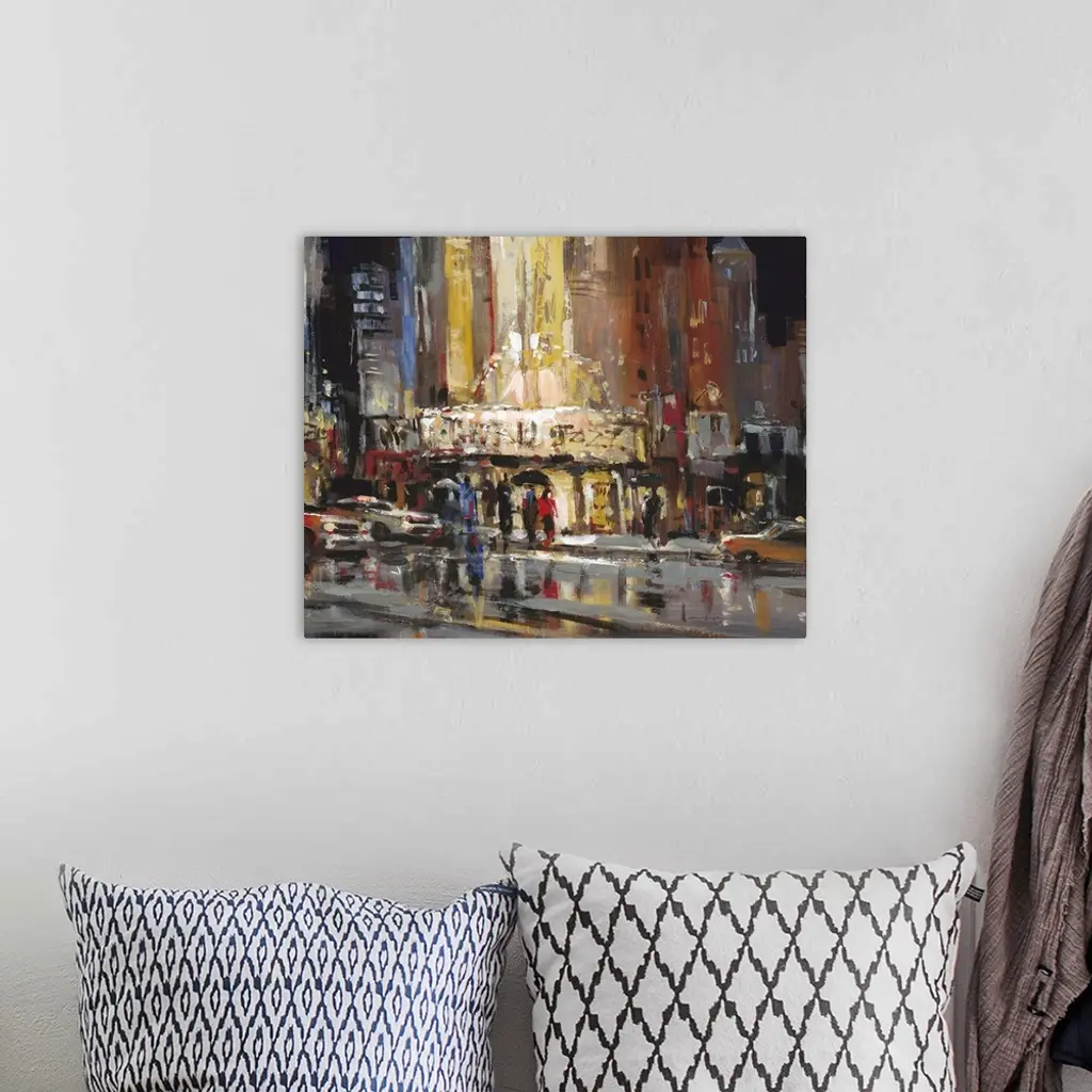 Contemporary painting of a city street with people casting reflections in puddles.