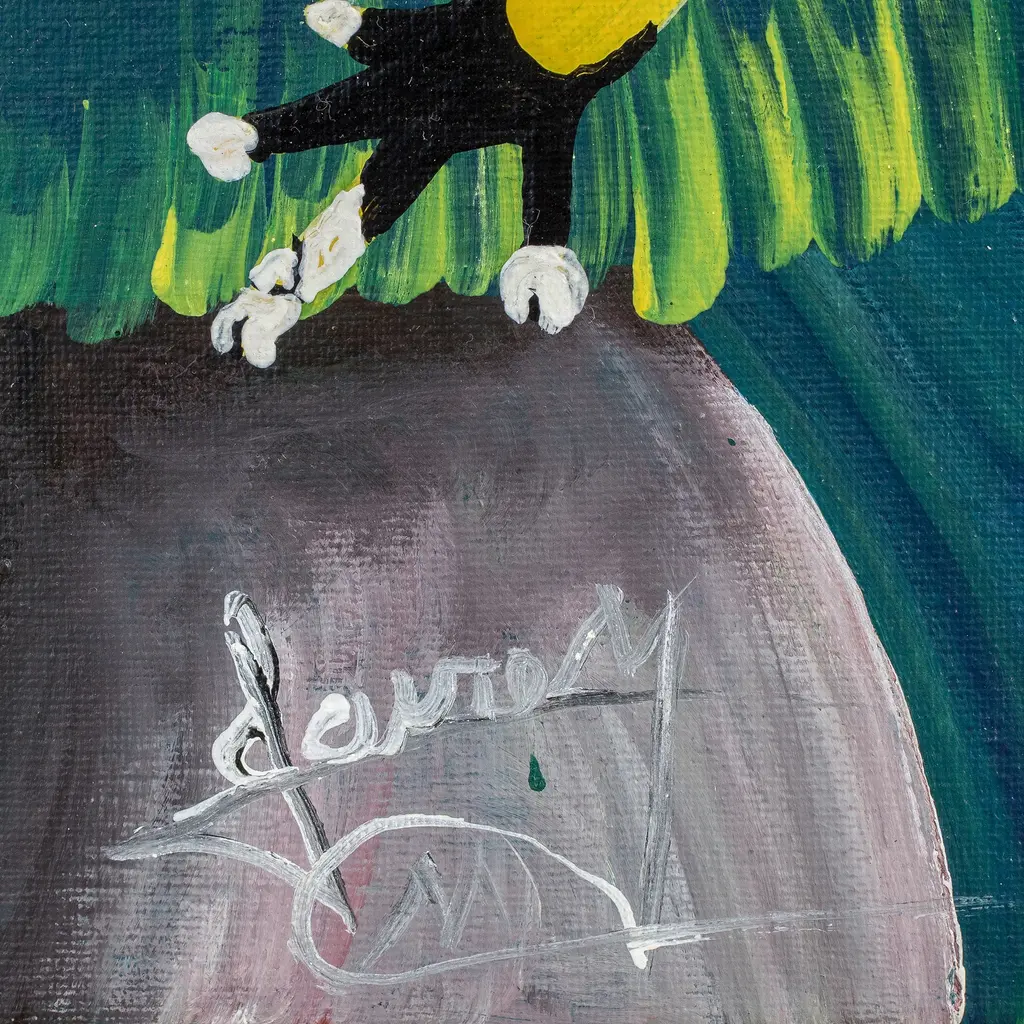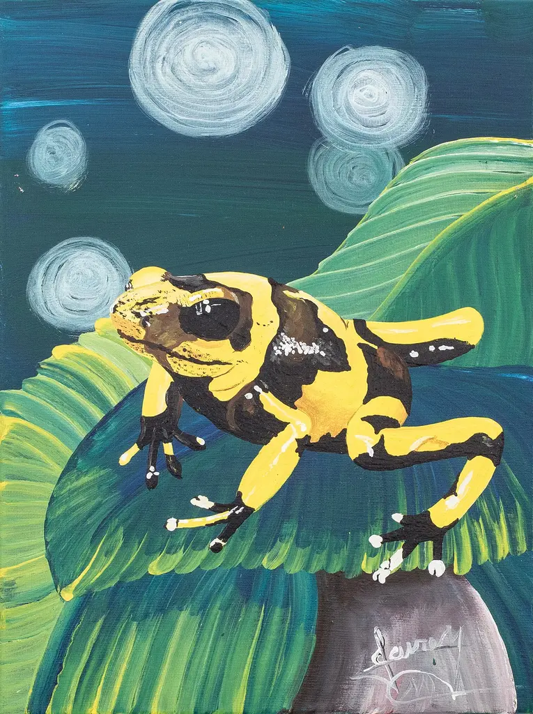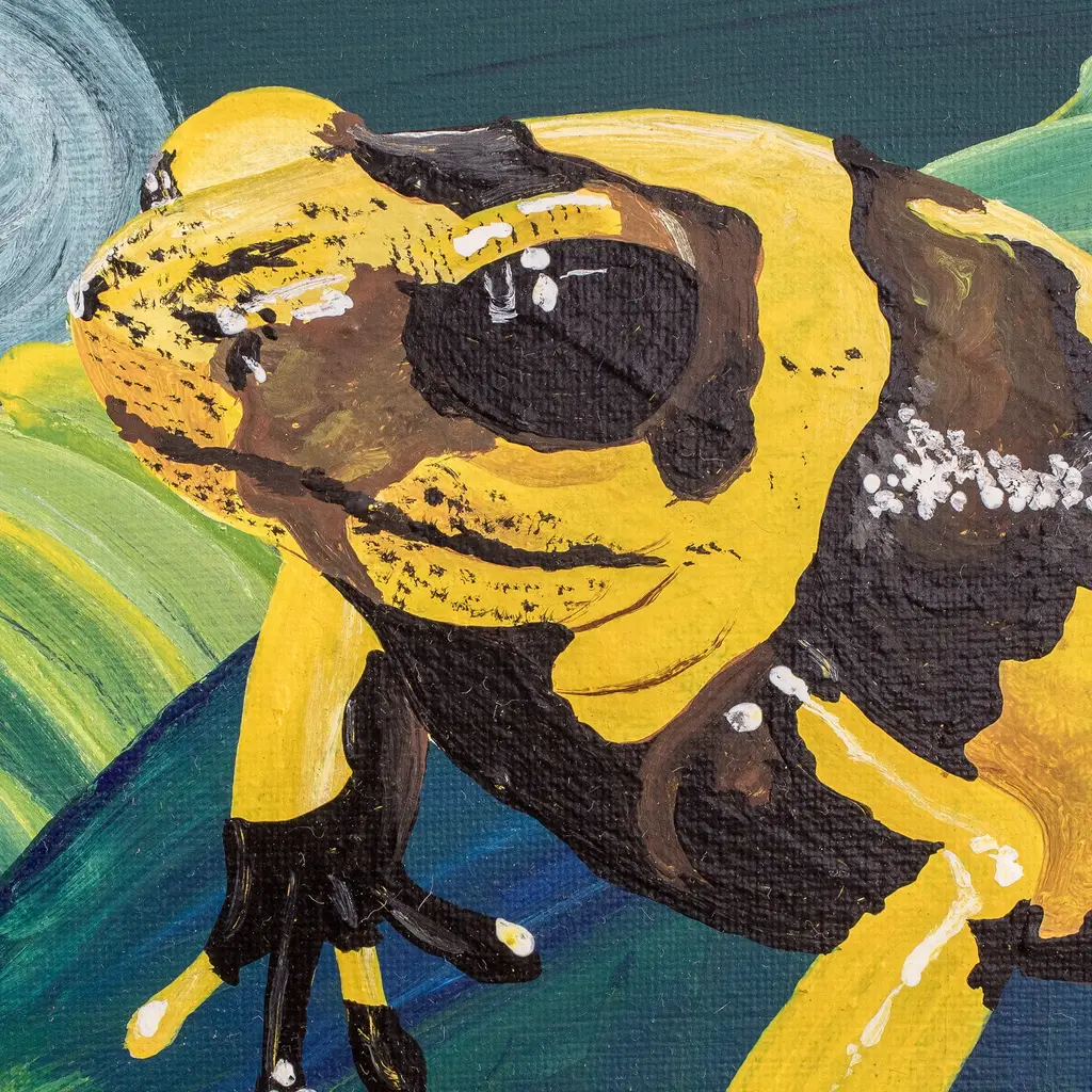Intense colors make the famous golden dart frog a stunning inhabitant of the rich Costa Rican jungle, motivating artist Jairo Mora to portray its captivating beauty in this impressionist painting. Acrylic hues of yellow, black and green gracefully merge in the artist's composition, evoking the charming essence of this diverse environment.The piece comes signed and stretched, titled Rana Dardo Amarilla as the frog's Spanish nomenclature.