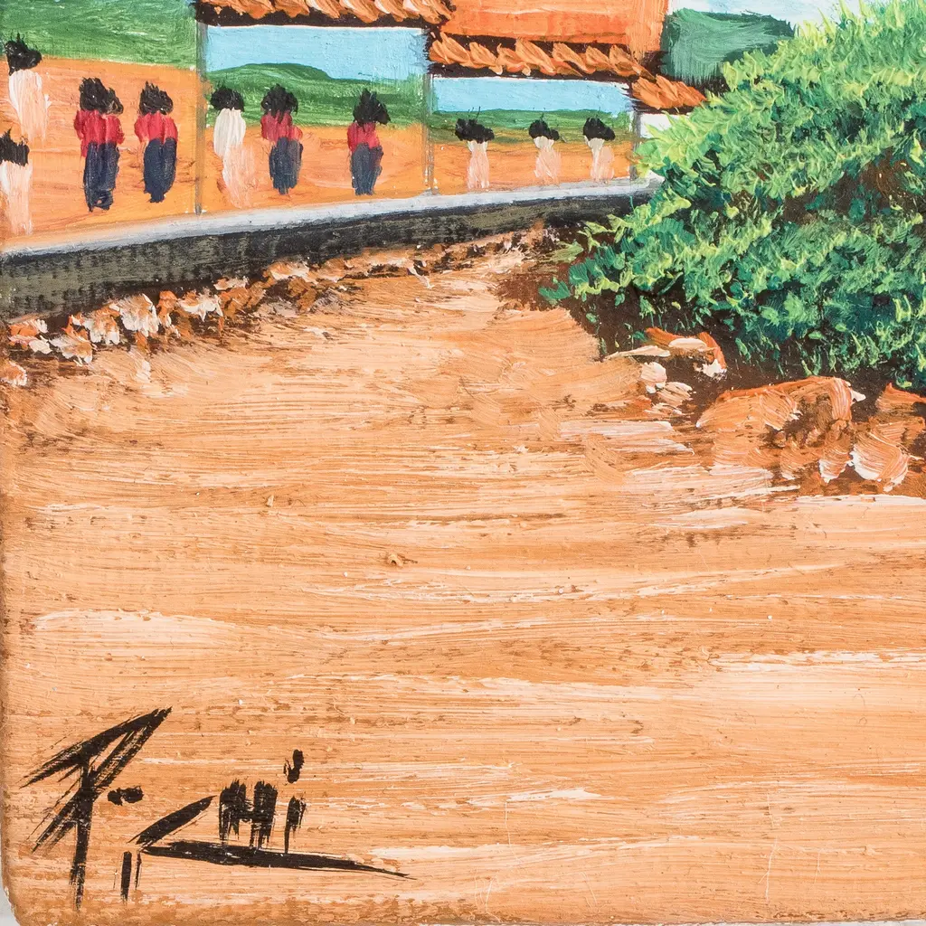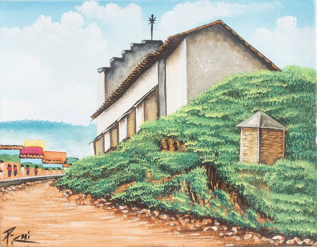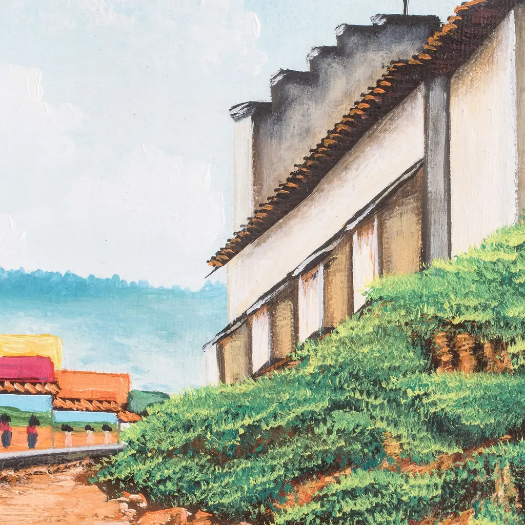 The colonial streets of San Juan Comalapa inspire artist Hugo Pichiya to create an impressionist painting that captures Guatemala's traditional and festive essence. Putting his expertise into practice, Hugo uses oil on canvas to create this marvelous composition of one of the town's classic buildings, surrounded by nature.The work comes signed by the artist and stretched.