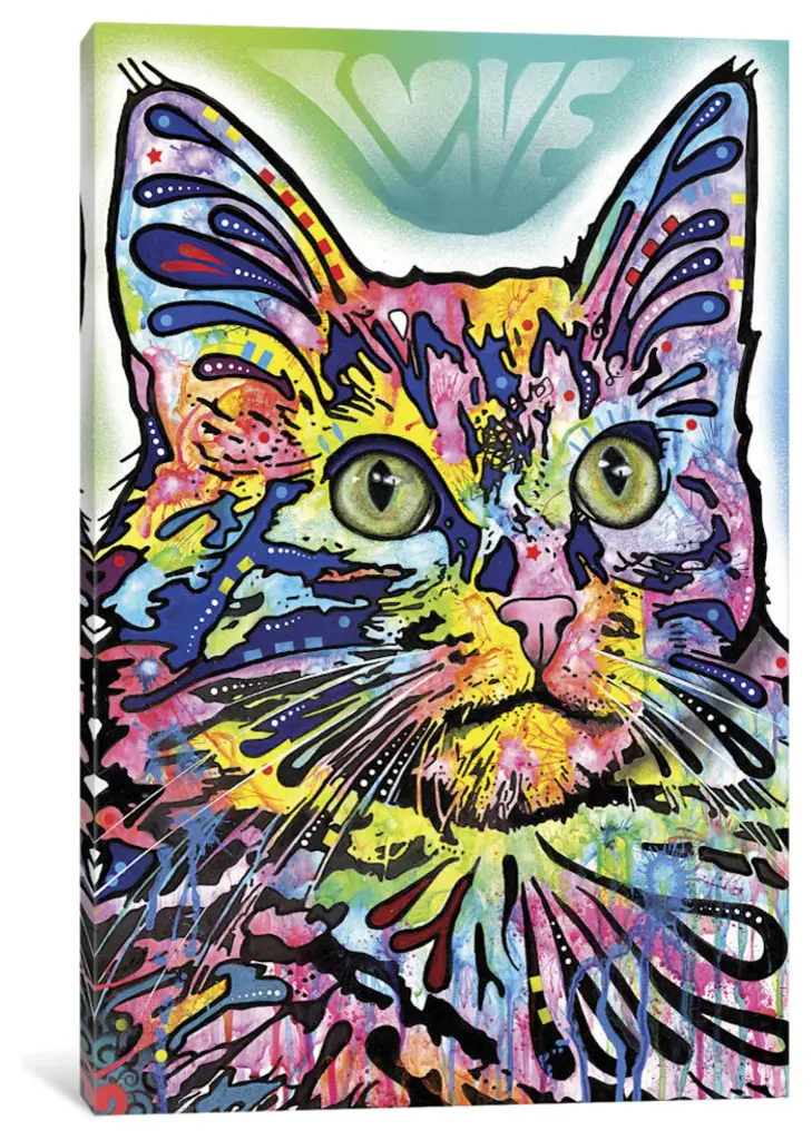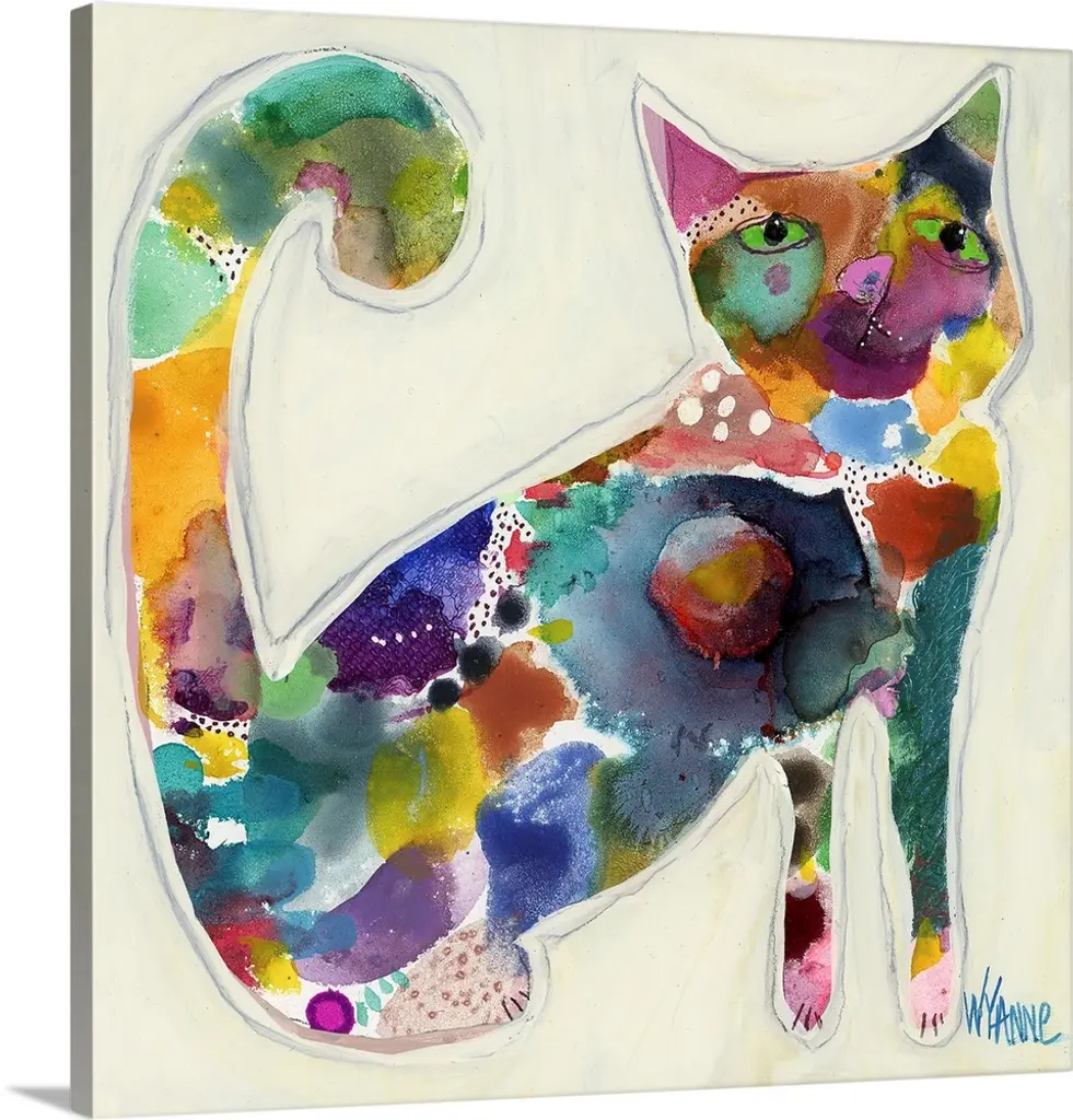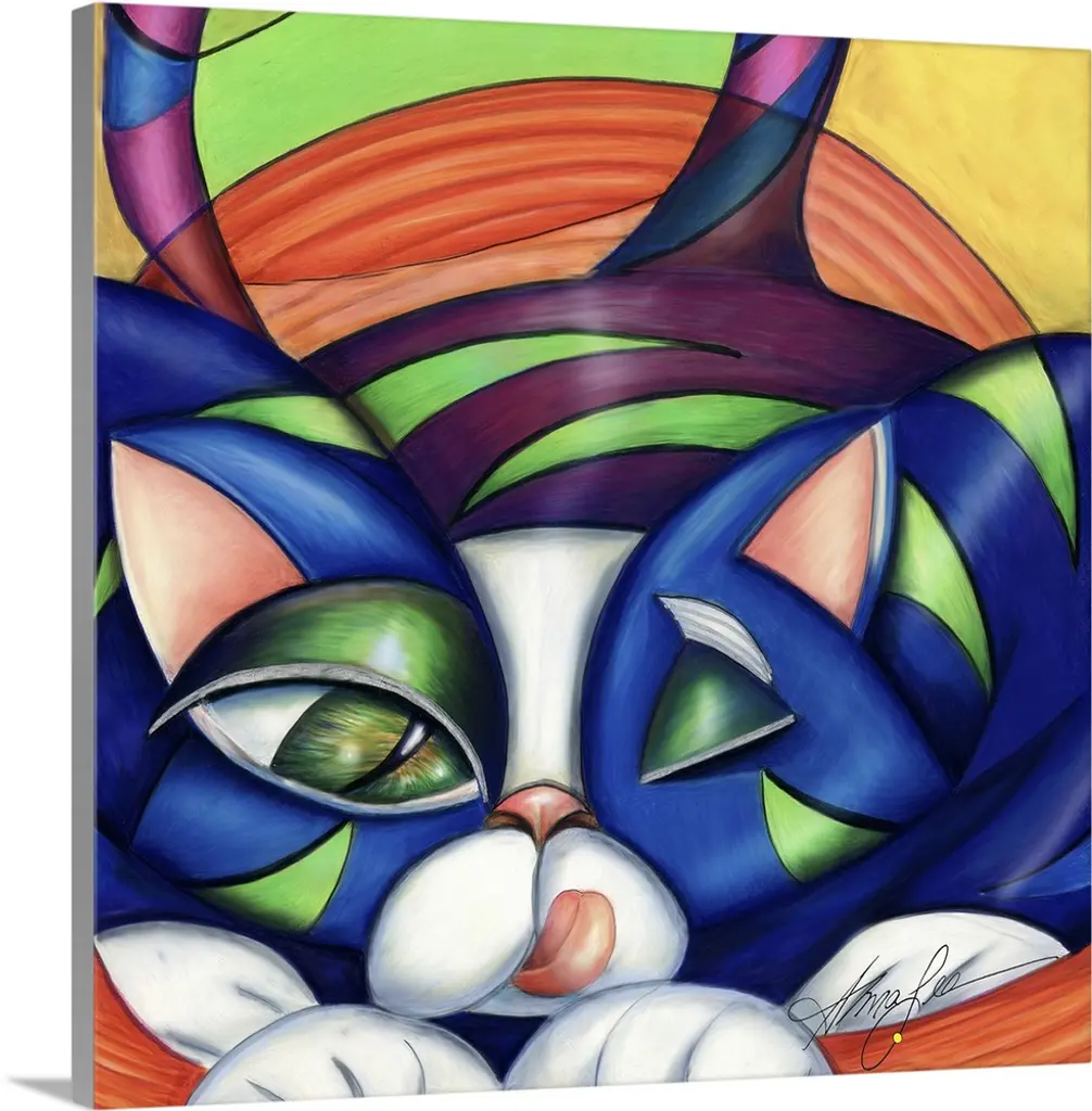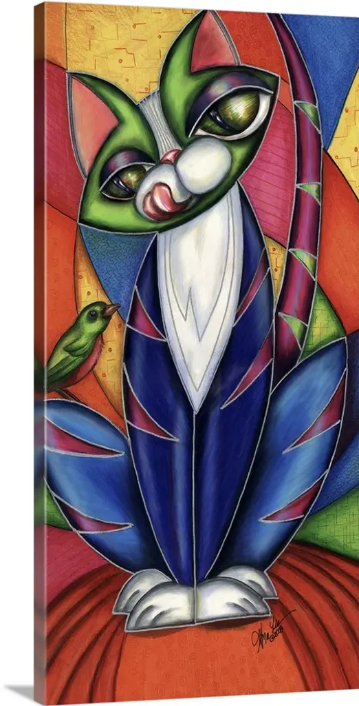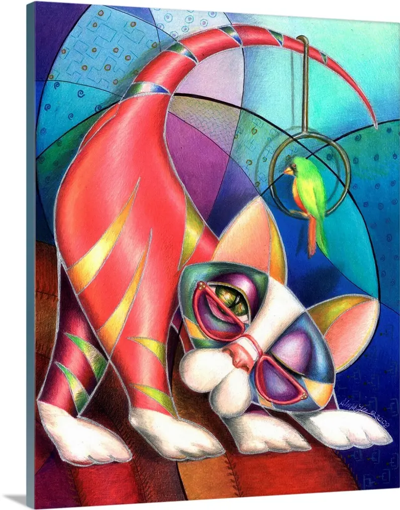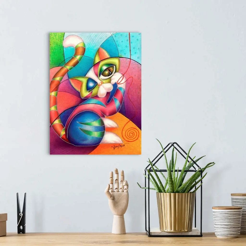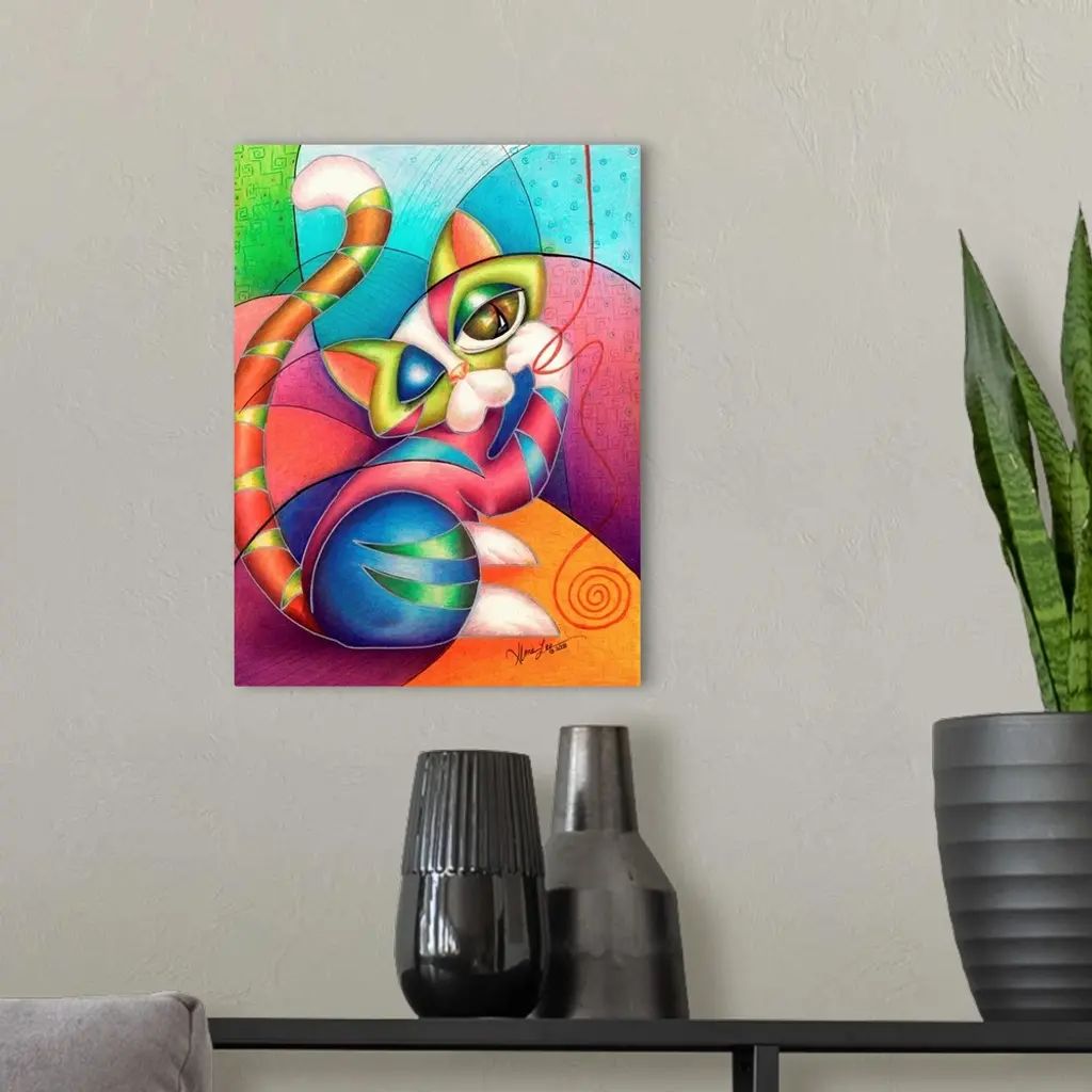 Contemporary artwork in the style of cubism of a cat with yarn in bold colors.