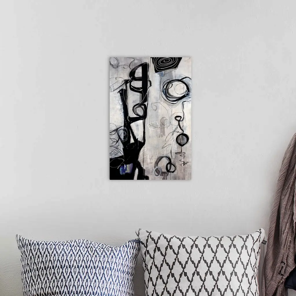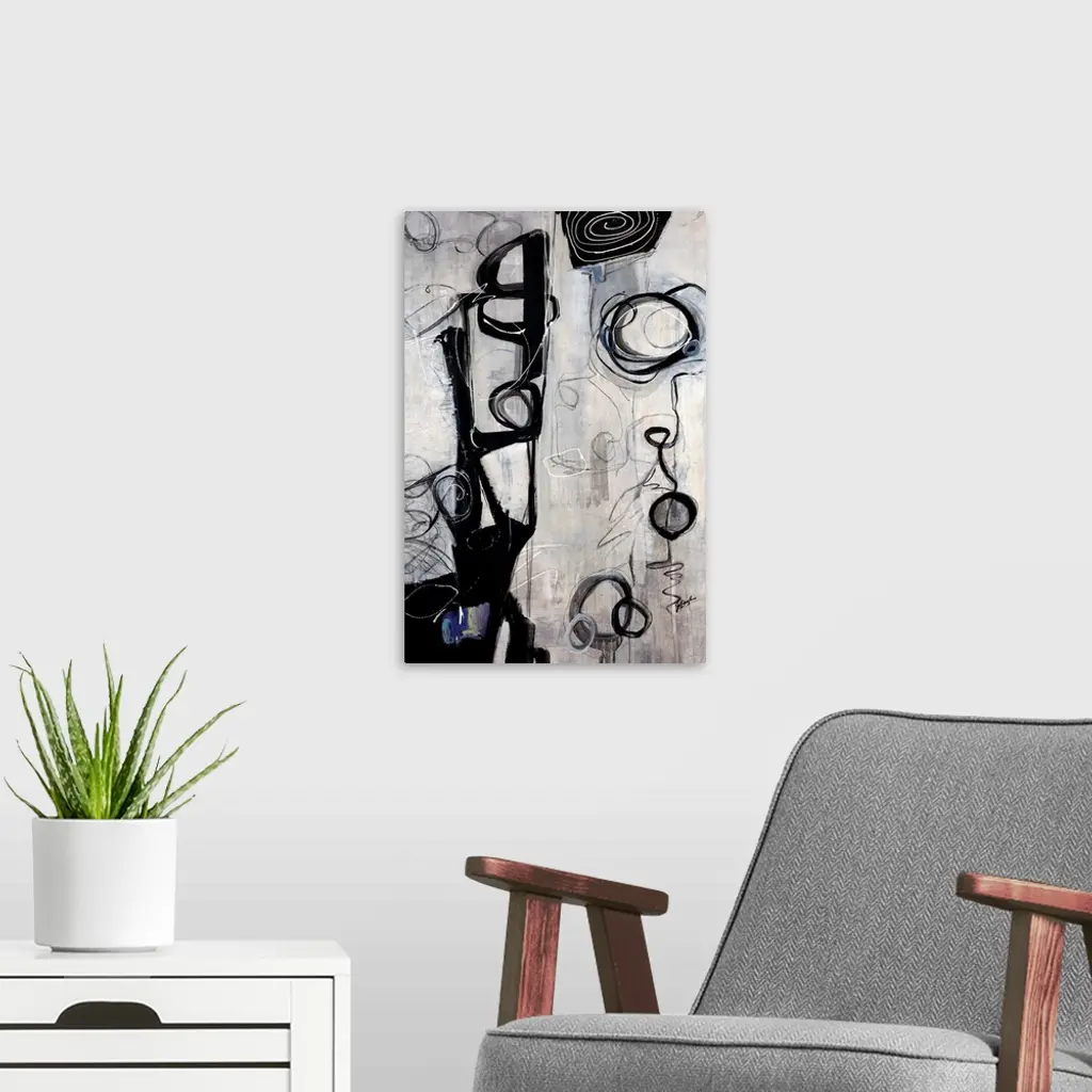 Vertical oversized contemporary artwork of dark swirling circular shapes and scribbles on a streaky background of light, neutral tones.