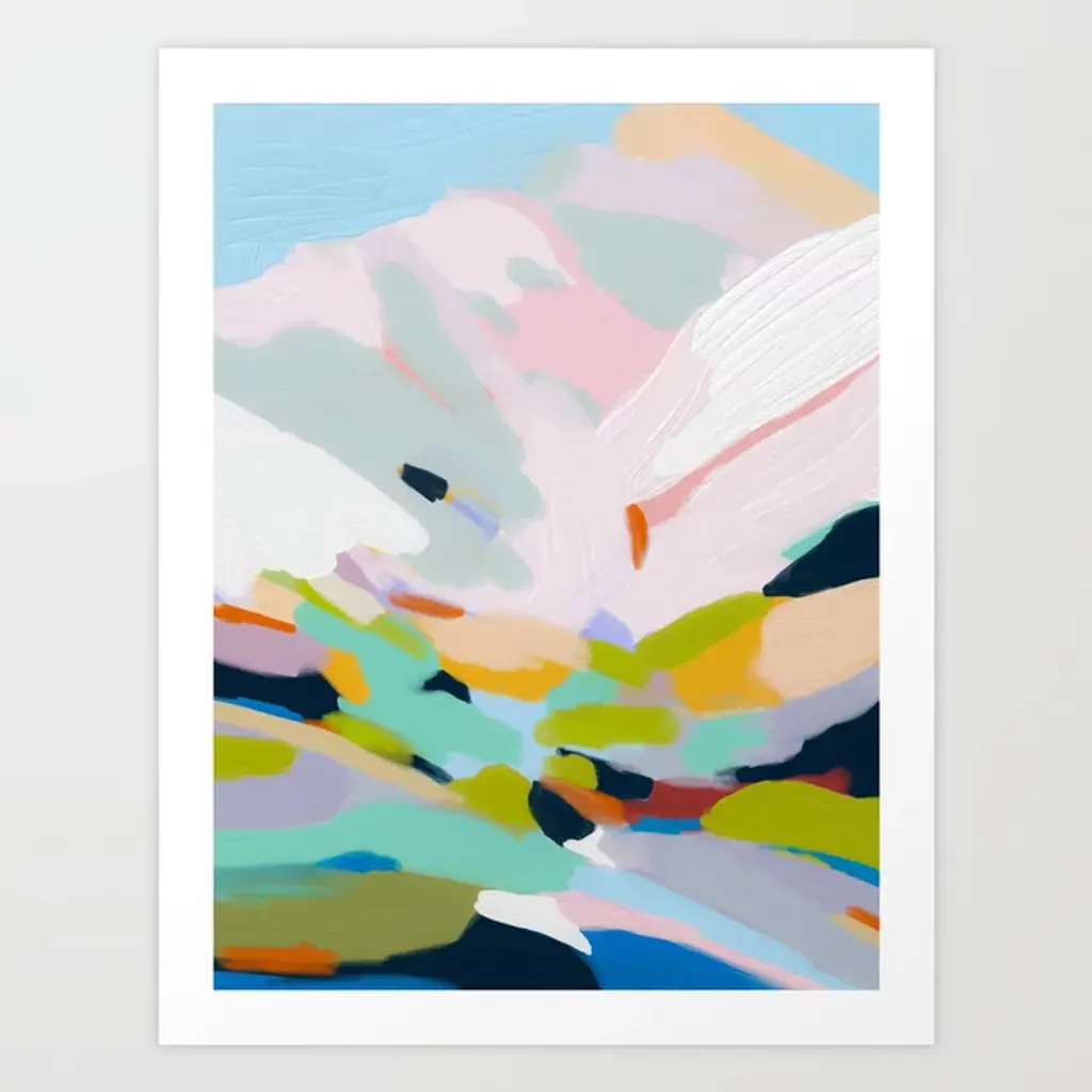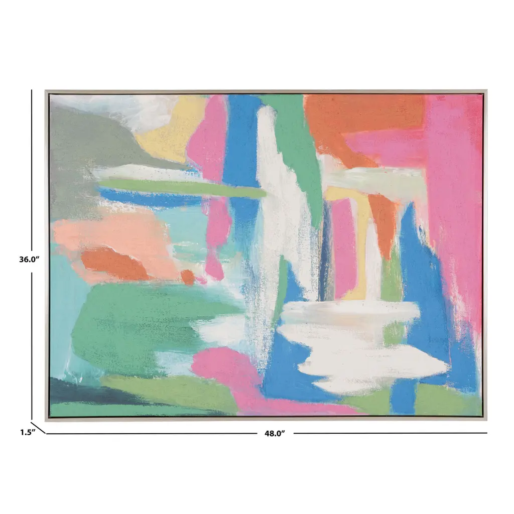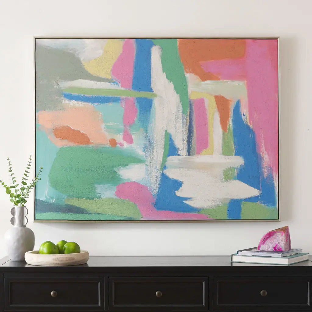 A study in artful abstraction, this large-scale wall art is destined to be the focal point in any space. Showcasing an array of hues from pastel green and cream to richly pigmented pink and orange, it brightens any space with mood-boosting color. Printed on linen fabric and framed in gold, the meaning behind this mesmerizing artwork is up to the interpretation of each viewer.