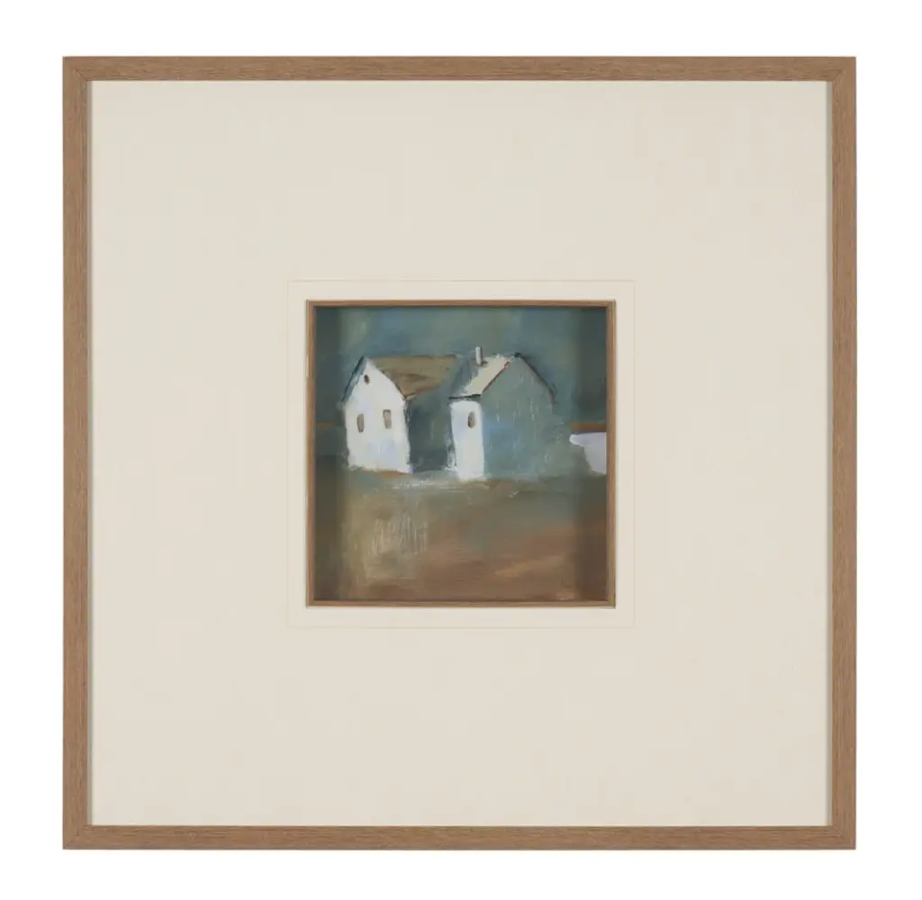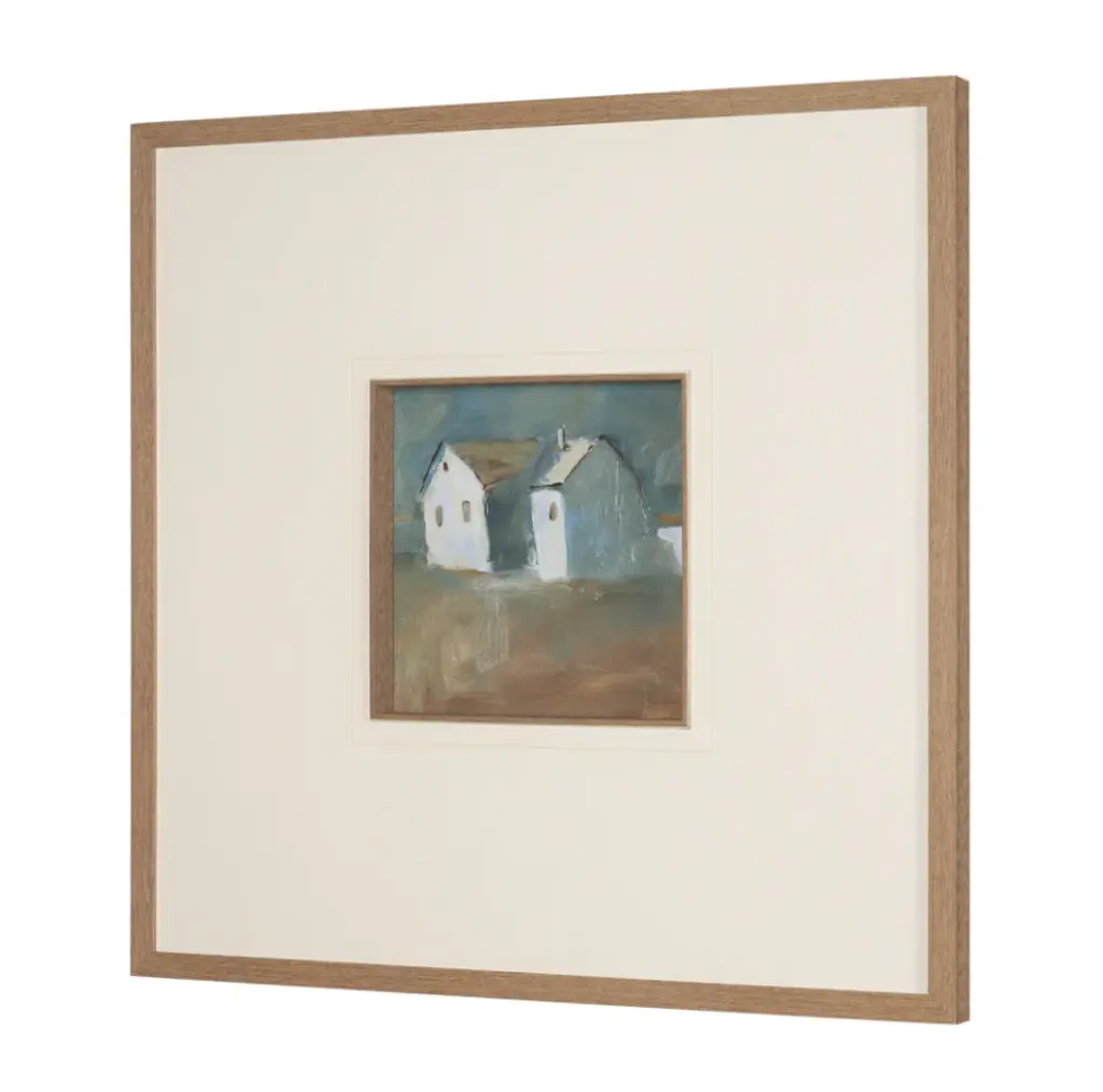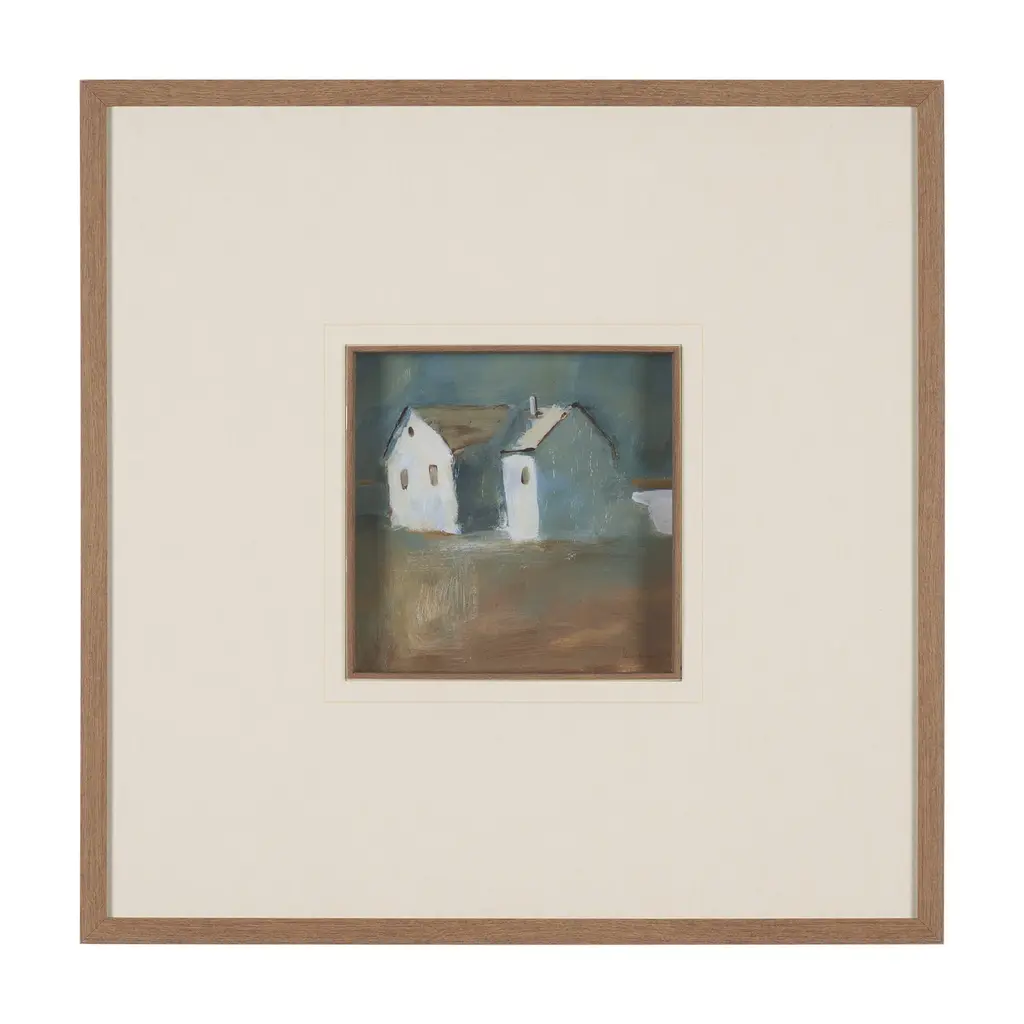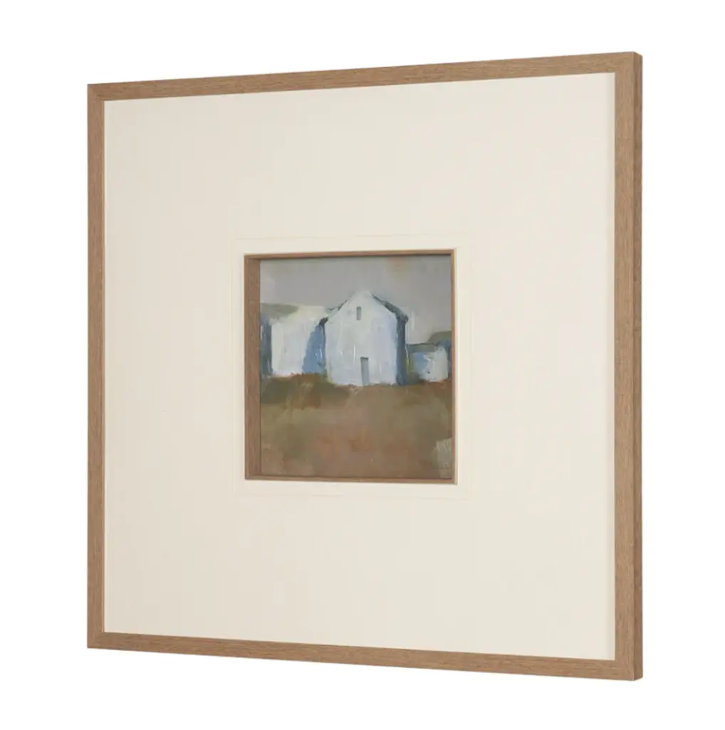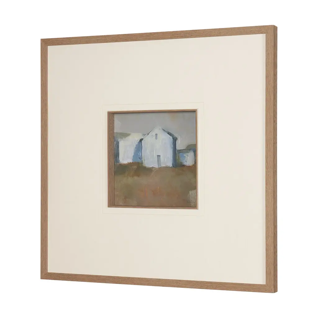 This print by artist Silvia Krause features her artwork, elegantly matted under glass and framed. The painting features a soft, minimalist rendering of a rural building, enriched with hand-applied textures that bring subtle depth and dimension.