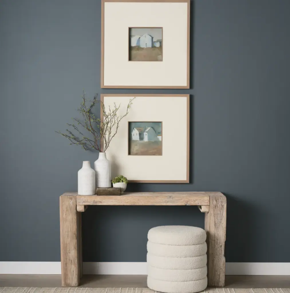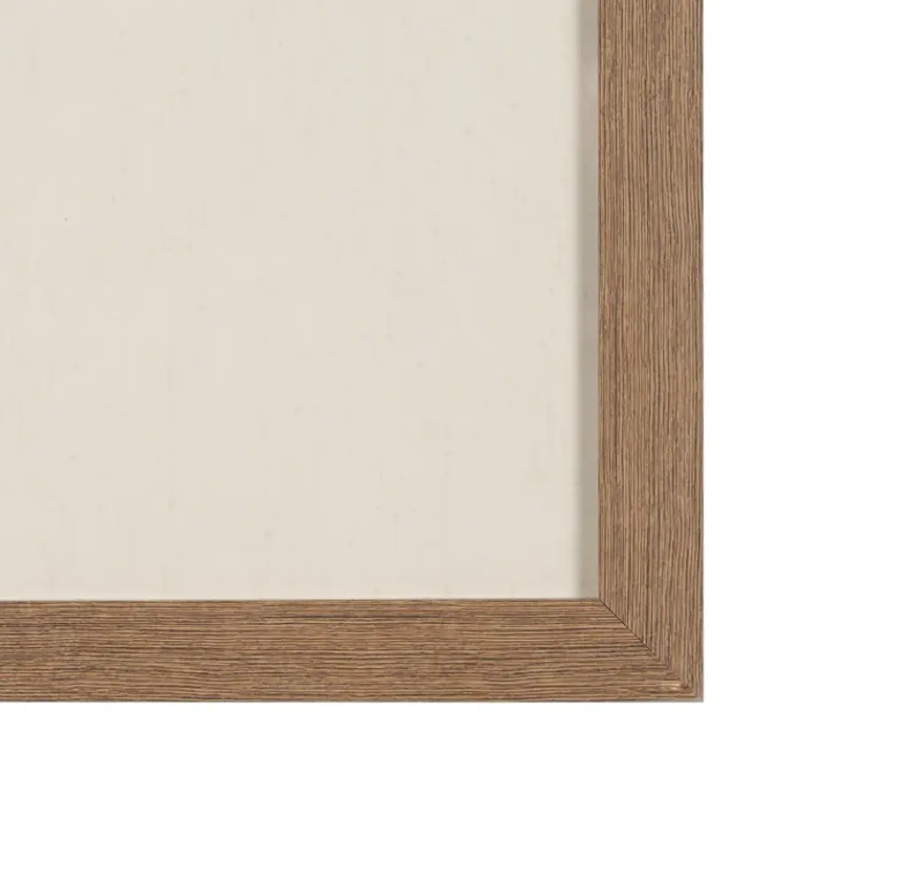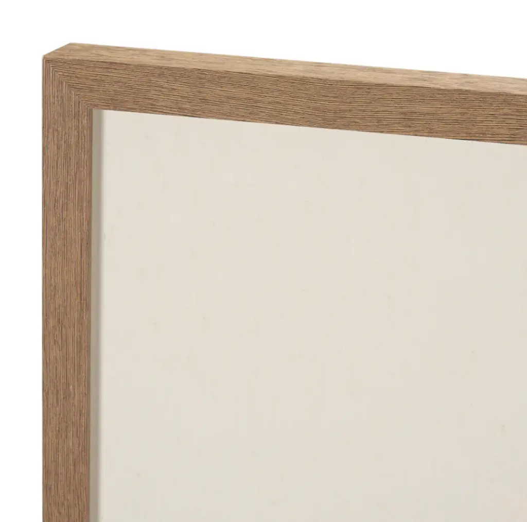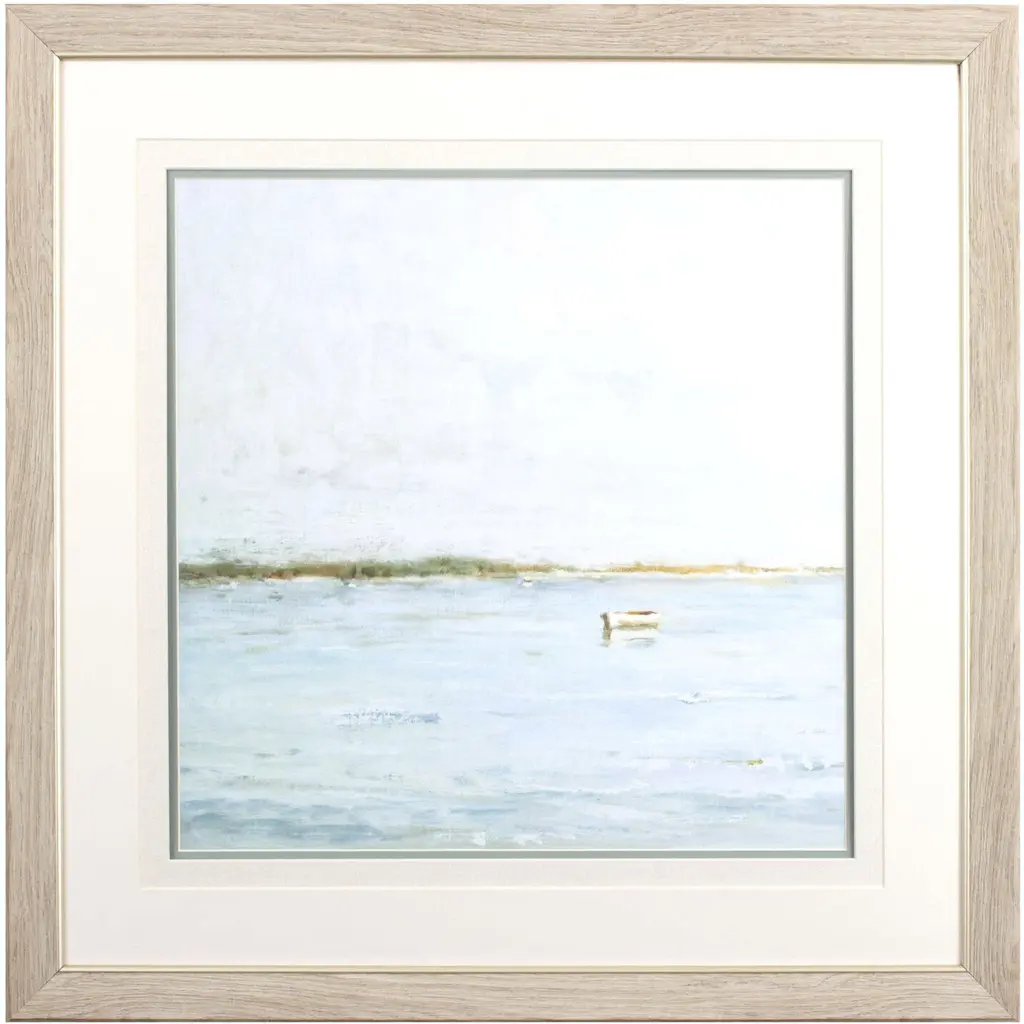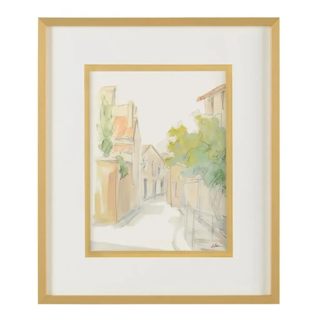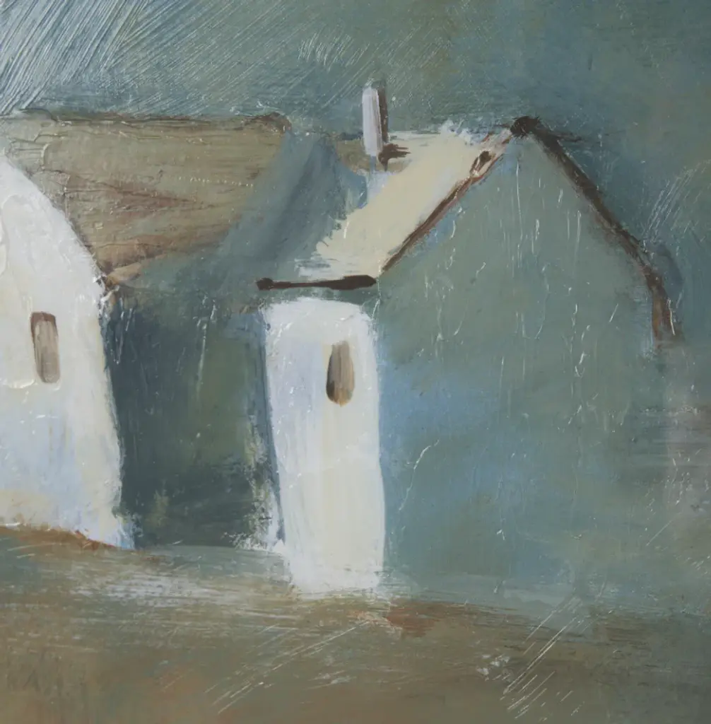 This print by artist Silvia Krause features her artwork, elegantly matted under glass and framed. The painting features a soft, minimalist rendering of a rural building, enriched with hand-applied textures that bring subtle depth and dimension.