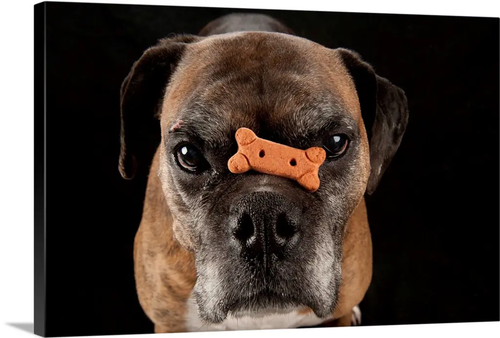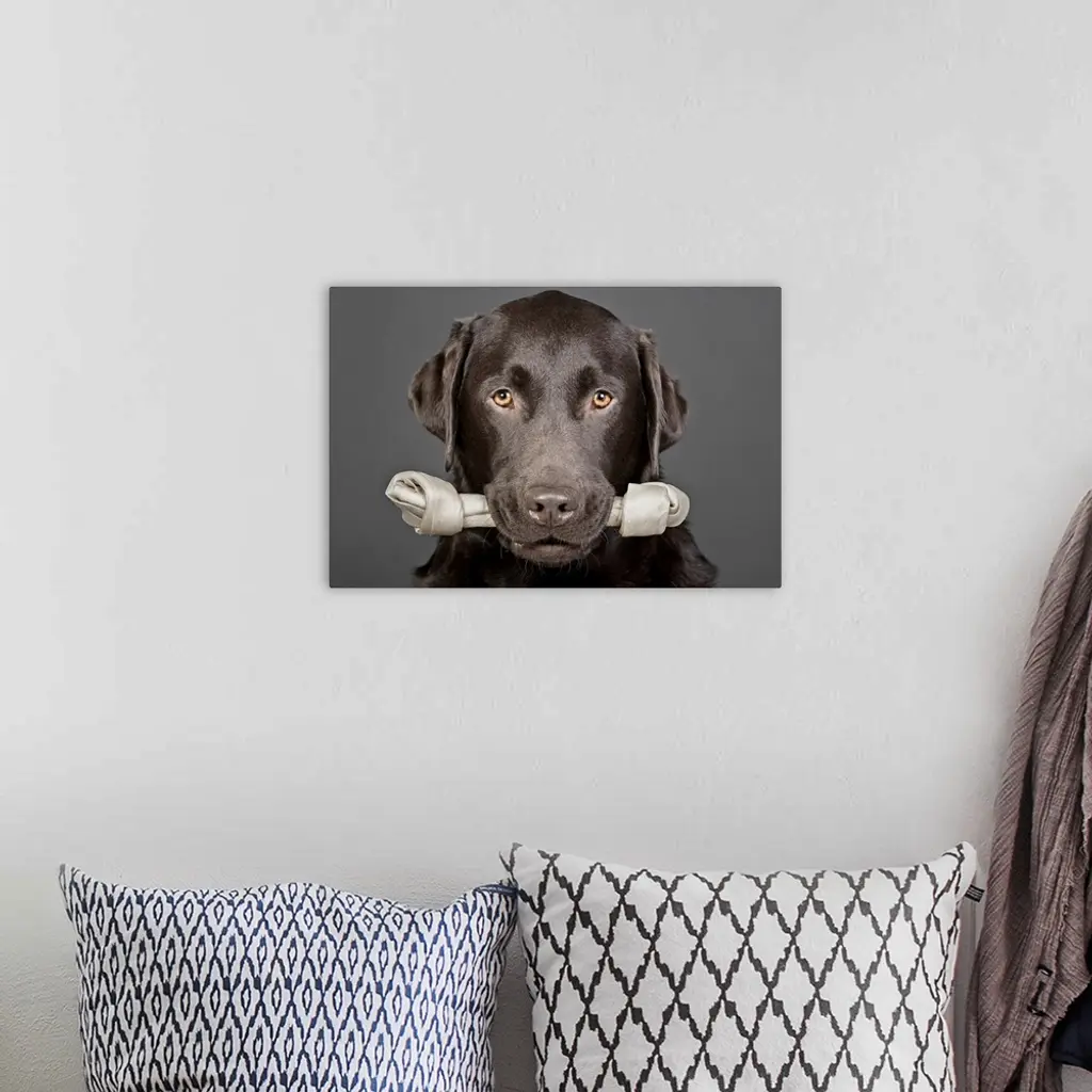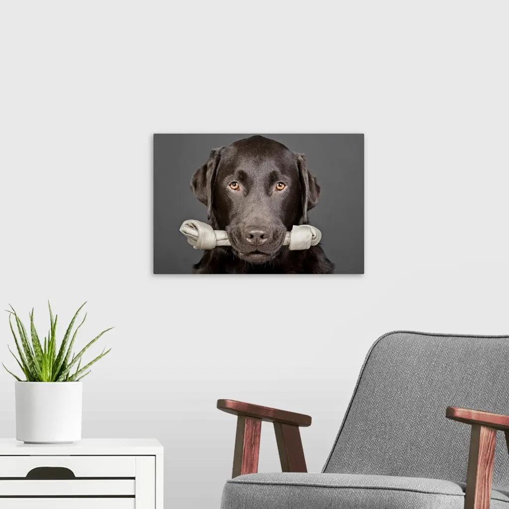 Studio Portrait Of Chocolate Labrador Carrying Bone In Mouth
