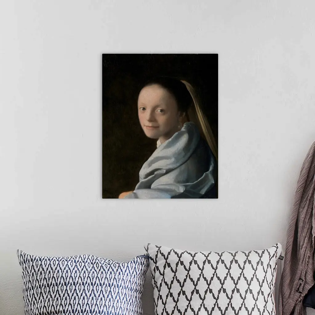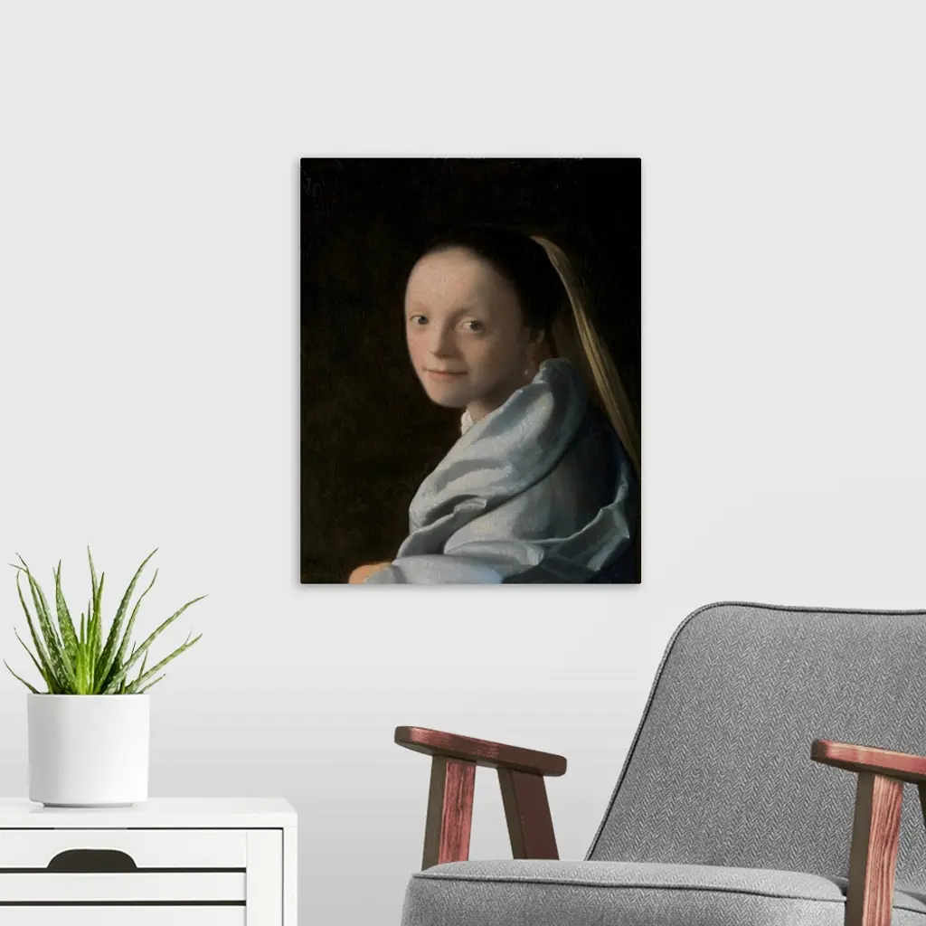 This may be one of the three paintings by Vermeer that were described in an Amsterdam auction of 1696 as A 'face' in an antique dress, uncommonly artful. Although a live model must have been employed, the artist's goal was not portraiture but a study of character and expression. Dutch pictures of this type, called tronies, often feature curious costumes and artistic effects, such as the fall of light on fine fabrics, soft skin, or a pearl earring.