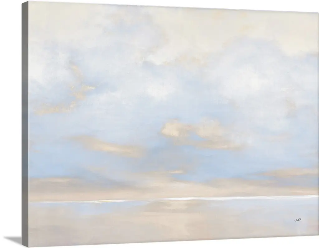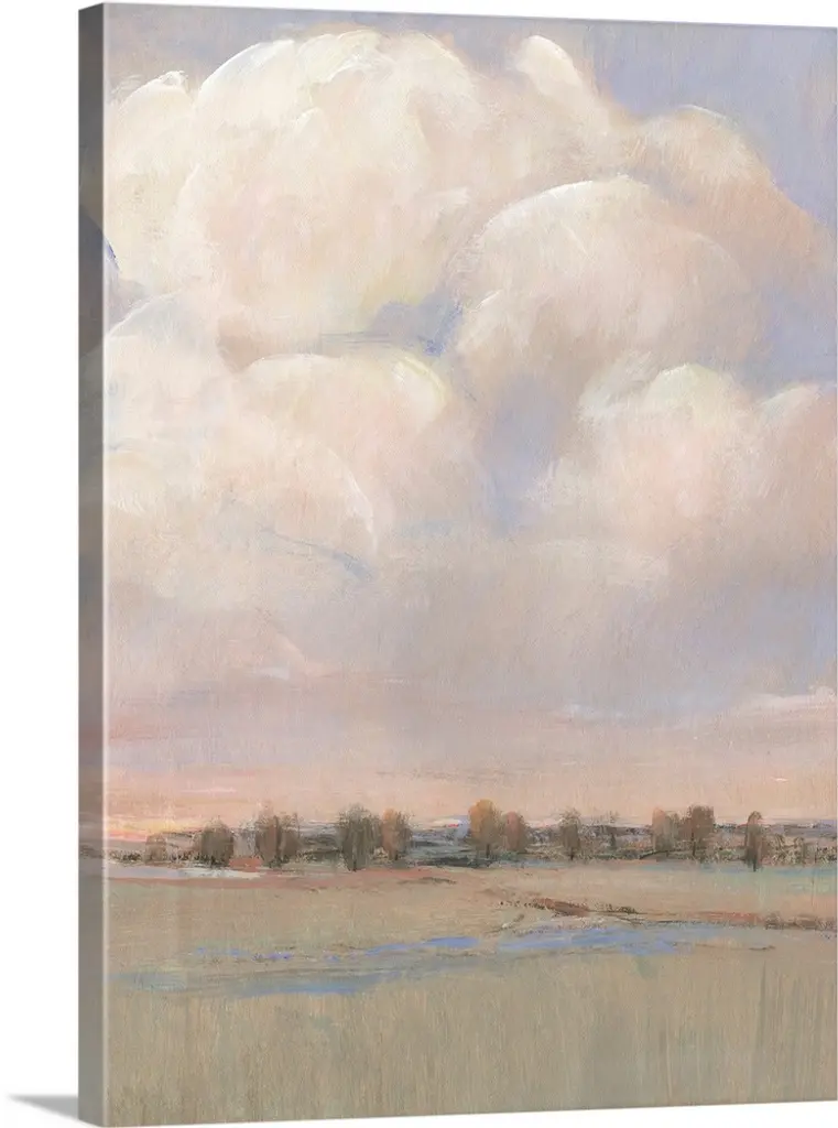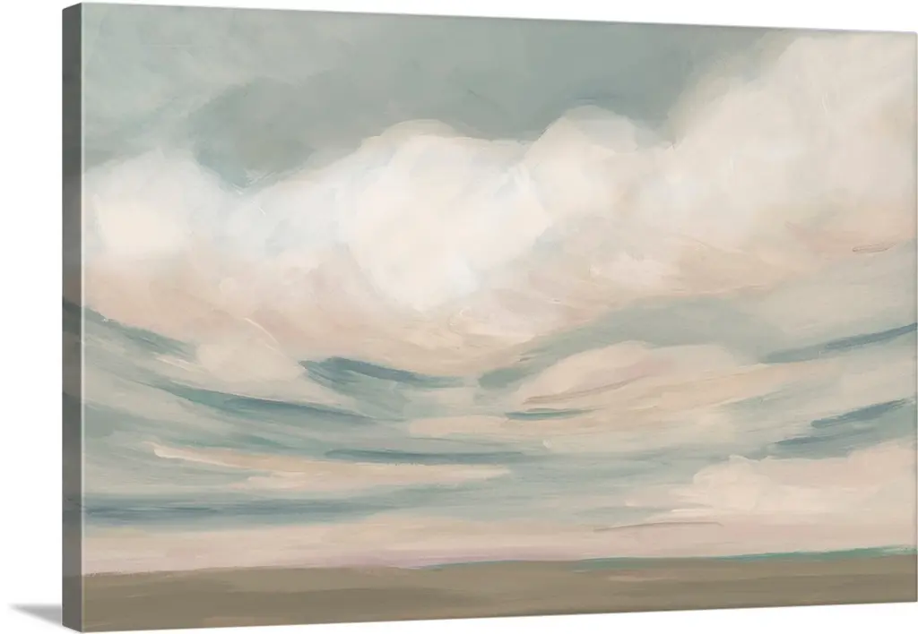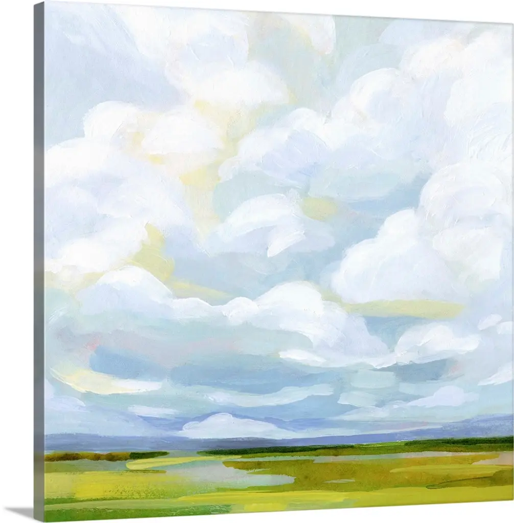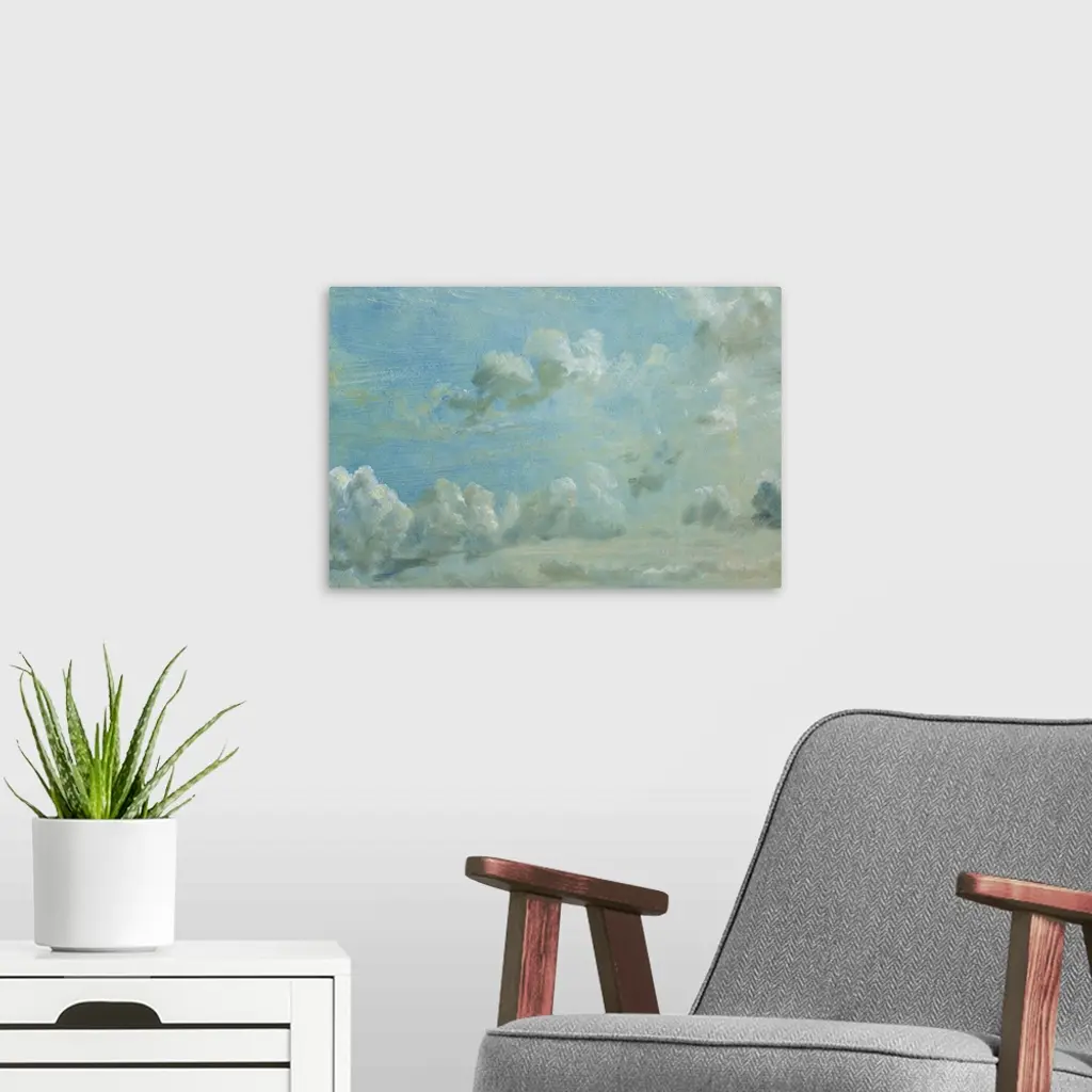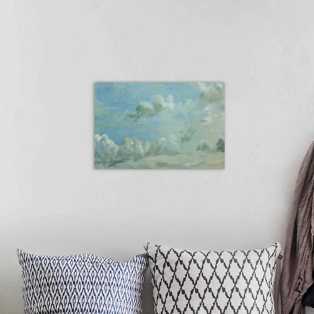 Horizontal painting on a large wall hanging of a light blue sky full of small fluffy clouds, the image has the textured brushstrokes of oil paints.