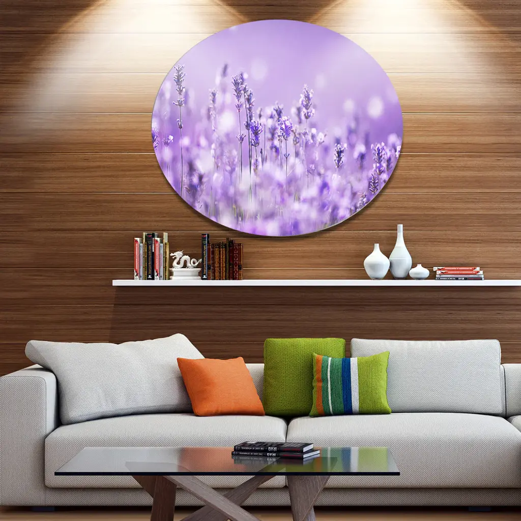 Bring Contemporary Abstraction to your home with this large Circle Metal wall art. This Stunning Purple Lavender Field Metal Artwork makes it the focal point of any room or office. - White Gloss Coating ensures colors are extra vibrant with light reflection.- Aluminum grade Sheet Metal with 1 inch mounting frame on the back giving the illusion that the artwork is floating on the wall..- Mounting Brackets are included along with instructions.- High Quality Digital images are created directly into a glossy aluminum panel producing a stunning and captivating print into the glossy finish of the metal.- Water, Fire and Scratch resistant HD Aluminum panels.- Looks better than any photo paper and guaranteed to last at least 20 years- Easy to clean with a microfiber cloth. Colors are far superior to regular Canvas Art. - Easy to Hang