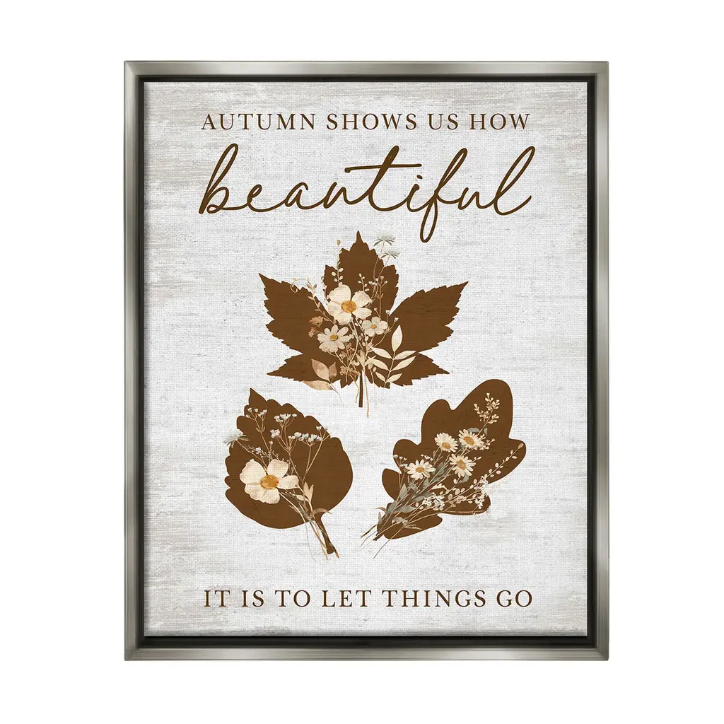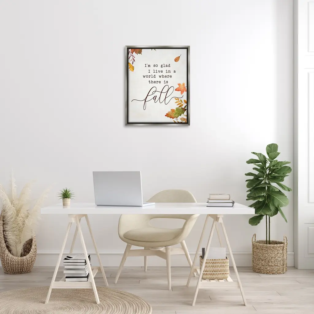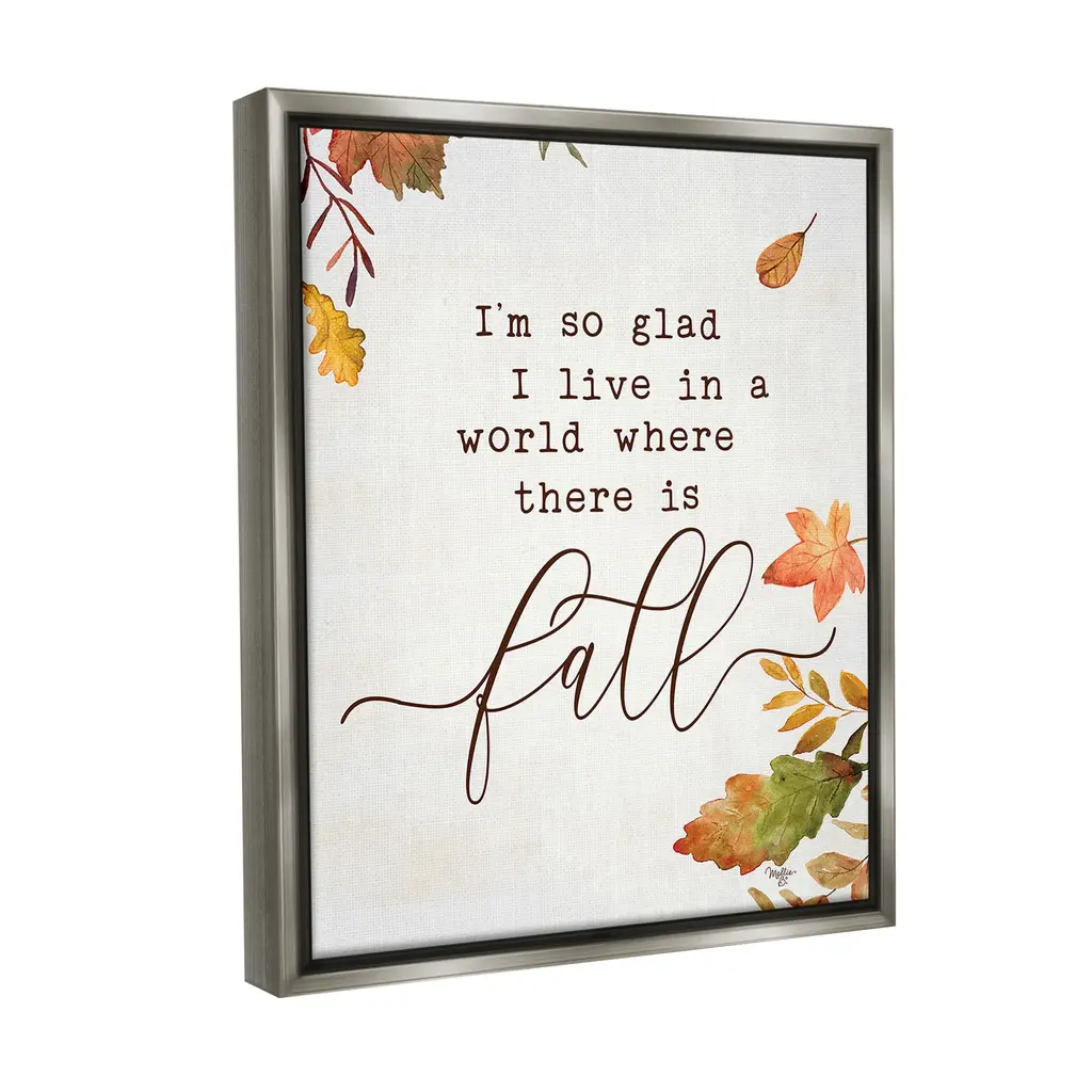 Elevate your home or office to the next level with Stupell Framed Floating Canvas Wall Art. Our premium hand-stretched canvas is mounted securely into a sturdy lightweight frame. The museum-style gap between the wrapped canvas and the box frame gives the illusion of floating artwork. Stupell Wall Art is made in the USA.Features: Dimensions: 17 x 1.7 x 21 Frame, 16 x 1.5 x 20 Canvas ArtFloating Frame Canvas Products are available in sizes 17"x21" and 25"x31". All Floating Frame Canvas Products have a 1.7" Depth.Wall Art is Ready to Hang with Hardware Free Hanging. No Installation required. For Easy Set Up Lean or Layer Artwork on Shelf or Against Wall. Artwork is Permently Fixed into the Frame.Our elevated 1.7" Thick Floating Frame is the perfect complement to our canvas style Wall Art. We use only the highest quality inks in house with industry leading printing solutions. Canvas is hand stretched over a durable wood foundation and then mounted securly into a Modern Box Frame. Made in the USA.Artwork Relates To: Plant, Leaf, Botanical, Foliage, Fall, Autumn, I'm so Glad I live in a World Where There is FallDesign by Mollie B.