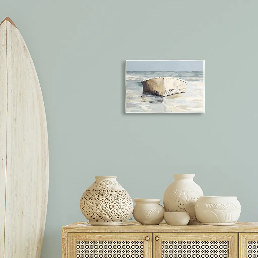 Our wall plaques start as high-quality lithograph prints mounted on durable 0.5-inch thick MDF wood. Each piece is hand finished and comes with a fresh layer of white foil on the sides to give it a crisp, clean look. Plaques arrive ready to hang without installation and come with removable plastic corners to keep them from damage in transit. Stupell Wall Art is made in the USA.Features: Dimensions: 15 x 0.5 x 10 InchesWall Plaque Product Sizes Include 15"x10" and 19"x13". All wall plaque products have a 0.5" Depth. Wall Art is Ready to Hang with Hardware Free Hanging. No installation required. For Easy Set Up Lean or Layer Artwork on Shelf or Against Wall.All of our wall plaques start off as high quality lithograph prints that are then mounted on durable 0.5 inch thick MDF wood. Each piece is hand finished and comes with a fresh layer of foil on the sides to give it a crisp clean look. Made In USA.Artwork Relates To: Boat, Dinghy, Watercraft, Nature, Sea, Water, Shoreline, Coastal, BeachDesign by Patricia Pinto