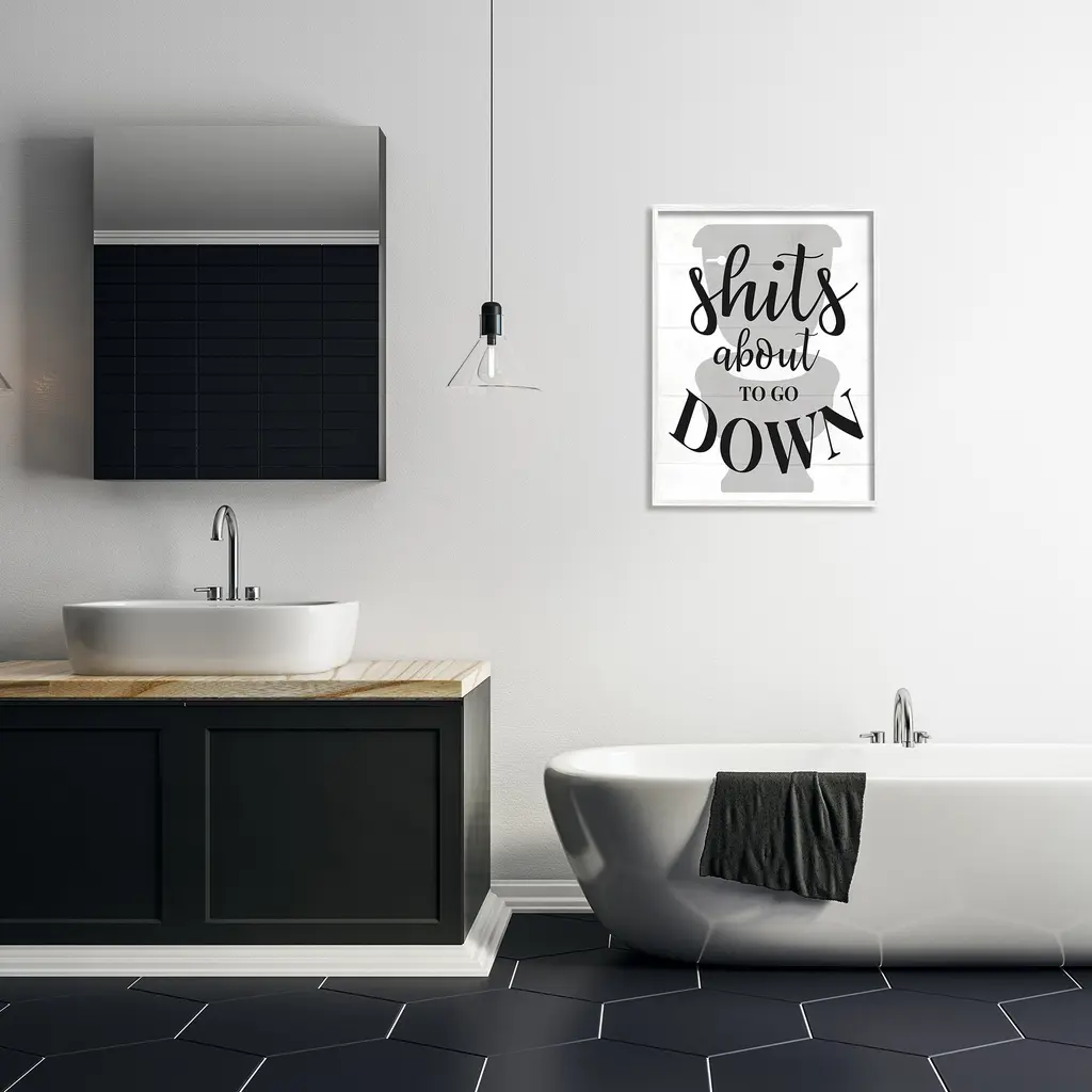 Stupell About To Go Down Funny Bathroom Family Home Word Design Framed Wall Art, Design By Artist Daphne Polselli - Grey - 24 X 30 - White