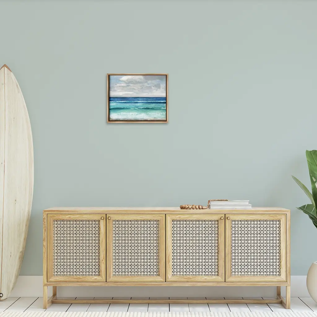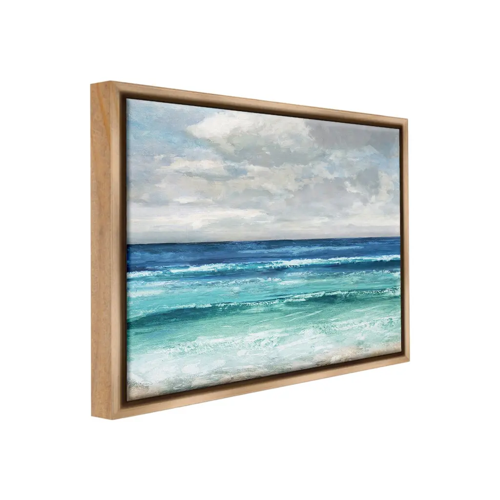 Elevate your home or office to the next level with Stupell Framed Floating Canvas Wall Art. Our premium hand-stretched canvas is mounted securely into a sturdy lightweight frame. The museum-style gap between the wrapped canvas and the box frame gives the illusion of floating artwork. Stupell Wall Art is made in the USA.Features: Dimensions: 21 x 1.7 x 17 Frame, 20 x 1.5 x 16 Canvas ArtFloating Frame Canvas Products are available in sizes 21"x17" and 31"x25". All Floating Frame Canvas Products have a 1.7" Depth.Wall Art is Ready to Hang with Hardware Free Hanging. No Installation required. For Easy Set Up Lean or Layer Artwork on Shelf or Against Wall. Artwork is Permently Fixed into the Frame.Our elevated 1.7" Thick Floating Frame is the perfect complement to our canvas style Wall Art. We use only the highest quality inks in house with industry leading printing solutions. Canvas is hand stretched over a durable wood foundation and then mounted securly into a Modern Box Frame. Made in the USA.Artwork Relates To: Sky, Sea, Water, Horizon, Beach, Coast, Shoreline, Landscape, Summer, CloudsDesign by Amber Sterling