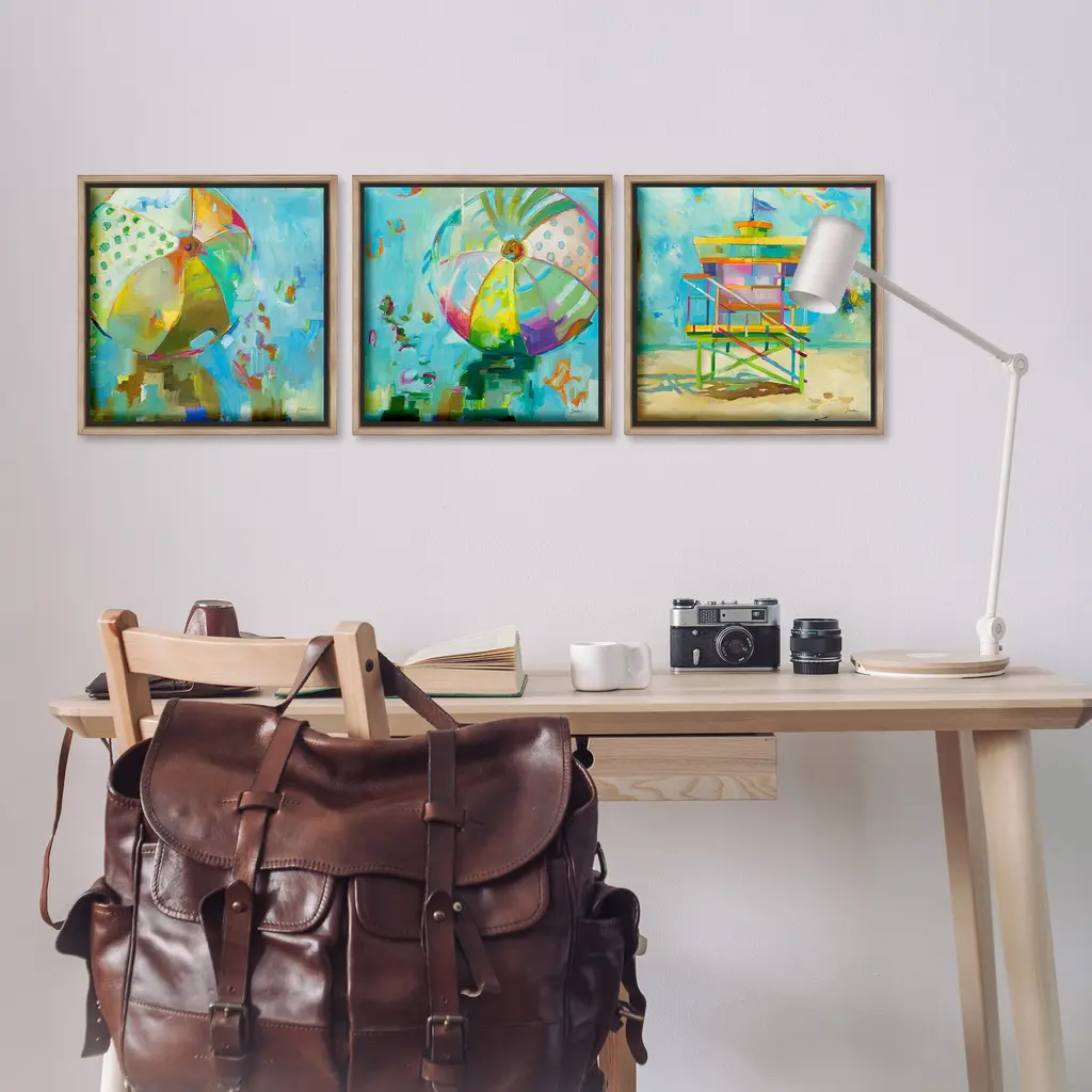 Elevate your home or office to the next level with Stupell Framed Floating Canvas Wall Art. Our premium hand-stretched canvas is mounted securely into a sturdy lightweight frame. The museum-style gap between the wrapped canvas and the box frame gives the illusion of floating artwork. Stupell Wall Art is made in the USA.Features: Dimensions: 3 Piece Set, Each Frame is 18 x 1.7 x 18Three Piece Floating Frame Canvas Products are available as 18"x18" or 25"x25" Panels. All Floating Frame Canvas Products have a 1.7" Depth.Wall Art is Ready to Hang with Hardware Free Hanging. No Installation required. For Easy Set Up Lean or Layer Artwork on Shelf or Against Wall. Artwork is Permently Fixed into the Frame.Our elevated 1.7" Thick Floating Frame is the perfect complement to our canvas style Wall Art. We use only the highest quality inks in house with industry leading printing solutions. Canvas is hand stretched over a durable wood foundation and then mounted securly into a Modern Box Frame. Made in the USA.Artwork Relates To: Modern, Painting, Abstract, Beach, Pattern, Summer, Landscape, Beach BallDesign by Liz Jardine